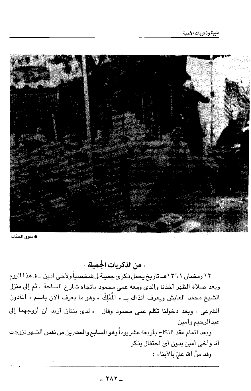 13رمضان 1361هـ تاريخ يحمل ذكرى جميلة إلى شخصياً ولأخي أمين - في هذا اليوم وبعد صلاة الظهر أخذنا والدي ومعه عمي محمود باتجاه شارع الساحة، ثم إلى منزل الشيخ محمد العايش ويعرف آنذاك بـ ((المُلْكْ)) وهو ما يعرف الآن باسم ((المأذون الشرعي)) وبعد دخولنا تكلم عمي محمود وقال: ((لدى بنتان أريد أن أزوجهما إلى عبد الرحيم وأمين.