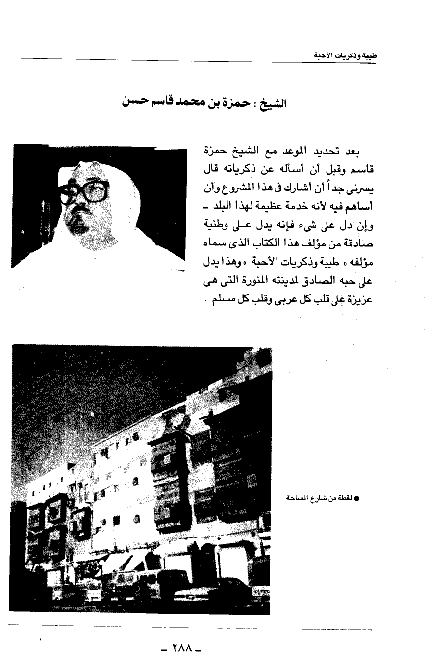 بعد تحديد الموعد مع الشيخ حمزة قاسم وقبل أن أسأله عن ذكرياته قال يسرني جداً أن أشارك في هذا المشروع وأن أساهم فيه لأنه خدمة عظيمة لهذا البلد - وإن دل على شيء فإنه يدل على وطنية صادقة من مؤلف هذا الكتاب الذي سماه مؤلفه ((طيبة وذكريات الأحبة)) وهذا يدل على حبه الصادق لمدينته المنورة التي هي عزيزة على قلب كل عربي وقلب كل مسلم.