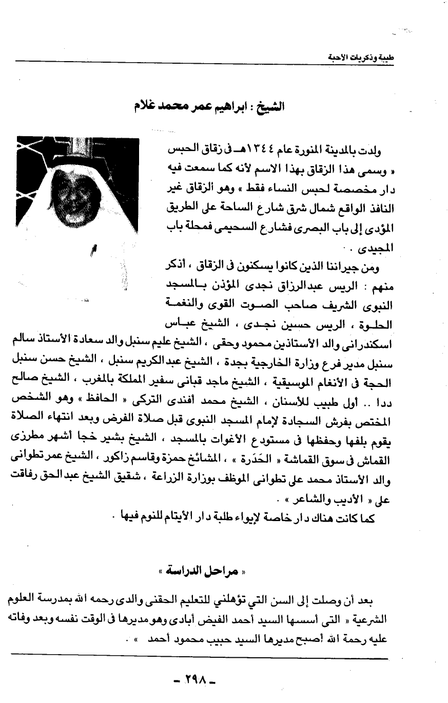 الريس عبد الرزاق نجدي المؤذن بالمسجد النبوي الشريف صاحب الصوت القوي والنغمة الحلوة، الريس حسين نجدي، الشيخ عباس اسكندراني والد الأستاذين محمود وحقي، الشيخ عليم سنبل والد سعادة الأستاذ سالم سنبل مدير فرع وزارة الخارجية بجدة، الشيخ عبد الكريم سنبل، الشيخ حسن سنبل الحجة في الأنغام الموسيقية، الشيخ ماجد قباني سفير المملكة بالمغرب، الشيخ صالح ددا .. أول طبيب للأسنان، الشيخ محمد أفندي التركي ((الحافظ)) وهو الشخص المختص بفرش السجادة لإمام المسجد النبوي قبل صلاة الفرض وبعد انتهاء الصلاة يقوم بلفها وحفظها في مستودع الأغوات بالمسجد، الشيخ بشير خجا أشهر مطرزي القماش في سوق القماشة ((الحَدَرة)) المشائخ حمزة وقاسم زاكور، الشيخ عمر تطواني والد الأستاذ محمد علي تطواني الموظف بوزارة الزراعة، شقيق الشيخ عبد الحق رفاقت علي ((الأديب والشاعر)) كما كانت هناك دار خاصة لإيواء طلبة دار الأيتام للنوم فيها.