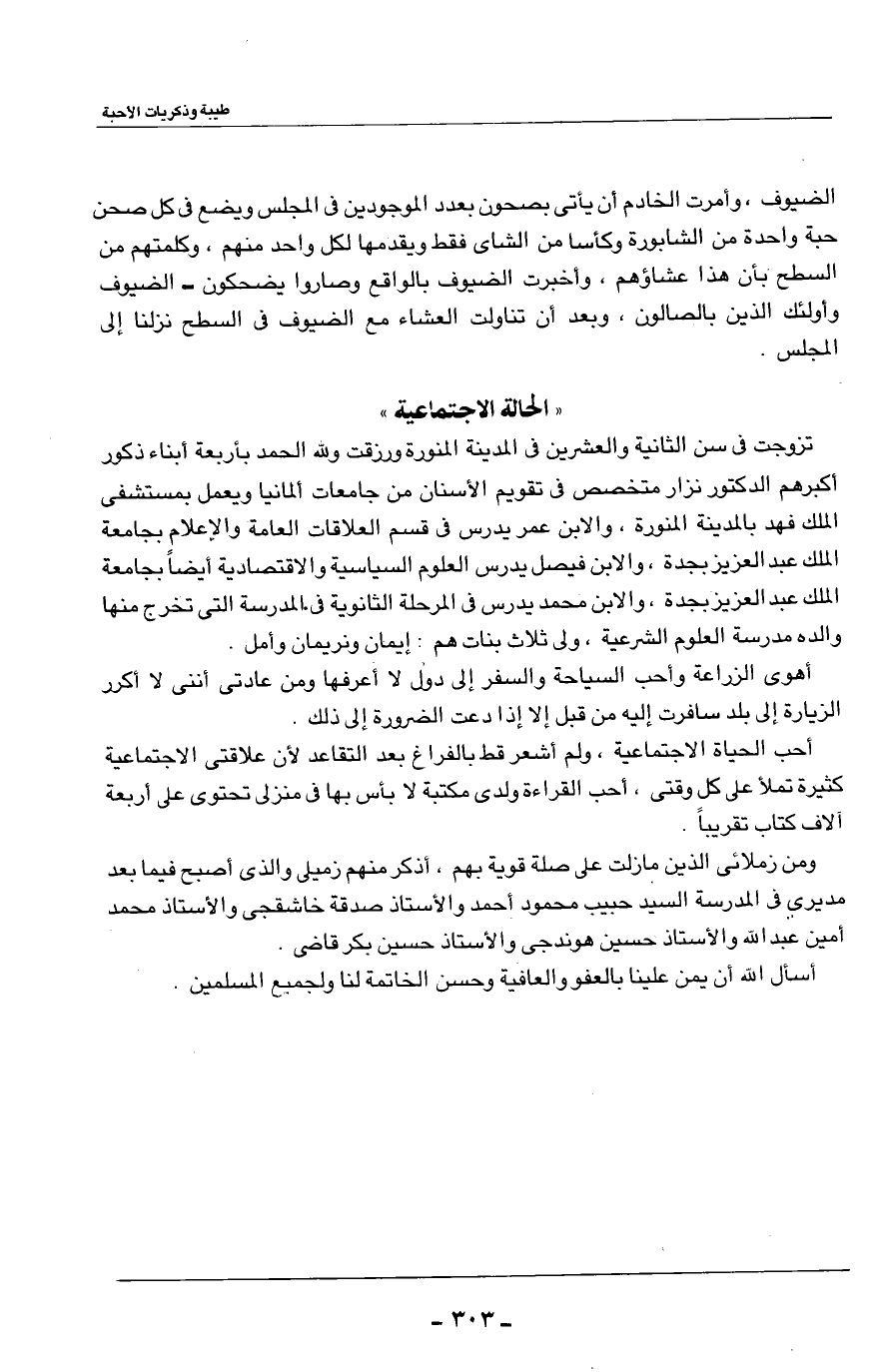 الضيوف، وأمرت الخادم أن يأتي بصحون بعدد الموجودين في المجلس ويضع في كل صحن حبة واحد من الشابورة وكأساً من الشاي فقط ويقدمها لكل واحد منهم، وكلمتهم من السطح بأن هذا عشاؤهم، وأخبرت الضيوف بالواقع وصاروا يضحكون - الضيوف وأولئك الذين بالصالون، وبعد أن تناولت العشاء مع الضيوف في السطح نزلنا إلى المجلس.