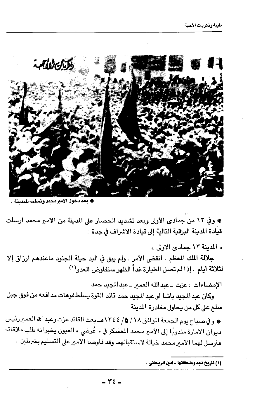 * وفي 13 من جمادى الأولى وبعد تشديد الحصار على المدينة من الامير محمد ارسلت قيادة المدينة البرقية التالية الاشراف في جدة: ((المدينة 13 جمادى الأولى)) جلالة الملك المعظم. انقضى الأمر.
