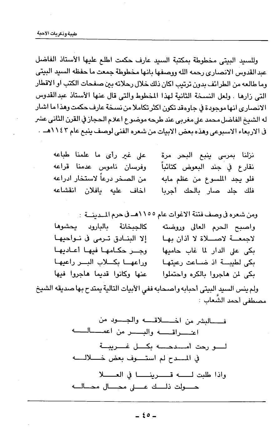 ولعل النسخة الثانية لهذا المخطوط والتي قال عنها الأستاذ عبد القدوس الأنصاري انها موجودة في جاوه قد تكون اكثر تكاملاً من نسخة عارف حكمت وهذا ما اشار له الشيخ الفاضل محمد علي مغربي عند طرحه موضوع اعلام الحجاز في القرن الثاني عشر في الاربعاء الاسبوعي وهذه بعض الابيات من شعره الفني لوصف ينبع عام 1143هـ.