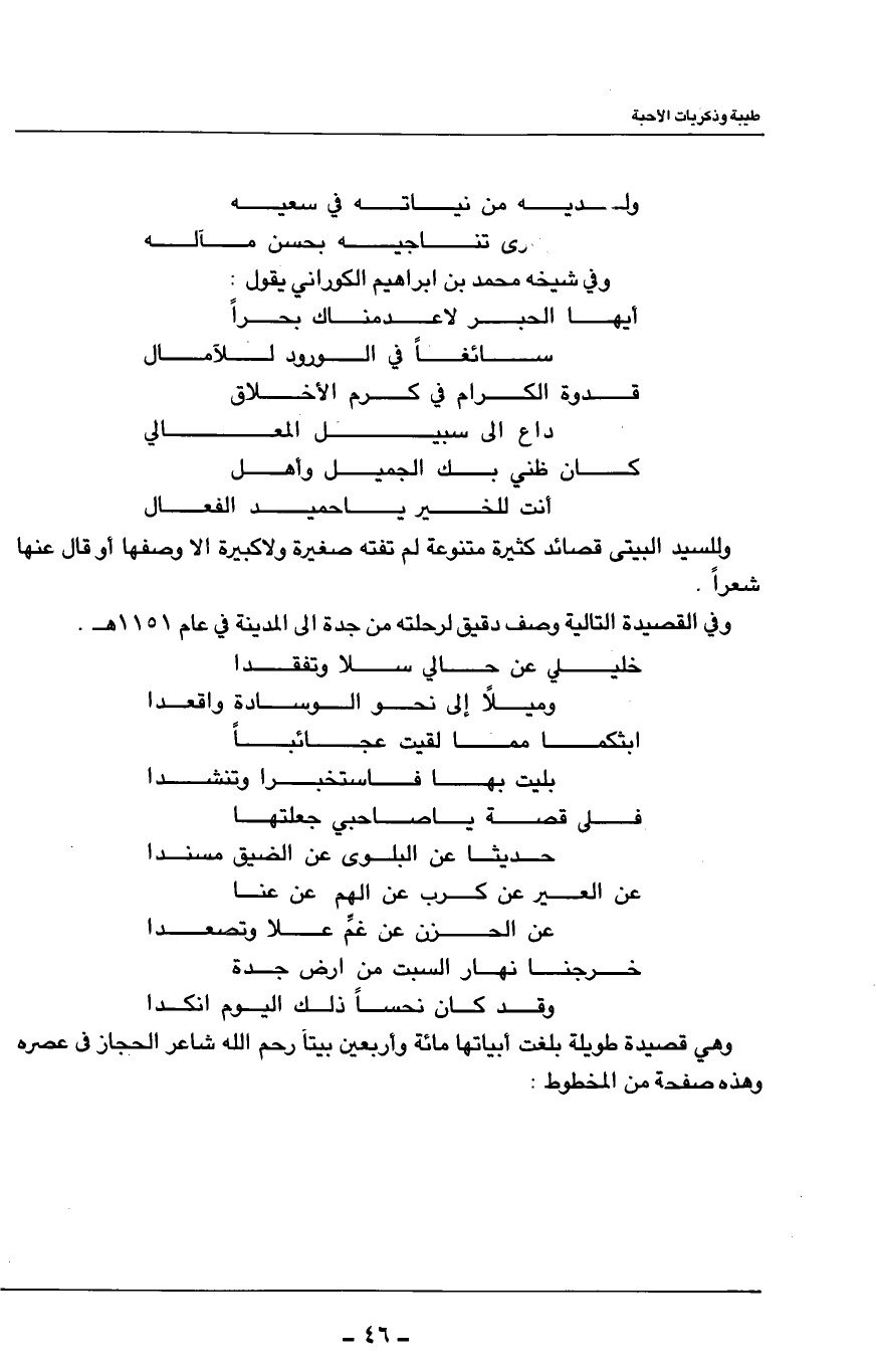 وفي القصيدة التالية وصف دقيق لرحلته من جدة إلى المدينة في عام 1151هـ.