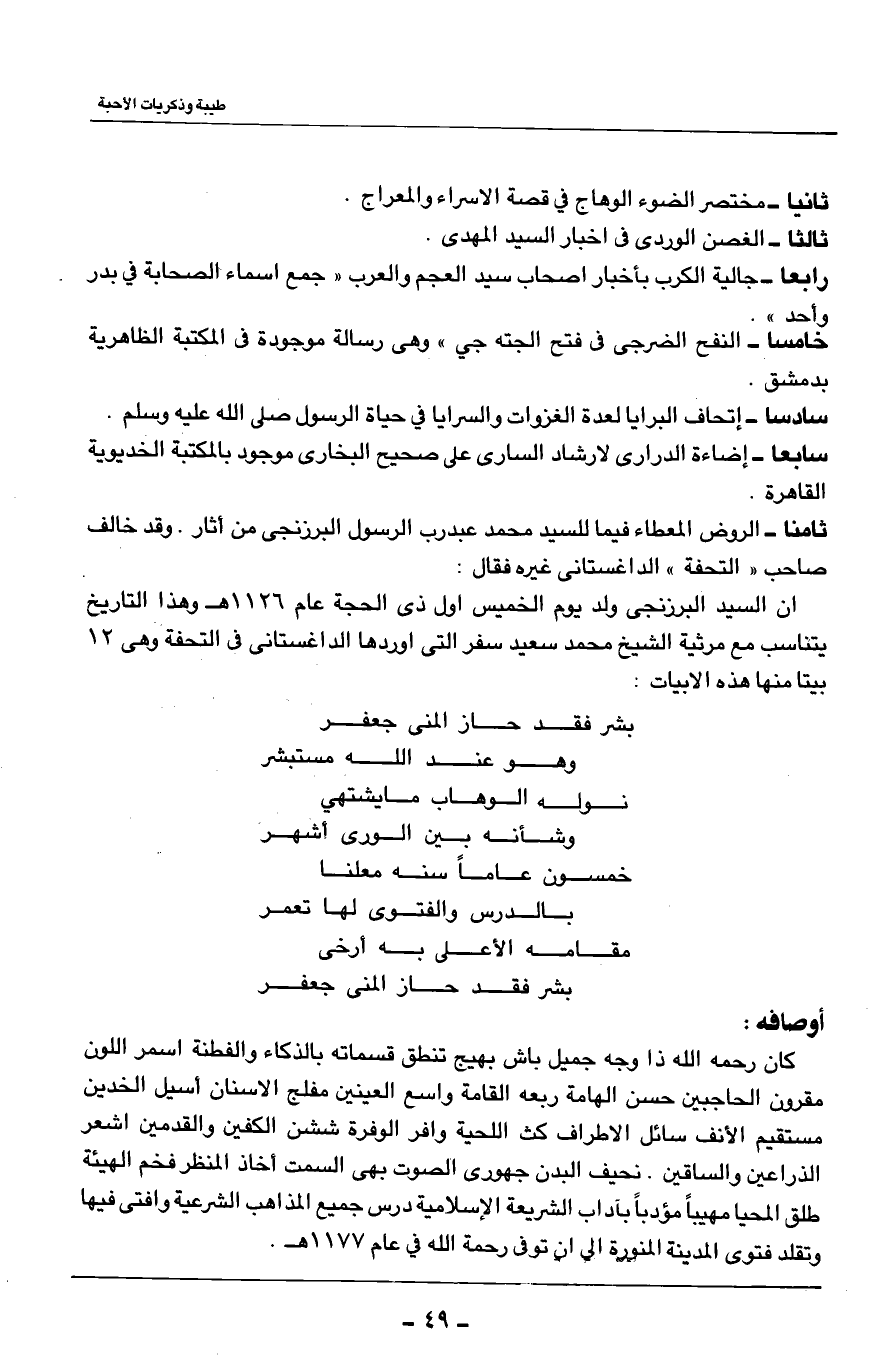 ان السيد البرزنجى ولد يوم الخميس اول ذي الحجة عام 1126 هـ وهذا التاريخ يتناسب مع مرثية الشيخ محمد سعيد سفر التى اوردها الداغستاني في التحفة وهى 12 بيتا منها هذه الابيات: