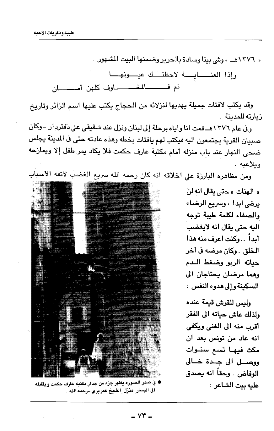 وفي عام 1376هـ قمت انا واياه برحلة إلى لبنان ونزل عند شقيقي علي دفردار - وكان صبيان القرية يجتمعون اليه فيكتب لهم يافتات بخطه وهذه عادته حتى في المدينة يجلس ضحى النهار عند باب منزله أمام مكتبة عارف حكمت فلا يكاد يمر طفل إلا ويمازحه ويلاعبه.