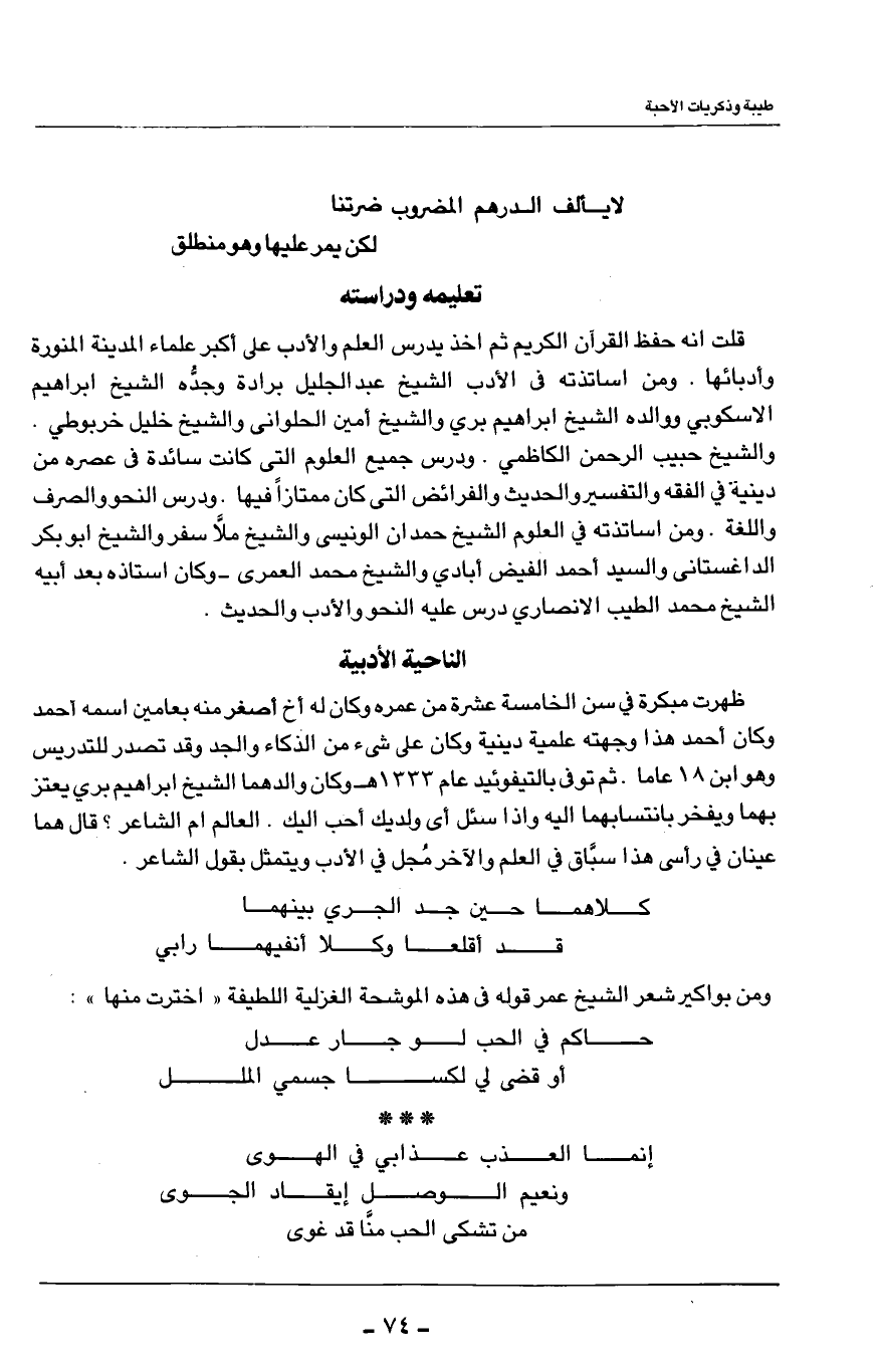 قلت انه حفظ القرآن الكريم ثم يدرس العلم والأدب على أكبر علماء المدينة المنورة وأدبائها.