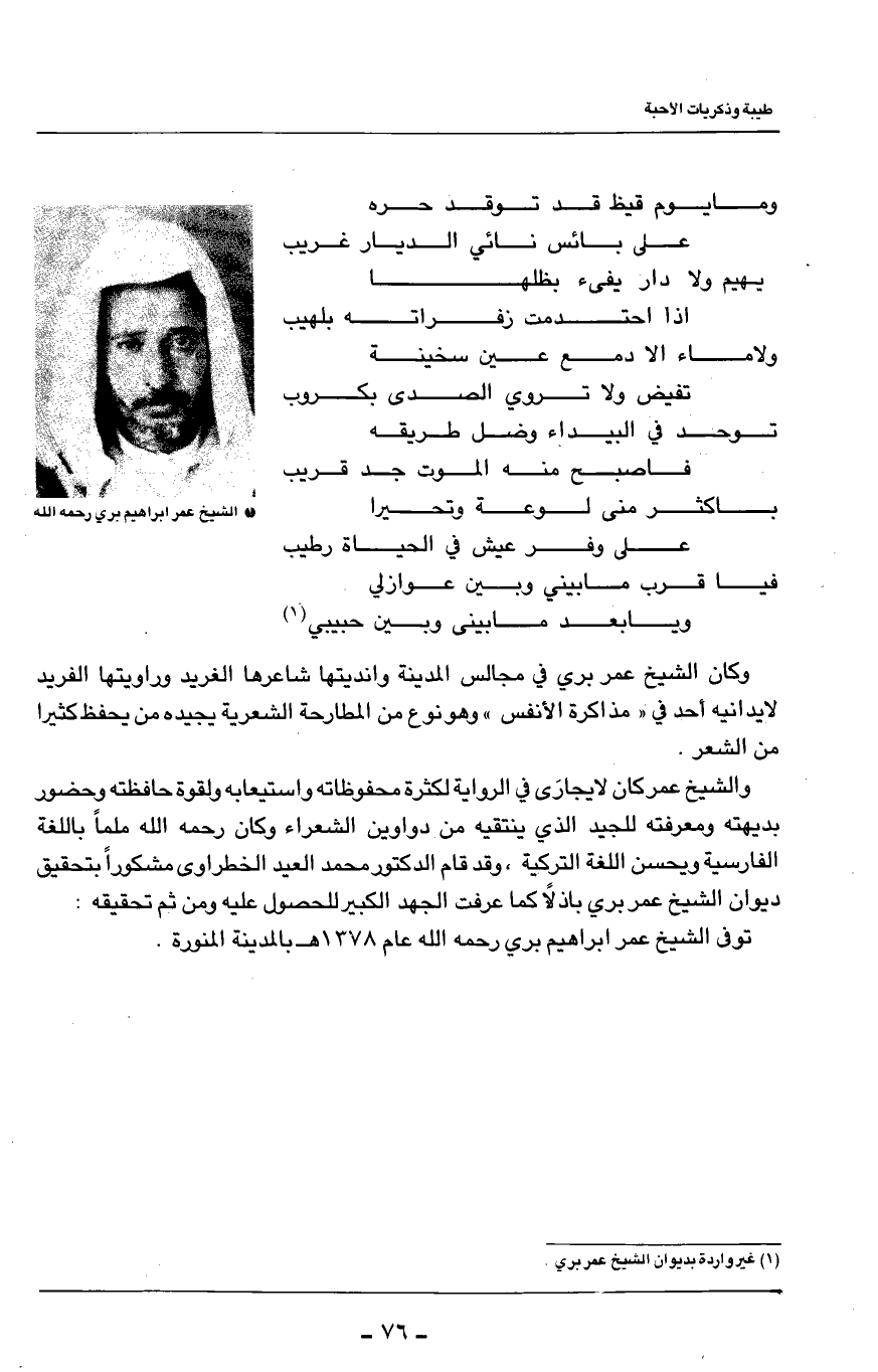 وكان الشيخ عمر بري في مجالس المدينة وانديتها شاعرها الغريد وروايتها الفريد لايدانيه أحد في ((مذاكرة الأنفس))