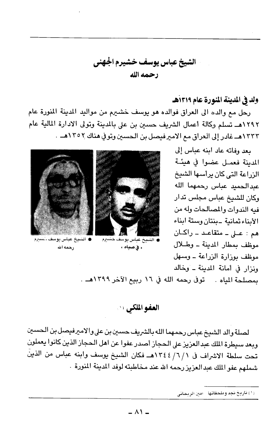 لصلة والد الشيخ عباس رحمهما الله بالشريف حسين بن علي والامير فيصل بن الحسين وبعد سيطرة الملك عبد العزيز علي الحجار أصدر عفواً عن أهل الحجاز الذين كانوا يعملون تحت سلطة الاشراف في 1344/ 6/1هـ فكان الشيخ يوسف وابنه عباس من الذين شملهم عفو الملك عبد العزيز رحمه الله عند مخاطبته لوفد المدينة المنورة.