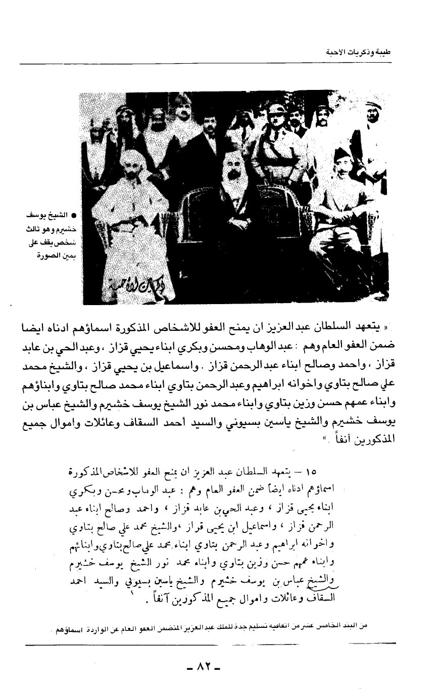 وإسماعيل بن يحيى قزاز، والشيخ محمد علي صالح بتاوي واخوانه إبراهيم وعبد الرحمن بتاوي ابناء محمد صالح بتاوي وابناؤهم وابناء عمهم حسن وزين بتاوي وابناء محمد نور الشيخ يوسف خشيرم والشيخ عباس بن يوسف خشيرم والشيخ ياسين بسيوني والسيد أحمد السقاف وعائلات واموال جميع المذكورين أنفاً)).