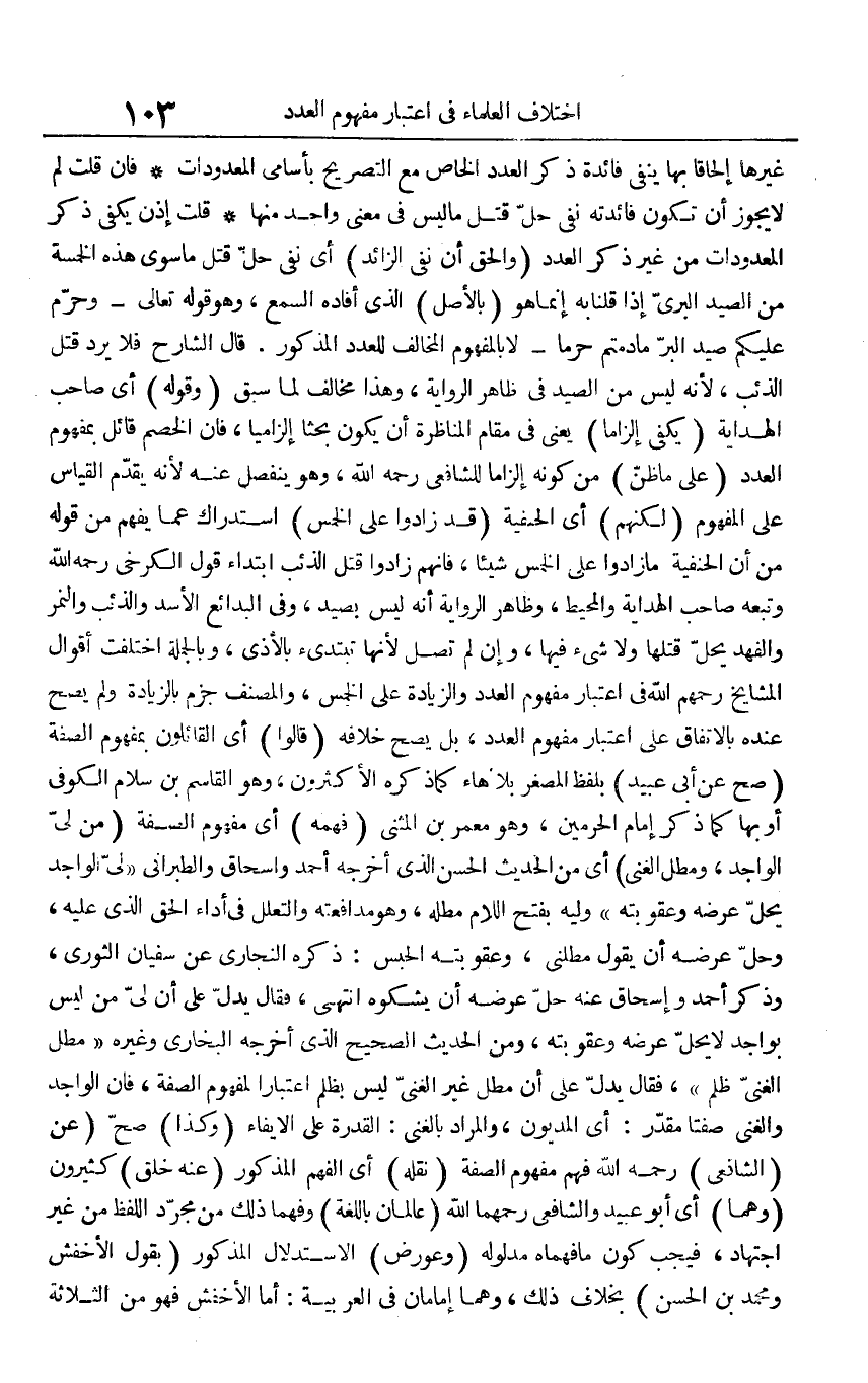 غيرها إلحاقا بها ينفي فائدة ذكر العدد الخاص مع التصريح بأسامي المعدودات. فإن قلت لم لا يجوز أن تكون فائدته نفي حل قتل ما ليس في معنى واحد منها. قلت: إذن يكفي ذكر المعدودات من غير ذكر العدد (والحق أن نفي الزائد) أي نفي حل قتل ما سوى هذه الخمسة من الصيد البري إذا قلنا به إنما هو (بالأصل) الذي أفاده السمع، وهو قوله تعالى -وحرم عليكم صيد البر ما دمتم حرما- لا بالمفهوم المخالف للعدد المذكور. قال الشارح فلا يرد قتل الذئب، لأنه ليس من الصيد في ظاهر الرواية، وهذا مخالف لما سبق (وقوله) أي صاحب الهداية (يكفي إلزاما) يعني في مقام المناظرة أن يكون بحثا إلزاميا، فإن الخصم قائل بمفهوم العدد (على ما ظن) من كونه إلزاما للشافعي رحمه الله، وهو ينفصل عنه لأنه يقدم القياس على المفهوم (لكنهم) أي الحنفية (قد زادوا على الخمس) استدراك عما يفهم من قوله من أن الحنفية ما زادوا على الخمس شيئا، فإنهم زادوا قتل الذئب ابتداء قول الكرخي رحمه الله وتبعه صاحب الهداية والمحيط، وظاهر الرواية أنه ليس بصيد، وفي البدائع الأسد والذئب والنمر والفهد يحل قتلها ولا شيء فيها، وإن لم تصل لأنها تبتدئ بالأذى، وبالجملة اختلفت أقوال المشايخ رحمهم الله في اعتبار مفهوم العدد والزيادة على الخمس، والمصنف جزم بالزيادة ولم يصح عنده بالاتفاق على اعتبار مفهوم العدد، بل يصح خلافه (قالوا) أي القائلون بمفهوم الصفة (صح عن أبي عبيد) بلفظ المصغر بلا هاء كما ذكره الأكثرون، وهو القاسم بن سلام الكوفي أو بها كما ذكر إمام الحرمين، وهو معمر بن المثنى (فهمه) أي مفهوم الصفة (من لي الواجد، ومطل الغني) أي من الحديث الحسن الذي أخرجه أحمد وإسحاق والطبراني "لي الواجد يحل عرضه وعقوبته" وليه بفتح اللام مطله، وهو مدافعته والتعلل في أداء الحق الذي عليه، وحل عرضه أن يقول مطلني، وعقوبته الحبس: ذكره النجاري [؟ البخاري] عن سفيان الثوري، وذكر أحمد وإسحاق عنه حل عرضه أن يشكوه انتهى، فقال يدل على أن لي من ليس بواجد لا يحل عرضه وعقوبته، ومن الحديث الصحيح الذي أخرجه البخاري وغيره "مطل الغني ظلم" فقال يدل على أن مطل غير الغني ليس بظلم اعتبارا لمفهوم الصفة، فإن الواجد والغني صفتا مقدر: أي المديون، والمراد بالغنى: القدرة على الإيفاء (وكذا) صح (عن الشافعي) رحمه الله فهم مفهوم الصفة (نقله) أي الفهم المذكور (عنه خلق) كثيرون (وهما) أي أبو عبيد والشافعي رحمهما الله (عالمان باللغة) وفهما ذلك من مجرد اللفظ من غير اجتهاد، فيجب كون ما فهماه مدلوله (وعورض) الاستدلال المذكور (بقول الأخفش ومحمد بن الحسن) بخلاف ذلك، وهما إمامان في العربية: أما الأخفش فهو من الثلاثة