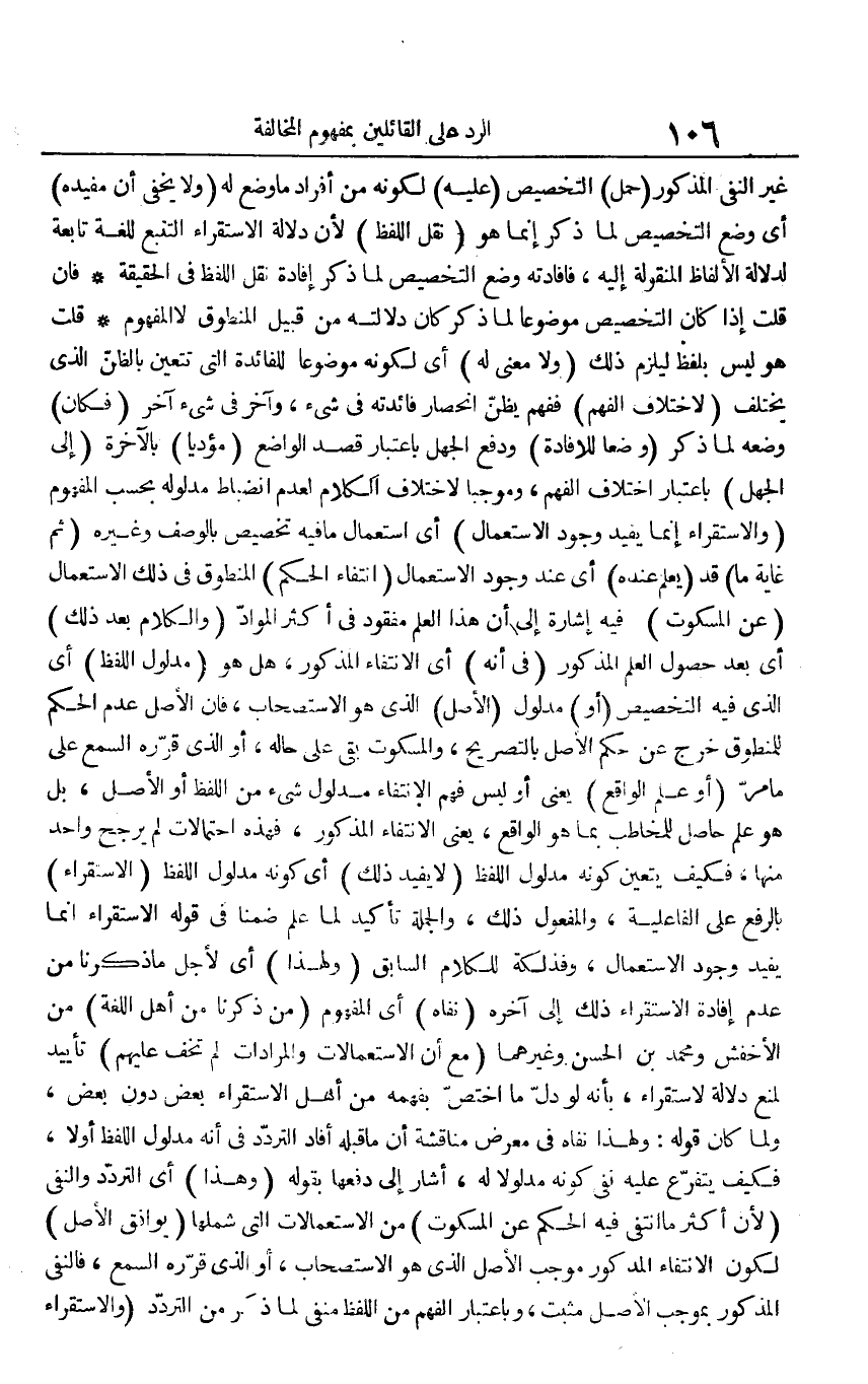 غير النفي المذكور (حمل) التخصيص (عليه) لكونه من أفراد ما وضع له (ولا يخفى أن مفيده) أي وضع التخصيص لما ذكر إنما هو (نقل اللفظ) لأن دلالة الاستقراء التتبع للغة تابعة لدلالة الألفاظ المنقولة إليه، فإفادته وضع التخصيص لما ذكر إفادة نقل اللفظ في الحقيقة. فإن قلت إذا كان التخصيص موضوعا لما ذكر كان دلالته من قبيل المنطوق لا المفهوم. قلت: هو ليس بلفظ ليلزم ذلك (ولا معنى له) أي لكونه موضوعا للفائدة التي تتعين بالظن الذي يختلف (لاختلاف الفهم) ففهم يظن انحصار فائدته في شيء، وآخر في شيء آخر (فكان) وضعه لما ذكر (وضعا للإفادة) ودفع الجهل باعتبار قصد الواضع (مؤديا) بالآخرة (إلى الجهل) باعتبار اختلاف الفهم، وموجبا لاختلاف الكلام لعدم انضباط مدلوله بحسب المفهوم (والاستقراء إنما يفيد وجود الاستعمال) أي استعمال ما فيه تخصيص بالوصف وغيره (ثم غاية ما) قد (يعلم عنده) أي عند وجود الاستعمال (انتفاء الحكم) المنطوق في ذلك الاستعمال (عن المسكوت) وفيه إشارة إلى أن هذا العلم مفقود في أكثر المواد (والكلام بعد ذلك) أي بعد حصول العلم المذكور (في أنه) أي الانتفاء المذكور، هل هو (مدلول اللفظ) أي الذي فيه التخصيص (أو) مدلول (الأصل) الذي هو الاستصحاب، فإن الأصل عدم الحكم للمنطوق خرج عن حكم الأصل بالتصريح، والمسكوت بقي على حاله، أو الذي قرره السمع على ما مر (أو علم الواقع) يعني أو ليس فهم الانتفاء مدلول شيء من اللفظ أو الأصل، بل هو علم حاصل للمخاطب بما هو الواقع، يعني الانتفاء المذكور، فهذه احتمالات لم يرجح واحد منها، فكيف يتعين كونه مدلول اللفظ (لا يفيد ذلك) أي كونه مدلول اللفظ (الاستقراء) بالرفع على الفاعلية، والمفعول ذلك، والجملة تأكيد لما علم ضمنا في قوله الاستقراء إنما يفيد وجود الاستعمال، وفذلكة للكلام السابق (ولهذا) أي لأجل ما ذكرنا من عدم إفادة الاستقراء ذلك إلى آخره (نفاه) أي المفهوم (من ذكرنا من أهل اللغة) من الأخفش ومحمد بن الحسن وغيرهما (مع أن الاستعمالات والمرادات لم تخف عليهم) تأييد لمنع دلالة الاستقراء، بأنه لو دل ما اختص بفهمه من أهل الاستقراء بعض دون بعض، ولما كان قوله: ولهذا نفاه في معرض مناقشة أن ما قبله أفاد التردد في أنه مدلول اللفظ أو لا، فكيف يتفرع عليه نفي كونه مدلولا له، أشار إلى دفعها بقوله (وهذا) أي التردد والنفي (لأن أكثر ما انتفى فيه الحكم عن المسكوت) من الاستعمالات التي شملها (يوافق الأصل) لكون الانتفاء المذكور موجب الأصل الذي هو الاستصحاب، أو الذي قرره السمع، فالنفي المذكور بموجب الأصل مثبت، وباعتبار الفهم من اللفظ منفي لما ذكر من التردد (والاستقراء