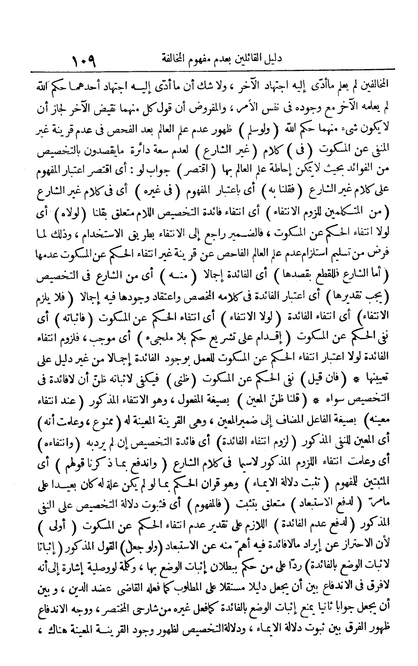 المخالفين لم يعلم ما أدى إليه اجتهاد الآخر، ولا شك أن ما أدى إليه اجتهاد أحدهما حكم الله لم يعلمه الآخر مع وجوده في نفس الأمر، والمفروض أن قول كل منهما نقيض الآخر لجاز أن لا يكون شيء منهما حكم الله (ولو سلم) ظهور عدم علم العالم بعد الفحص في عدم قرينة غير المنفي عن المسكوت (في) كلام (غير الشارع) لعدم سعة دائرة ما يقصدون بالتخصيص من الفوائد بحيث لا يمكن إحاطة علم العالم بها (اقتصر) جواب لو: أي اقتصر اعتبار المفهوم على كلام غير الشارع (فقلنا به) أي باعتبار المفهوم (في غيره) أي في كلام غير الشارع (من المتكلمين للزوم الانتفاء) أي انتفاء فائدة التخصيص اللام متعلق بقلنا (لولاه) أي لولا انتفاء الحكم عن المسكوت، فالضمير راجع إلى الانتفاء بطريق الاستخدام، وذلك لما فرض من تسليم استلزام عدم علم العالم الفاحص عن قرينة غير انتفاء الحكم عن المسكوت عدمها (أما الشارع فللقطع بقصدها) أي الفائدة إجمالا (منه) أي من الشارع في التخصيص (يجب تقديرها) أي اعتبار الفائدة في كلامه المخصص واعتقاد وجودها فيه إجمالا (فلا يلزم الانتفاء) أي انتفاء الفائدة (لولا الانتفاء) أي انتفاء الحكم عن المسكوت (فإثباته) أي نفي الحكم عن المسكوت (إقدام على تشريع حكم بلا ملجئ) أي موجب، فلزوم انتفاء الفائدة لولا اعتبار انتفاء الحكم عن المسكوت للعمل بوجود الفائدة إجمالا من غير دليل على تعيينها. (فإن قيل) نفي الحكم عن المسكوت (ظني) فيكفي لإثباته ظن أن لا فائدة في التخصيص سواه. (قلنا ظن المعين) بصيغة المفعول، وهو الانتفاء المذكور (عند انتفاء معينه) بصيغة الفاعل المضاف إلى ضمير المعين، وهي القرينة المعينة له (ممنوع، وعلمت أنه) أي المعين للنفي المذكور (لزوم انتفاء الفائدة) أي فائدة التخصيص إن لم يرد به (وانتفاءه) أي وعلمت انتفاء اللزوم المذكور لا سيما في كلام الشارع (واندفع بما ذكرنا قولهم) أي المثبتين للمفهوم (تثبت دلالة الإيماء) وهو قران الحكم بما لو لم يكن علة له كان بعيدا على ما مر (لدفع الاستبعاد) متعلق بتثبت (فالمفهوم) أي فثبوت دلالة التخصيص على النفي المذكور (لدفع عدم الفائدة) اللازم على تقدير عدم انتفاء الحكم عن المسكوت (أولى) لأن الاحتراز عن إيراد ما لا فائدة فيه أهم منه عن الاستبعاد (ولو جعل) القول المذكور (إثباتا لإثبات الوضع بالفائدة) ردا على من حكم ببطلان إثبات الوضع بها، وكلمة لو وصلية إشارة إلى أنه لا فرق في الاندفاع بين أن يجعل دليلا مستقلا على المطلوب كما فعله القاضي عضد الدين، وبين أن يجعل جوابا ثانيا يمنع إثبات الوضع بالفائدة كما فعل غيره من شارحي المختصر، ووجه الاندفاع ظهور الفرق بين ثبوت دلالة الإيماء، ودلالة التخصيص لظهور وجود القرينة المعينة هناك،