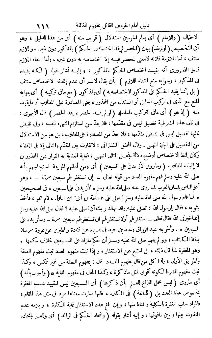 الاحتمال (وللإمام) أي إمام الحرمين استدلال (قريب منه) أي من هذا الدليل، وهو أن التخصيص (لو لم يفد) بيان (الحصر لم يفد اختصاص الحكم) بالمذكور دون غيره، واللازم منتف، أما الملازمة فلأنه لا معنى للحصر فيه إلا اختصاصه به دون غيره، وأما انتفاء اللازم فللعلم الضروري أنه يفيد اختصاص الحكم بالمذكور، وإليه أشار بقوله (لكنه يفيده في المذكور، وجوابه منع انتفاء اللازم) بأن يقال لا نسلم أن عدم إفادته الاختصاص منتف (بل إنما يفيد الحكم على المذكور لاختصاصه به) أي بالمذكور (مع ما في تركيبه) أي جوابه المنع مع الذي في تركيب الدليل أو المستدل من المحذور، يعني المصادرة على المطلوب أو ما يقرب منه (إذ هو) أي ما في التركيب ما حاصله (لو لم يفد الحصر لم يفد الحصر) قال الأبهري: في تالي هذه الشرطية تفصيل ليس في مقدمها، فلا يعد من استلزام الشيء لنفسه، وفي نقيض تاليها تفصيل ليس في نقيض مقدمها، فلا يعد من المصادرة على المطلوب، بل هو من الاستدلال من التفصيل على الجملة انتهى. وقال المحقق التفتازاني: لا تفاوت بين المقدم والتالي إلا في اللفظ، وكان لفظ الاختصاص أوضح دلالة فجعل التالي انتهى، فغاية العناية به الفرار عن المحذورين لا إثبات المطلوب (وما روي لأزيدن على السبعين) أي ومن أدلتهم المزيفة احتجاجهم بأنه صلى الله عليه وسلم فهم مفهوم العدد من قوله تعالى -إن تستغفر لهم سبعين مرة-، وهو أعلم الناس بلسان العرب لما روي عنه صلى الله عليه وسلم "لأزيدن على السبعين" في الصحيحين "لما قام رسول الله صلى الله عليه وسلم ليصلي على عبد الله بن أبي ابن سلول، قام عمر، فأخذ بثوبه، فقال يا رسول الله: تصلي عليه وقد نهاك ربك أن تصلي عليه؟ فقال صلى الله عليه وسلم إنما خيرني الله فقال تعالى -استغفر لهم أو لا تستغفر لهم إن تستغفر لهم سبعين مرة- وسأزيد على السبعين" وأخرجه عبد الرزاق وعبد بن حميد في تفسيره عن قتادة والطبري عن عروة مرسلا بلفظ الكتاب، ولو لم يفهم صلى الله عليه وسلم أن حكم ما زاد على السبعين خلاف حكمها، وهو المغفرة لما قال ذلك، بل امتنع عن الاستغفار، وإذا ثبت مفهوم العدد ثبت مفهوم الصفة بالطريق الأولى، ولذا كل من قال بمفهوم العدد قال بمفهوم الصفة من غير عكس، وكذا ثبت مفهوم الشرط لكونه أقوى لمثل ما ذكرنا، وكذا الحال في مفهوم الغاية. (وأجيب بأنه) أي ما روي (ليس محل النزاع للعلم بأن ذكرها) أي السبعين ليس لتقييد عدم المغفرة بخصوص هذا العدد بل (للمبالغة) في الكثرة، فإنها صارت معناها عرفا في مثل هذا المقام، فالمراد سلب المغفرة بالكلية وإقناط منها، وإن بلغ عدد الاستغفار غاية الكثرة، ويلزمه عدم التفاوت بينها وبين ما فوقها، وإليه أشار بقوله (واتحاد الحكم في الزائد) أي وللعلم باتحاده