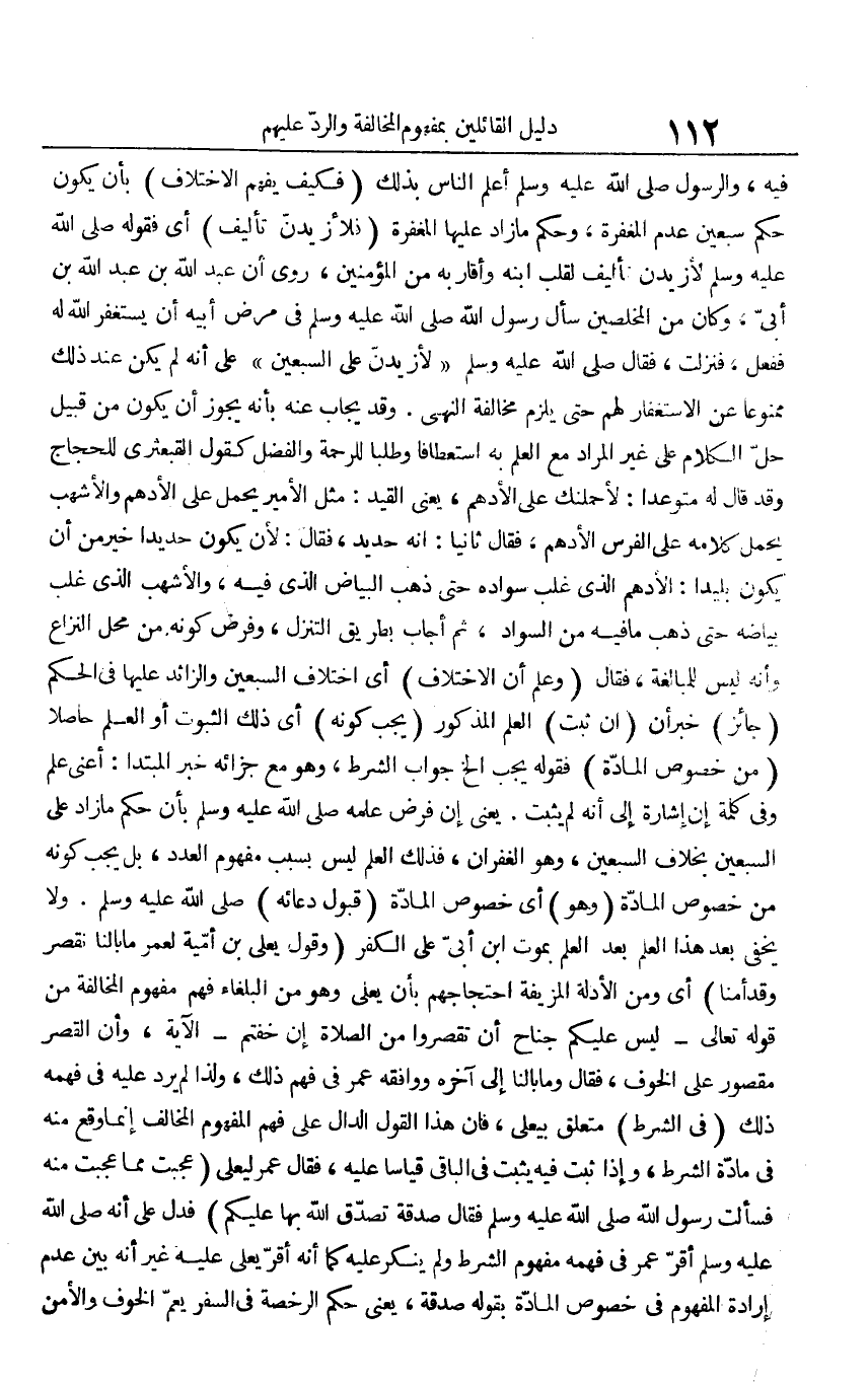 فيه، والرسول صلى الله عليه وسلم أعلم الناس بذلك (فكيف يفهم الاختلاف) بأن يكون حكم سبعين عدم المغفرة، وحكم ما زاد عليها المغفرة (فلأزيدن تأليف) أي فقوله صلى الله عليه وسلم لأزيدن تأليف لقلب ابنه وأقاربه من المؤمنين، روي أن عبد الله بن عبد الله بن أبي، وكان من المخلصين سأل رسول الله صلى الله عليه وسلم في مرض أبيه أن يستغفر الله له ففعل، فنزلت، فقال صلى الله عليه وسلم "لأزيدن على السبعين" على أنه لم يكن عند ذلك ممنوعا عن الاستغفار لهم حتى يلزم مخالفة النهي. وقد يجاب عنه بأنه يجوز أن يكون من قبيل حل الكلام على غير المراد مع العلم به استعطافا وطلبا للرحمة والفضل كقول القبعثرى للحجاج وقد قال له متوعدا: لأحملنك على الأدهم، يعني القيد: مثل الأمير يحمل على الأدهم والأشهب يحمل كلامه على الفرس الأدهم، فقال ثانيا: إنه حديد، فقال: لأن يكون حديدا خير من أن يكون بليدا: الأدهم الذي غلب سواده حتى ذهب البياض الذي فيه، والأشهب الذي غلب بياضه حتى ذهب ما فيه من السواد، ثم أجاب بطريق التنزل وفرض كونه من محل النزاع وأنه ليس للمبالغة فقال: (وعلم أن الاختلاف) أي اختلاف السبعين والزائد عليها في الحكم (جائز) خبر أن (إن ثبت) العلم المذكور (يجب كونه) أي ذلك الثبوت أو العلم حاصلا (من خصوص المادة) فقوله يجب إلخ جواب الشرطن وهو مع جزائه خبر المبتدأ: أعني علم وفي كلمة إن إشارة إلى أنه لم يثبت. يعني إن فرض علمه صلى الله عليه وسلم بأن حكم ما زاد على السبعين بخلاف السبعين، وهو الغفران، فذلك العلم ليس بسبب مفهوم العدد، بل يجب كونه من خصوص المادة (وهو) أي خصوص المادة (قبول دعائه) صلى الله عليه وسلم. ولا يخفى بعد هذا العلم بعد العلم بموت ابن أبي على الكفر (وقول يعلى بن أمية لعمر ما بالنا نقصر وقد أمنا) أي ومن الأدلة المزيفة احتجاجهم بأن يعلى وهو من البلغاء فهم مفهوم المخالفة من قوله تعالى -ليس عليكم جناح أن تقصروا من الصلاة إن خفتم- الآية، وأن القصر مقصور على الخوف، فقال وما بالنا إلى آخره ووافقه عمر في فهم ذلك، ولذا لم يرد عليه في فهمه ذلك (في الشرط) متعلق بيعلى، فإن هذا القول الدال على فهم المفهوم المخالف إنما وقع منه في مادة الشرط، وإذا ثبت فيه يثبت في الباقي قياسا عليه، فقال عمر ليعلى (عجبت مما عجبت منه فسألت رسول الله صلى الله عليه وسلم فقال صدقة تصدق الله بها عليكم) فدل على أنه صلى الله عليه وسلم أقر عمر في فهمه مفهوم الشرط ولم ينكر عليه كما أنه أقر يعلى عليه غير أنه بين عدم إرادة المفهوم في خصوص المادة بقوله صدقة، يعني حكم الرخصة في السفر يعم الخوف والأمن
