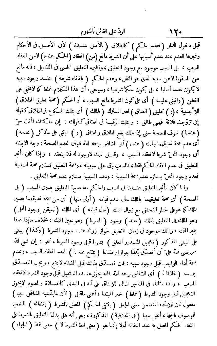 قبل دخول الدار (فعدم الحكم) كالطلاق (بالأصل عندنا) لأن الأصل في الأحكام وغيرها العدم عند عدم أسبابها على أن الشرط مانع (من) انعقاد (الحكم عنده) لا من انعقاد السبب، بل السبب موجود مع وجود التعليق، ونظيره التعليق الحسي في القنديل، فإنه مانع عن السقوط لا عن سببه الذي هو الثقل، وعدم الحكم (بانتفاء شرطه) عند وجود سببه لا يكون عدما أصليا، بل يكون حكما شرعيا، وسيجيء أن هذا الكلام غلط كما لا يخفى على الفطن (وانبنى عليه) أي على كون الشرط مانع السبب، أو الحكم (صحة تعليق الطلاق) للاجنبة، (و) تعليق (العتاق) لغير المملوك (بالملك) أي يملك النكاح في الطلاق كقوله إن تزوجت فلانة فهي طالق، وبملك الرقبة في العتاق كقولك: إن ملكتك فأنت حر (عندنا) ظرف للصحة حتى إذا ملك يقع الطلاق والعتاق (و) ابتنى على ما ذكر (عدمه) أي عدم صحة تعليقهما بالملك (عنده) أي الشافعي رحمه الله ظرف لعدم الصحة، وجه الابتناء أن وجود المحل شرط لانعقاد السبب، وقبل الملك لا وجود له فلا ينعقد، وإذا كان تأثير التعليق في عدم انعقاد الحكم فقط، فالسبب باق على سببته وصحة التعليق تستلزم صحة السببية فعدم وجود المحلي يستلزم عدم صحة السببية، وعدم السببية يستلزم عدم صحة التعليق.
