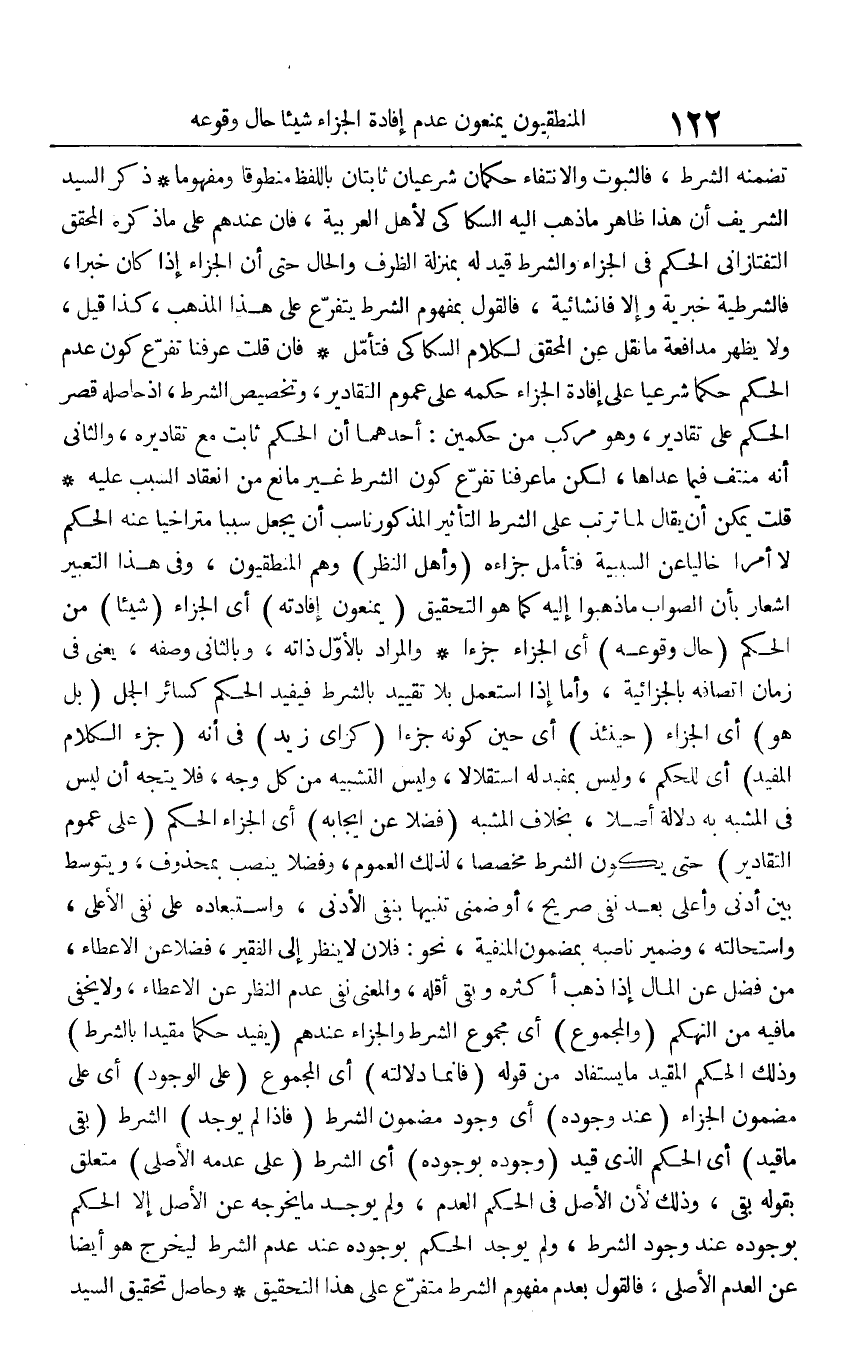 تضمنه الشَّرْط، فالثبوت والانتفاء حكمان شرعيان ثابتان بِاللَّفْظِ منطوقا ومفهوما ذكر السَّيِّد الشريف أَن هَذَا ظَاهر مَا ذهب إِلَيْهِ السكاكي لأهل الْعَرَبيَّة، فَإِن عِنْدهم على مَا ذكره الْمُحَقق التَّفْتَازَانِيّ الحكم فِي الْجَزَاء وَالشّرط قيد لَهُ بِمَنْزِلَة الظّرْف وَالْحَال حَتَّى أَن الْجَزَاء إِذا كَانَ خَبرا، فالشرطية خبرية وَإِلَّا فإنشائية، فَالْقَوْل بِمَفْهُوم الشَّرْط يتَفَرَّع على هَذَا الْمَذْهَب، كَذَا قيل، وَلَا يظْهر مدافعة مَا نقل عَن الْمُحَقق لكَلَام السكاكي فَتَأمل فَإِن قلت عرفنَا تفرع كَون عدم الحكم حكما شَرْعِيًّا على إِفَادَة الْجَزَاء حكمه على عُمُوم التقادير، وتحصيص الشَّرْط، إِذْ حَاصله قصر الحكم على تقادير، وَهُوَ مركب من حكمين: أَحدهمَا أَن الحكم ثَابت مَعَ تقاديره، وَالثَّانِي أَنه مُنْتَفٍ فِيمَا عَداهَا، لَكِن مَا عرفنَا تفرع كَون الشَّرْط غير مَانع من انْعِقَاد السَّبَب عَلَيْهِ قلت يُمكن أَن يُقَال لما تربت على الشَّرْط التَّأْثِير الْمَذْكُور ناسب أَن يَجْعَل سَببا متراخيا عَنهُ الحكم لَا أمرا خَالِيا عَن السَّبَبِيَّة فَتَأمل جزاءه (وَأهل النّظر) وهم المنطقيون، وَفِي هَذَا التَّعْبِير إِشْعَار بِأَن الصَّوَاب مَا ذَهَبُوا إِلَيْهِ كَمَا هُوَ التَّحْقِيق (يمْنَعُونَ إفادته) أَي الْجَزَاء (شَيْئا) من الحكم (حَال وُقُوعه) أَي الْجَزَاء جُزْءا وَالْمرَاد بِالْأولِ ذَاته، وَبِالثَّانِي وَصفه، يَعْنِي فِي زمَان اتصافه بالجزائية، وَأما إِذا اسْتعْمل بِلَا تَقْيِيد بِالشّرطِ فَيُفِيد الحكم كَسَائِر الْجمل (بل هُوَ) أَي الْجَزَاء (حِينَئِذٍ) أَي حِين كَونه جُزْءا (كزاي زيد) فِي أَنه (جُزْء الْكَلَام الْمُفِيد) أَي للْحكم، وَلَيْسَ بمفيد لَهُ اسْتِقْلَالا، وَلَيْسَ التَّشْبِيه من كل وَجه، فَلَا يتَّجه أَن لَيْسَ فِي الْمُشبه بِهِ دلَالَة أصلا، بِخِلَاف الْمُشبه (فضلا عَن إِيجَابه) أَي الْجَزَاء الحكم (على عُمُوم التقادير) حَتَّى يكون الشَّرْط مُخَصّصا، لذَلِك الْعُمُوم، وفضلا ينصب بِمَحْذُوف، ويتوسط بَين أدنى وَأَعْلَى بعد نفي صَرِيح، أَو ضمني تَنْبِيها بِنَفْي الْأَدْنَى، واستبعاده على نفي الْأَعْلَى، واستحالته، وَضمير ناصبه بمضمون المنفية، نَحْو: فلَان لَا ينظر إِلَى الْفَقِير، فضلا عَن الْإِعْطَاء، من فضل عَن المَال إِذا ذهب أَكْثَره وَبَقِي أَقَله، وَالْمعْنَى نفي عدم النّظر عَن الْإِعْطَاء، وَلَا يخفى مَا فِيهِ من التهكم (وَالْمَجْمُوع) أَي مَجْمُوع الشَّرْط وَالْجَزَاء عِنْدهم (يُفِيد حكما مُقَيّدا بِالشّرطِ) وَذَلِكَ الحكم الْمُقَيد مَا يُسْتَفَاد من قَوْله (فَإِنَّمَا دلَالَته) أَي الْمَجْمُوع (على الْوُجُود) أَي على مَضْمُون الْجَزَاء (عِنْد وجوده) أَي وجود مَضْمُون الشَّرْط (فَإِذا لم يُوجد) الشَّرْط (بَقِي مَا قيد) أَي الحكم الَّذِي قيد (وجوده بِوُجُودِهِ) أَي الشَّرْط (على عَدمه الْأَصْلِيّ) مُتَعَلق بقوله بَقِي وَذَلِكَ لِأَن الأَصْل فِي الحكم الْعَدَم، وَلم يُوجد مَا يُخرجهُ عَن الأَصْل إِلَّا الحكم بِوُجُودِهِ عِنْد وجود الشَّرْط، وَلم يُوجد الحكم بِوُجُودِهِ عِنْد عدم الشَّرْط ليخرج هُوَ أَيْضا عَن الْعَدَم الْأَصْلِيّ. فَالْقَوْل بِعَدَمِ مَفْهُوم الشَّرْط متفرع على هَذَا التَّحْقِيق وَحَاصِل تَحْقِيق السَّيِّد