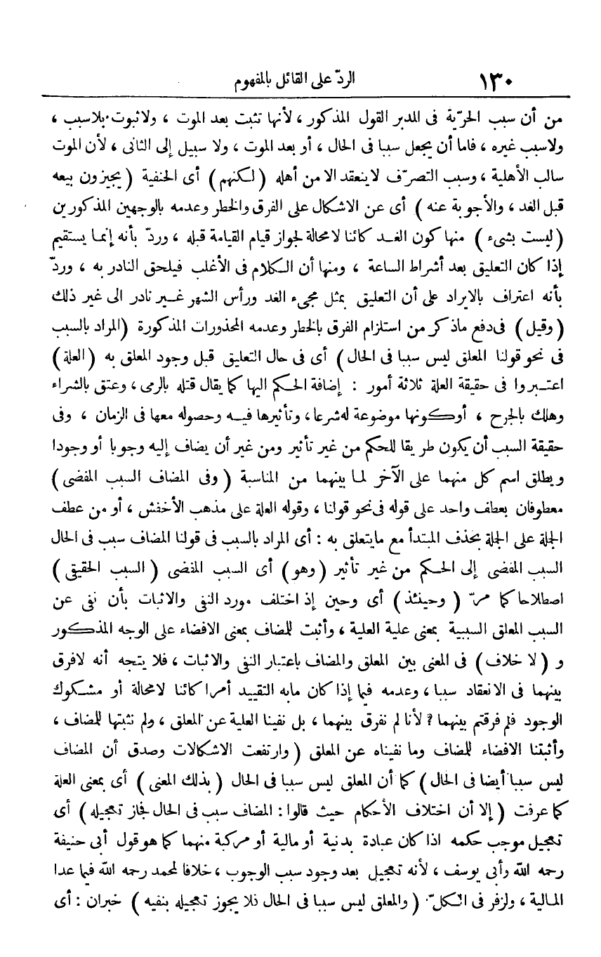 من أَن سَبَب الْحُرِّيَّة فِي الْمُدبر القَوْل الْمَذْكُور، لِأَنَّهَا تثبت بعد الْمَوْت، وَلَا ثُبُوت بِلَا سَبَب، وَلَا سَبَب غَيره، فإمَّا أَن يَجْعَل سَببا فِي الْحَال، أَو بعد الْمَوْت، وَلَا سَبِيل إِلَى الثَّانِي، لِأَن الْمَوْت سالب الْأَهْلِيَّة، وَسبب التَّصَرُّف لَا ينْعَقد إِلَّا من أَهله (لكِنهمْ) أَي الْحَنَفِيَّة (يجيزون بَيْعه قبل الْغَد، والأجوبة عَنهُ) أَي عَن الأشكال على الْفرق والخطر وَعَدَمه بِالْوَجْهَيْنِ الْمَذْكُورين (لَيست بِشَيْء) مِنْهَا كَون الْغَد كَائِنا لَا محَالة لجَوَاز قيام الْقِيَامَة قبله، ورد بِأَنَّهُ إِنَّمَا يَسْتَقِيم إِذا كَانَ التَّعْلِيق بعد أَشْرَاط السَّاعَة، وَمِنْهَا أَن الْكَلَام فِي الْأَغْلَب فَيلْحق النَّادِر بِهِ، ورد بِأَنَّهُ اعْتِرَاف بالإيراد على أَن التَّعْلِيق بِمثل مَجِيء الْغَد وَرَأس الشَّهْر غير نَادِر إِلَى غير ذَلِك (وَقيل) فِي دفع مَا ذكر من استلزام الْفرق بالخطر وَعَدَمه المحذورات الْمَذْكُورَة (المُرَاد بِالسَّبَبِ فِي نَحْو قَوْلنَا الْمُعَلق لَيْسَ سَببا فِي الْحَال) أَي فِي حَال التَّعْلِيق قبل وجود الْمُعَلق بِهِ (الْعلَّة) اعتبروا فِي حَقِيقَة الْعلَّة ثَلَاثَة أُمُور: إِضَافَة الحكم إِلَيْهَا كَمَا يُقَال قَتله بِالرَّمْي، وَعتق بِالشِّرَاءِ وَهلك بِالْجرْحِ، أَو كَونهَا مَوْضُوعَة لَهُ شرعا، وتأثيرها فِيهِ وحصوله مَعهَا فِي الزَّمَان، وَفِي حَقِيقَة السَّبَب أَن يكون طَرِيقا للْحكم من غير تَأْثِير وَمن غير أَن يُضَاف إِلَيْهِ وجوبا أَو وجودا وَيُطلق اسْم كل مِنْهُمَا عَن الآخر لما بَينهمَا من الْمُنَاسبَة (وَفِي الْمُضَاف السَّبَب المفضي) معطوفان بعطف وَاحِد على قَوْله فِي نَحْو قَوْلنَا، وَقَوله الْعلَّة على مَذْهَب الْأَخْفَش، أَو من عطف الْجُمْلَة على الْجُمْلَة بِحَذْف الْمُبْتَدَأ مَعَ مَا يتَعَلَّق بِهِ: أَي المُرَاد بِالسَّبَبِ فِي قَوْلنَا الْمُضَاف سَبَب فِي الْحَال السَّبَب المفضي إِلَى الحكم من غير تَأْثِير (وَهُوَ) أَي السَّبَب المفضي (السَّبَب الْحَقِيقِيّ) اصْطِلَاحا كَمَا مر (وَحِينَئِذٍ) أَي وَحين إِذْ اخْتلف مورد النَّفْي وَالْإِثْبَات بِأَن نفى عَن السَّبَب الْمُعَلق السَّبَبِيَّة بِمَعْنى علية الْعلية، وَأثبت للمضاف بِمَعْنى الْإِفْضَاء على الْوَجْه الْمَذْكُور و (لَا خلاف) فِي الْمَعْنى بَين الْمُعَلق والمضاف بِاعْتِبَار النَّفْي وَالْإِثْبَات، فَلَا يتَوَجَّه أَنه لَا فرق بَينهمَا فِي الِانْعِقَاد سَببا، وَعَدَمه فِيمَا إِذا كَانَ مَا بِهِ التَّقْيِيد أمرا كَائِنا لَا محَالة أَو مَشْكُوك الْوُجُود فَلم فرقتم بَينهمَا؟ لأَنا لم نفرق بَينهمَا، بل نَفينَا الْعلية عَن الْمُعَلق، وَلم نثبتها للمضاف، وأثبتنا الْإِفْضَاء للمضاف وَمَا نفيناه عَن الْمُعَلق (وَارْتَفَعت الاشكالات وَصدق أَن الْمُضَاف لَيْسَ سَببا أَيْضا فِي الْحَال) كَمَا أَن الْمُعَلق لَيْسَ سَببا فِي الْحَال (بذلك الْمَعْنى) أَي بِمَعْنى الْعلَّة كَمَا عرفت (إِلَّا أَن اخْتِلَاف الْأَحْكَام حَيْثُ قَالُوا: الْمُضَاف سَبَب فِي الْحَال فَجَاز تَعْجِيله) أَي تَعْجِيل مُوجب حكمه إِذا كَانَ عبَادَة بدنية أَو مَالِيَّة أَو مركبة مِنْهُمَا كَمَا هُوَ قَول أبي حنيفَة رَحمَه الله وَأبي يُوسُف، لِأَنَّهُ تَعْجِيل بعد وجود سَبَب الْوُجُوب، خلافًا لمُحَمد رَحمَه الله فِيمَا عدا الْمَالِيَّة، ولزفر فِي الْكل (وَالْمُعَلّق لَيْسَ سَببا فِي الْحَال فَلَا يجوز تَعْجِيله بنفيه) خبران: أَي
