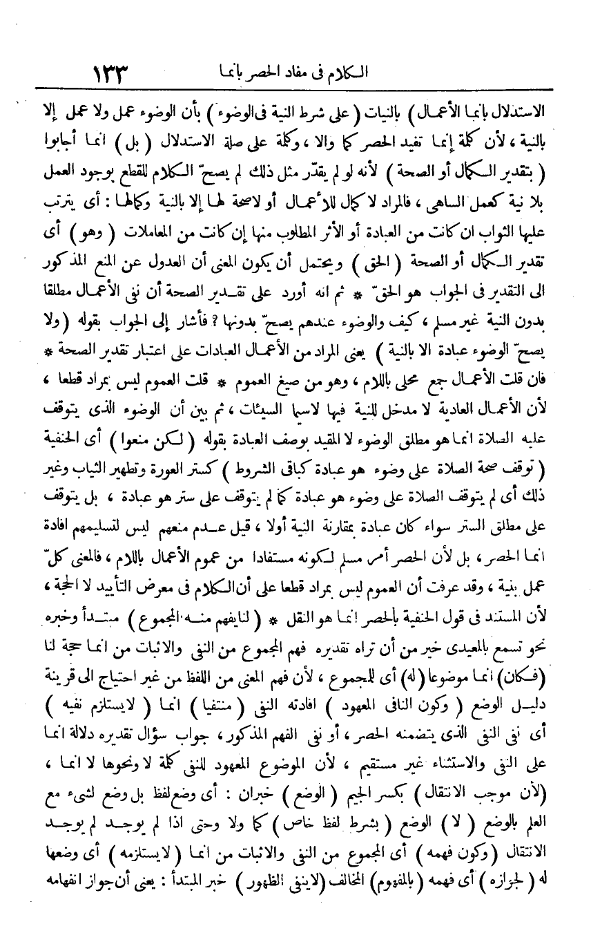 الِاسْتِدْلَال بإنما الْأَعْمَال) بِالنِّيَّاتِ (على شَرط النِّيَّة فِي الْوضُوء) بِأَن الْوضُوء عمل وَلَا عمل إِلَّا بِالنِّيَّةِ، لِأَن كلمة إِنَّمَا تفِيد الْحصْر كَمَا وَإِلَّا، وَكلمَة على صلَة الِاسْتِدْلَال (بل) إِنَّمَا أجابوا (بِتَقْدِير الْكَمَال أَو الصِّحَّة) لِأَنَّهُ لَو لم يقدر مثل ذَلِك لم يَصح الْكَلَام للْقطع بِوُجُود الْعَمَل بِلَا نِيَّة كعمل الساهي، فَالْمُرَاد لَا كَمَال للأعمال أَو لَا صِحَة لَهَا إِلَّا بِالنِّيَّةِ وكمالها: أَي يَتَرَتَّب عَلَيْهَا الثَّوَاب إِن كَانَت من الْعِبَادَة أَو الْأَثر الْمَطْلُوب مِنْهَا إِن كَانَت من الْمُعَامَلَات (وَهُوَ) أَي تَقْدِير الْكَمَال أَو الصِّحَّة (الْحق) وَيحْتَمل أَن يكون الْمَعْنى أَن الْعُدُول عَن الْمَنْع الْمَذْكُور إِلَى التَّقْدِير فِي الْجَواب هُوَ الْحق ثمَّ أَنه أورد على تَقْدِير الصِّحَّة أَن نفي الْأَعْمَال مُطلقًا بِدُونِ النِّيَّة غير مُسلم، كَيفَ والضوء عِنْدهم يَصح بِدُونِهَا؟ فَأَشَارَ إِلَى الْجَواب بقوله (وَلَا يَصح الْوضُوء عبَادَة إِلَّا بِالنِّيَّةِ) يَعْنِي المُرَاد من الْأَعْمَال الْعِبَادَات على اعْتِبَار تَقْدِير الصِّحَّة فَإِن قلت الْأَعْمَال جمع محلى بِاللَّامِ، وَهُوَ من صِيغ الْعُمُوم قلت الْعُمُوم لَيْسَ بِمُرَاد قطعا، لِأَن الْأَعْمَال العادية لَا مدْخل للنِّيَّة فِيهَا لَا سِيمَا السَّيِّئَات، ثمَّ بَين أَن الْوضُوء الَّذِي يتَوَقَّف صلى الله عَلَيْهِ وَسلم إِنَّمَا هُوَ مُطلق الْوضُوء لَا الْمُقَيد بِوَصْف الْعِبَادَة بقوله (لَكِن منعُوا) أَي الْحَنَفِيَّة (توقف صِحَة الصَّلَاة على وضوء هُوَ عبَادَة كباقي الشُّرُوط) كستر الْعَوْرَة وتطهير الثِّيَاب وَغير ذَلِك أَي لم يتَوَقَّف الصَّلَاة على وضوء هُوَ عبَادَة كَمَا لم يتَوَقَّف على ستر هُوَ عبَادَة، بل يتَوَقَّف على مُطلق السّتْر سَوَاء كَانَ عبَادَة بمقارنة النِّيَّة أَو لَا، قيل عدم مَنعهم لَيْسَ لتسليمهم إِفَادَة إِنَّمَا الْحصْر، بل لِأَن الْحصْر أَمر مُسلم لكَونه مستفادا من عُمُوم الْأَعْمَال بِاللَّامِ، فَالْمَعْنى كل عمل بنية، وَقد عرفت أَن الْعُمُوم لَيْسَ بِمُرَاد قطعا على أَن الْكَلَام فِي معرض التأييد لَا الْحجَّة، لِأَن الْمُسْتَند فِي قَول الْحَنَفِيَّة بالحصر إِنَّمَا هُوَ النَّقْل (لنا يفهم مِنْهُ الْمَجْمُوع) مُبْتَدأ وَخَبره نَحْو تسمع بالمعيدي خير من أَن ترَاهُ تَقْدِيره فهم الْمَجْمُوع من النَّفْي وَالْإِثْبَات من إِنَّمَا حجَّة لنا (فَكَانَ) إِنَّمَا مَوْضُوعا (لَهُ) أَي للمجموع، لِأَن فهم الْمَعْنى من اللَّفْظ من غير احْتِيَاج إِلَى قرينَة دَلِيل الْوَضع (وَكَون النَّافِي الْمَعْهُود) إفادته النَّفْي (منتفيا) إِنَّمَا (لَا يسْتَلْزم نَفْيه) أَي نفي النَّفْي الَّذِي يتضمنه الْحصْر، أَو نفي الْفَهم الْمَذْكُور، جَوَاب سُؤال تَقْدِيره دلَالَة إِنَّمَا على النَّفْي وَالِاسْتِثْنَاء غير مُسْتَقِيم، لِأَن الْمَوْضُوع الْمَعْهُود للنَّفْي كلمة لَا وَنَحْوهَا لَا إِنَّمَا، (لِأَن مُوجب الِانْتِقَال) بِكَسْر الْجِيم (الْوَضع) خبران: أَي وضع لفظ بل وضع لشَيْء مَعَ الْعلم بِالْوَضْعِ (لَا) الْوَضع (بِشَرْط لفظ خَاص) كَمَا وَلَا وَحَتَّى إِذا لم يُوجد لم يُوجد الِانْتِقَال (وَكَون فهمه) أَي الْمَجْمُوع من النَّفْي وَالْإِثْبَات من إِنَّمَا (لَا يستلزمه) أَي وَضعهَا لَهُ (لجوازه) أَي فهمه (بِالْمَفْهُومِ) الْمُخَالف (لَا يَنْفِي الظُّهُور) خبر الْمُبْتَدَأ: يَعْنِي أَن جَوَاز انفهامه