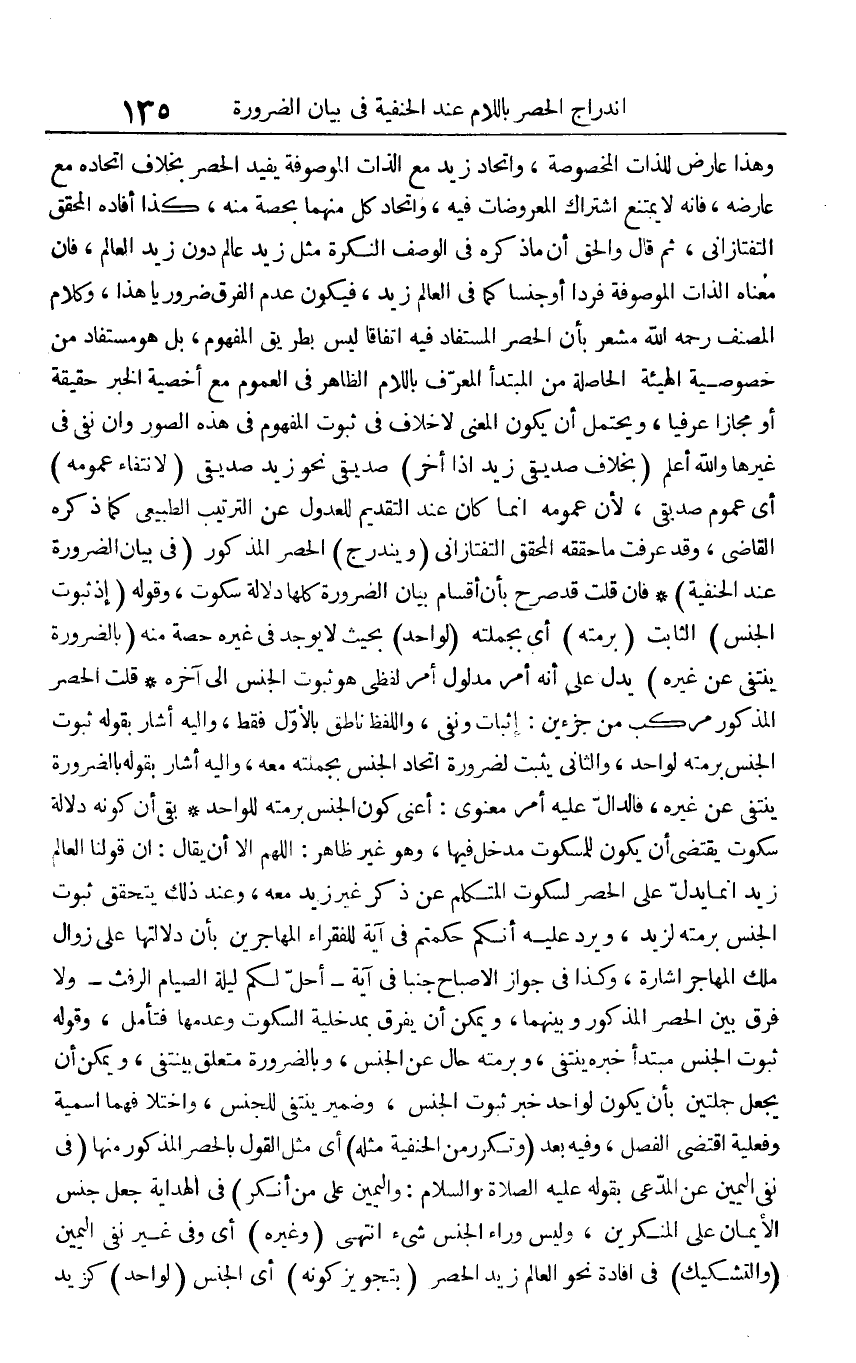 وَهَذَا غارض للذات الْمَخْصُوصَة، واتحاد زيد مَعَ الذَّات الموصوفة يُفِيد الْحصْر بِخِلَاف اتحاده مَعَ عَارضه، فَإِنَّهُ لَا يمْتَنع اشْتِرَاك المعروضات فِيهِ، واتحاد كل مِنْهُمَا بِحِصَّة مِنْهُ، كَذَا أَفَادَهُ الْمُحَقق التَّفْتَازَانِيّ، ثمَّ قَالَ وَالْحق أَن مَا ذكره فِي الْوَصْف النكرَة مثل زيد عَالم دون زيد الْعَالم، فَإِن مَعْنَاهُ الذَّات الموصوفة فَردا أَو جِنْسا كَمَا فِي الْعَالم زيد، فَيكون عدم الْفرق ضَرُورِيًّا هَذَا، وَكَلَام المُصَنّف رَحمَه الله مشْعر بِأَن الْحصْر الْمُسْتَفَاد فِيهِ اتِّفَاقًا لَيْسَ بطرِيق الْمَفْهُوم، بل هُوَ مُسْتَفَاد من خُصُوصِيَّة الْهَيْئَة الْحَاصِلَة من الْمُبْتَدَأ الْمُعَرّف بِاللَّامِ الظَّاهِر فِي الْعُمُوم مَعَ أخصية الْخَبَر حَقِيقَة أَو مجَازًا عرفيا، وَيحْتَمل أَن يكون الْمَعْنى لَا خلاف فِي ثُبُوت الْمَفْهُوم فِي هَذِه الصُّور وَإِن نفى فِي غَيرهَا وَالله أعلم (بِخِلَاف صديقي زيد إِذا أخر) صديقي نَحْو زيد صديقي (لانْتِفَاء عُمُومه) أَي عُمُوم صديقي، لِأَن عُمُومه إِنَّمَا كَانَ عِنْد التَّقْدِيم للعدول عَن التَّرْتِيب الطبيعي كَمَا ذكره القَاضِي، وَقد عرفت مَا حَقَّقَهُ الْمُحَقق التَّفْتَازَانِيّ (ويندرج) الْحصْر الْمَذْكُور (فِي بَيَان الضَّرُورَة عِنْد الْحَنَفِيَّة) فَإِن قلت قد صرح بِأَن أَقسَام بَيَان الضَّرُورَة كلهَا دلَالَة سكُوت، وَقَوله (إِذْ ثُبُوت الْجِنْس) الثَّابِت (برمتِهِ) أَي بجملته (لوَاحِد) بِحَيْثُ لَا يُوجد فِي غَيره حِصَّة مِنْهُ (بِالضَّرُورَةِ ينتفى عَن غَيره) يدل على أَنه أَمر مَدْلُول أَمر لَفْظِي هُوَ ثُبُوت الْجِنْس إِلَى آخِره قلت الْحصْر الْمَذْكُور مركب من جزءين: إِثْبَات وَنفي، وَاللَّفْظ نَاطِق بِالْأولِ فَقَط، وَإِلَيْهِ أَشَارَ بقوله ثُبُوت الْجِنْس برمتِهِ لوَاحِد، وَالثَّانِي يثبت لضَرُورَة اتِّحَاد الْجِنْس بجملته مَعَه، وَإِلَيْهِ أَشَارَ بقوله بِالضَّرُورَةِ ينتفى عَن غَيره، فالدال عَلَيْهِ أَمر معنوي: أَعنِي كَون الْجِنْس برمتِهِ للْوَاحِد بَقِي أَن كَونه دلَالَة سكُوت يَقْتَضِي أَن يكون للمسكوت مدْخل فِيهَا، وَهُوَ غير ظَاهر: اللَّهُمَّ إِلَّا أَن يُقَال: إِن قَوْلنَا الْعَالم زيد إِنَّمَا يدل على الْحصْر لسكوت الْمُتَكَلّم عَن ذكر غير زيد مَعَه، وَعند ذَلِك يتَحَقَّق ثُبُوت الْجِنْس برمتِهِ لزيد، وَيرد عَلَيْهِ أَنكُمْ حكمتم فِي آيَة للْفُقَرَاء الْمُهَاجِرين بِأَن دلالتها على زَوَال ملك المُهَاجر إِشَارَة، وَكَذَا فِي جَوَاز الإصباح جنبا فِي آيَة - {أحل لكم لَيْلَة الصّيام الرَّفَث} - وَلَا فرق بَين الْحصْر الْمَذْكُور وَبَينهمَا، وَيُمكن أَن يفرق بمدخلية السُّكُوت وَعدمهَا فَتَأمل، وَقَوله ثُبُوت الْجِنْس مُبْتَدأ خَبره ينتفى، وبرمته حَال عَن الْجِنْس، وبالضرورة مُتَعَلق بينتفى، وَيُمكن أَن يَجْعَل جملتين بِأَن يكون لوَاحِد خبر ثُبُوت الْجِنْس، وَضمير ينتفى للْجِنْس، واختلافهما اسمية وفعلية اقْتضى الْفَصْل، وَفِيه بعد (وتكرر من الْحَنَفِيَّة مثله) أَي مثل القَوْل بالحصر الْمَذْكُور مِنْهَا (فِي نفي الْيَمين عَن الْمُدَّعِي بقوله صلى الله عَلَيْهِ وَسلم: وَالْيَمِين على من أنكر) فِي الْهِدَايَة جعل جنس الْإِيمَان على المنكرين، وَلَيْسَ وَرَاء الْجِنْس شَيْء انْتهى (وَغَيره) أَي وَفِي غير نفي الْيَمين (والتشكيك) فِي إِفَادَة نَحْو الْعَالم زيد الْحصْر (بتجويز كَونه) أَي الْجِنْس (لوَاحِد) كزيد