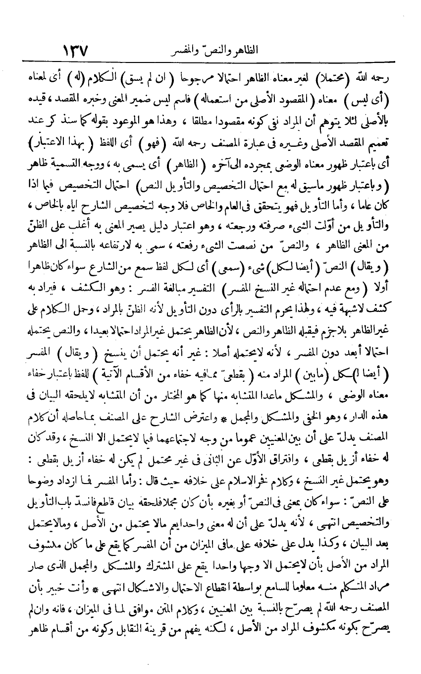 رَحمَه الله (مُحْتملا) لغير مَعْنَاهُ الظَّاهِر احْتِمَالا مرجوحا (إِن لم يسق) الْكَلَام (لَهُ) أَي لمعناه (أَي لَيْسَ) مَعْنَاهُ (الْمَقْصُود الْأَصْلِيّ من اسْتِعْمَاله) فاسم لَيْسَ ضمير الْمَعْنى وَخَبره الْمَقْصد، قَيده بالأصلي لِئَلَّا يتَوَهَّم أَن المُرَاد نفى كَونه مَقْصُودا مُطلقًا، وَهَذَا هُوَ الْمَوْعُود بقوله كَمَا سنذكر عِنْد تَعْمِيم الْمَقْصد الْأَصْلِيّ وَغَيره فِي عبارَة المُصَنّف رَحمَه الله (فَهُوَ) أَي اللَّفْظ (بِهَذَا الِاعْتِبَار) أَي بِاعْتِبَار ظُهُور مَعْنَاهُ الوضعي بِمُجَرَّدِهِ إِلَى آخِره (الظَّاهِر) أَي يُسمى بِهِ، وَوجه التَّسْمِيَة ظَاهر (وَبِاعْتِبَار ظُهُور مَا سيق لَهُ مَعَ احْتِمَال التَّخْصِيص والتأويل النَّص) احْتِمَال التَّخْصِيص فِيمَا إِذا كَانَ عَاما، وَأما التَّأْوِيل فَهُوَ يتَحَقَّق فِي الْعَام وَالْخَاص فَلَا وَجه لتخصيص الشَّارِح إِيَّاه بالخاص، والتأويل من أولت الشَّيْء صرفته ورجعته، وَهُوَ اعْتِبَار دَلِيل يصير الْمَعْنى بِهِ أغلب على الظَّن من الْمَعْنى الظَّاهِر، وَالنَّص من نصصت الشَّيْء رفعته، سمى بِهِ لارتفاعه بِالنِّسْبَةِ إِلَى الظَّاهِر (وَيُقَال) النَّص (أَيْضا لكل) شَيْء (سَمْعِي) أَي لكل لفظ سمع من الشَّارِع سَوَاء كَانَ ظَاهرا أَولا (وَمَعَ عدم احْتِمَاله غير النّسخ الْمُفَسّر) التَّفْسِير مُبَالغَة الفسر: وَهُوَ الْكَشْف، فيراد بِهِ كشف لَا شُبْهَة فِيهِ، وَلِهَذَا يحرم التَّفْسِير بِالرَّأْيِ دون التَّأْوِيل لِأَنَّهُ الظَّن بالمراد، وَحمل الْكَلَام على غير الظَّاهِر بِلَا جزم فيقبله الظَّاهِر وَالنَّص، لِأَن الظَّاهِر يحْتَمل غير المُرَاد احْتِمَالا بَعيدا، وَالنَّص يحْتَملهُ احْتِمَالا أبعد دون الْمُفَسّر، لِأَنَّهُ لَا يحْتَملهُ أصلا: غير أَنه يحْتَمل أَن ينْسَخ (وَيُقَال) الْمُفَسّر (أَيْضا ل) كل (مَا بَين) المُرَاد مِنْهُ (بقطعي مِمَّا فِيهِ خَفَاء من الْأَقْسَام الْآتِيَة) للفظ بِاعْتِبَار خَفَاء مَعْنَاهُ الوضعي، والمشكل مَا عدا الْمُتَشَابه مِنْهَا كَمَا هُوَ الْمُخْتَار من أَن الْمُتَشَابه لَا يلْحقهُ الْبَيَان فِي هَذِه الدَّار، وَهُوَ الْخَفي والمشكل والمجمل وَاعْترض الشَّارِح على المُصَنّف بِمَا حَاصله أَن كَلَام المُصَنّف يدل على أَن بَين الْمَعْنيين عُمُوما من وَجه لاجتماعهما فِيمَا لَا يحْتَمل إِلَّا النّسخ، وَقد كَانَ لَهُ خَفَاء أزيل بقطعي، وافتراق الأول عَن الثَّانِي فِي غير مُحْتَمل لم يكن لَهُ خَفَاء أزيل بقطعي: وَهُوَ يحْتَمل غير النّسخ، وَكَلَام فَخر الْإِسْلَام على خِلَافه حَيْثُ قَالَ: وَأما الْمُفَسّر فَمَا ازْدَادَ وضوحا على النَّص: سَوَاء كَانَ بِمَعْنى فِي النَّص أَو بِغَيْرِهِ بِأَن كَانَ مُجملا فَلحقه بَيَان قَاطع فانسد بَاب التَّأْوِيل والتخصيص انْتهى، لِأَنَّهُ يدل على أَن لَهُ معنى وَاحِدًا يعم مَا لَا يحْتَمل من الأَصْل، وَمَا لَا يحْتَمل بعد الْبَيَان، وَكَذَا يدل على خِلَافه على مَا فِي الْمِيزَان من أَن الْمُفَسّر كَمَا يَقع على مَا كَانَ مَكْشُوف المُرَاد من الأَصْل بِأَن لَا يحْتَمل إِلَّا وَجها وَاحِدًا يَقع على الْمُشْتَرك والمشكل والمجمل الَّذِي صَار مُرَاد الْمُتَكَلّم مِنْهُ مَعْلُوما للسامع بِوَاسِطَة انْقِطَاع الِاحْتِمَال والإشكال انْتهى وَأَنت خَبِير بِأَن المُصَنّف رَحمَه الله لم يُصَرح بِالنِّسْبَةِ بَين الْمَعْنيين، وَكَلَام الْمَتْن مُوَافق لما فِي الْمِيزَان، فَإِنَّهُ وَإِن لم يُصَرح بِكَوْنِهِ مَكْشُوف المُرَاد من الأَصْل، لكنه يفهم من قرينَة التقابل وَكَونه من أَقسَام ظَاهر