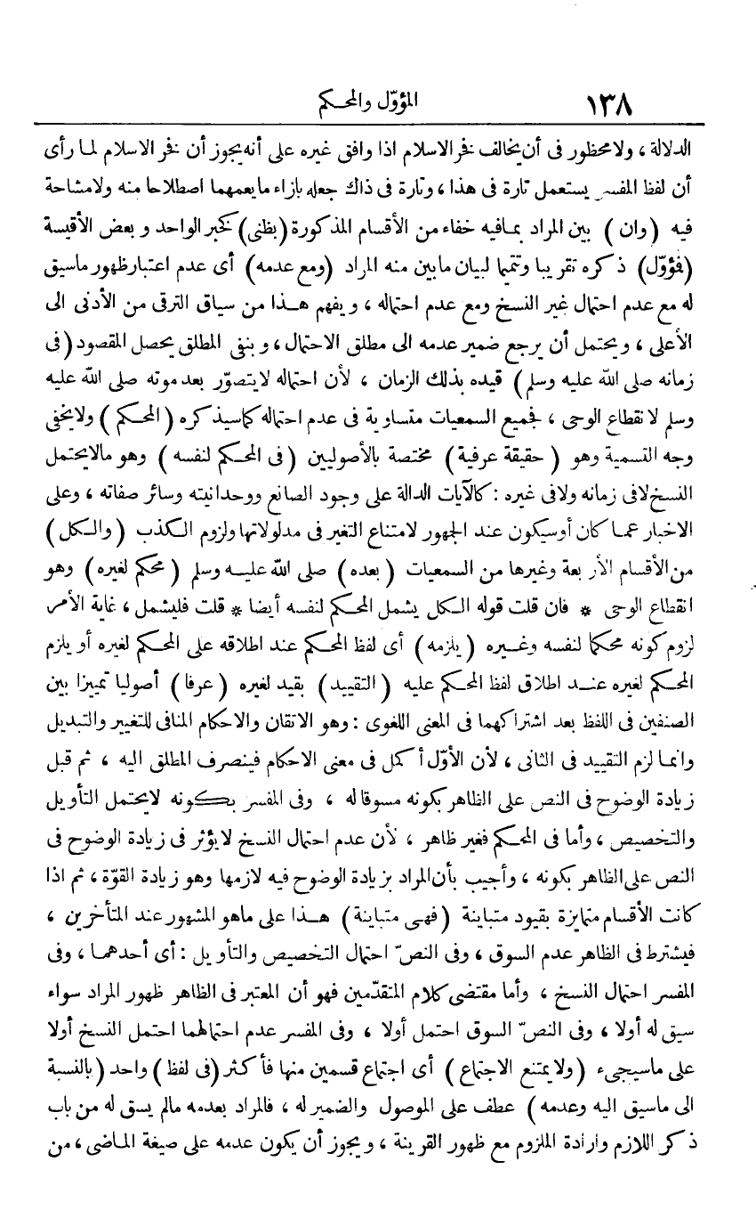 الدّلَالَة، وَلَا مَحْظُور فِي أَن يُخَالف فَخر الْإِسْلَام إِذا وَافق غَيره على أَنه يجوز أَن فَخر الْإِسْلَام لما رأى أَن لفظ الْمُفَسّر يسْتَعْمل تَارَة فِي هَذَا، وَتارَة فِي ذَاك جعله بِإِزَاءِ مَا يعمهما اصْطِلَاحا مِنْهُ وَلَا مشاحه فِيهِ (وان) بَين المُرَاد بِمَا فِيهِ خَفَاء من الْأَقْسَام الْمَذْكُورَة (بظني) كَخَبَر الْوَاحِد وَبَعض الأقيسة (فمؤول) ذكره تَقْرِيبًا وتتميما لبَيَان مَا بَين مِنْهُ المُرَاد (وَمَعَ عَدمه) أَي عدم اعْتِبَار ظُهُور مَا سيق لَهُ مَعَ عدم احْتِمَال غير النّسخ وَمَعَ عدم احْتِمَاله، وَيفهم هَذَا من سِيَاق الترقي من الْأَدْنَى إِلَى الْأَعْلَى، وَيحْتَمل أَن يرجع ضمير عَدمه إِلَى مُطلق الِاحْتِمَال، وبنفي الْمُطلق يحصل الْمَقْصُود (فِي زَمَانه صلى الله عَلَيْهِ وَسلم) قَيده بذلك الزَّمَان، لِأَن احْتِمَاله لَا يتَصَوَّر بعد مَوته صلى الله عَلَيْهِ وَسلم لانْقِطَاع الْوَحْي، فَجَمِيع السمعيات مُتَسَاوِيَة فِي عدم احْتِمَاله كَمَا سَيذكرُهُ (الْمُحكم) وَلَا يخفى وَجه التَّسْمِيَة وَهُوَ (حَقِيقَة عرفية) مُخْتَصَّة بالأصوليين (فِي الْمُحكم لنَفسِهِ) وَهُوَ مَا لَا يحْتَمل النّسخ لَا فِي زَمَانه وَلَا فِي غَيره: كالآيات الدَّالَّة على وجود الصَّانِع ووحدانيته وَسَائِر صِفَاته، وعَلى الْأَخْبَار عَمَّا كَانَ أَو سَيكون عِنْد الْجُمْهُور لِامْتِنَاع التَّغَيُّر فِي مدلولاتها وَلُزُوم الْكَذِب (وَالْكل) من الْأَقْسَام الْأَرْبَعَة وَغَيرهَا من السمعيات (بعده) صلى الله عَلَيْهِ وَسلم (مُحكم لغيره) وَهُوَ انْقِطَاع الْوَحْي فَإِن قلت قَوْله الْكل يَشْمَل الْمُحكم لنَفسِهِ أَيْضا قلت فليشمل، غَايَة الْأَمر لُزُوم كَونه محكما لنَفسِهِ وَغَيره (يلْزمه) أَي لفظ الْمُحكم عِنْد إِطْلَاقه على الْمُحكم لغيره أَو يلْزم الْمُحكم لغيره عِنْد إِطْلَاق لفظ الْمُحكم عَلَيْهِ (التَّقْيِيد) بِقَيْد لغيره (عرفا) أصوليا تمييزا بَين الصِّنْفَيْنِ فِي اللَّفْظ بعد اشتراكهما فِي الْمَعْنى اللّغَوِيّ: وَهُوَ الإتقان والإحكام الْمنَافِي للتغيير والتبديل وَإِنَّمَا لزم التَّقْيِيد فِي الثَّانِي، لِأَن الأول أكمل فِي معنى الإحكام فَيَنْصَرِف الْمُطلق إِلَيْهِ، ثمَّ قبل زِيَادَة الوضوح فِي النَّص على الظَّاهِر بِكَوْنِهِ مسوقا لَهُ، وَفِي الْمُفَسّر بِكَوْنِهِ لَا يحْتَمل التَّأْوِيل والتخصيص، وَأما فِي الْمُحكم فَغير ظَاهر، لِأَن عدم احْتِمَال النّسخ لَا يُؤثر فِي زِيَادَة الوضوح فِي النَّص على الظَّاهِر بِكَوْنِهِ، وَأجِيب بِأَن المُرَاد بِزِيَادَة الوضوح فِيهِ لازمها وَهُوَ زِيَادَة الْقُوَّة، ثمَّ إِذا كَانَت الْأَقْسَام متمايزة بقيود متباينة (فَهِيَ متباينة) هَذَا على مَا هُوَ الْمَشْهُور عِنْد الْمُتَأَخِّرين، فَيشْتَرط فِي الظَّاهِر عدم السُّوق، وَفِي النَّص احْتِمَال التَّخْصِيص والتأويل: أَي أَحدهمَا، وَفِي الْمُفَسّر احْتِمَال النّسخ، وَأما مُقْتَضى كَلَام الْمُتَقَدِّمين فَهُوَ أَن الْمُعْتَبر فِي الظَّاهِر ظُهُور المُرَاد سَوَاء سيق لَهُ أَولا، وَفِي النَّص السُّوق احْتمل أَولا، وَفِي الْمُفَسّر عدم احتمالهما احْتمل النّسخ أَولا على مَا سَيَجِيءُ (وَلَا يمْتَنع الِاجْتِمَاع) أَي اجْتِمَاع قسمَيْنِ مِنْهَا فَأكْثر (فِي لفظ) وَاحِد (بِالنِّسْبَةِ إِلَى مَا سيق إِلَيْهِ وَعَدَمه) عطف على الْمَوْصُول وَالضَّمِير لَهُ، فَالْمُرَاد بِعَدَمِهِ مَا لم يسق لَهُ من بَاب ذكر اللَّازِم وَإِرَادَة الْمَلْزُوم مَعَ ظُهُور الْقَرِينَة، وَيجوز أَن يكون عَدمه على صِيغَة الْمَاضِي، من