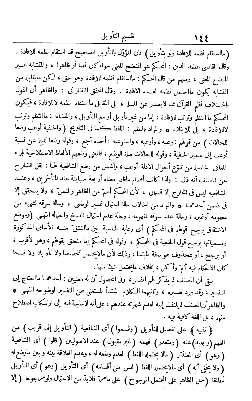 (مَا استقام نظمه للإفادة وَلَو بِتَأْوِيل) فَإِن المؤول بالتأويل الصَّحِيح قد استقام نظمه للإفادة. وَقَالَ القَاضِي عضد الدّين: الْمُحكم هُوَ المتضح الْمَعْنى سَوَاء كَانَ نصا أَو ظَاهرا، والمتشابه غير المتضح الْمَعْنى، وَمِنْهُم من قَالَ الْمُحكم: مَا استقام نظمه للإفادة وَهُوَ حق، لَكِن مَا يُقَابله من الْمُتَشَابه يكون مَا احْتمل نظمه لعدم الإفادة. وَقَالَ الْمُحَقق التَّفْتَازَانِيّ: وَالظَّاهِر أَن القَوْل باخْتلَاف نظم الْقُرْآن مِمَّا لَا يصدر عَن الْمُسلم، بل الْمُقَابل مَا استقام نظمه لَا للإفادة، فَيكون الْمُحكم مَا انتظم وترتب للإفادة: إِمَّا من غير تَأْوِيل أَو مَعَ التَّأْوِيل، والمتشابه: مَا انتظم وترتب لَا للإفادة، بل للابتلاء وَالْمرَاد بالنظم: اللَّفْظ كَمَا فِي التَّلْوِيح (وَالْحَنَفِيَّة أوعب وضعا للحالات) من قَوْلهم: وعبه، وأوعبه، واستوعبه: أَخذه أجمع، وَقَوله وضعا تَمْيِيز عَن نِسْبَة أوعب إِلَى ضمير الْحَنَفِيَّة، وَقَوله للحالات صلَة الْوَضع، فَالْمَعْنى وضعهم الْأَلْفَاظ الاصطلاحية بِإِزَاءِ الْمعَانِي الْحَاصِلَة من تنوع أَحْوَال الْأَدِلَّة أوعب، وأشمل من وضع الشَّافِعِيَّة لَهَا: نقل الشَّارِح عَن المُصَنّف أَنه قَالَ: وَلذَا كَانَ ê أَقسَام مَا ظهر مَعْنَاهُ أَرْبَعَة متباينة عِنْد الْمُتَأَخِّرين، وَعند الشَّافِعِيَّة لَيْسَ فِي الْخَارِج إِلَّا قِسْمَانِ، لِأَن الْمُحكم أَعم من الظَّاهِر وَالنَّص، وَلَا يتَحَقَّق إِلَّا فِي ضمن أَحدهمَا وَالْمرَاد من الْحَالَات حَالَة احْتِمَال غير الوضعي، وَحَالَة سوقه لشَيْء من مَفْهُومه أَو غَيره، وَحَالَة عدم سوقه لمفهومه، وَحَالَة عدم احْتِمَال النّسخ واحتماله انْتهى (وَمَوْضِع الِاشْتِقَاق يرجح قَوْلهم فِي الْمُحكم) أَي رِعَايَة الْمُنَاسبَة بَين مَا اشتق مِنْهُ الْأَسَامِي الْمَذْكُورَة ومسمياتها يرجح قَول الْحَنَفِيَّة فِي الْمُحكم، وَقَوله فِي الْمُحكم إِمَّا مُتَعَلق بقَوْلهمْ، وَهُوَ الْأَقْرَب، أَو يرجح، أَو بِمَحْذُوف هُوَ صفة الْمُبْتَدَأ، وَذَلِكَ لِأَن مَا لَا يحْتَمل تَخْصِيصًا وَلَا تَأْوِيلا وَلَا نسخا كَأَن الْأَحْكَام فِيهِ أتم وأكمل، بِخِلَاف مَا يحْتَمل شَيْئا مِنْهَا.