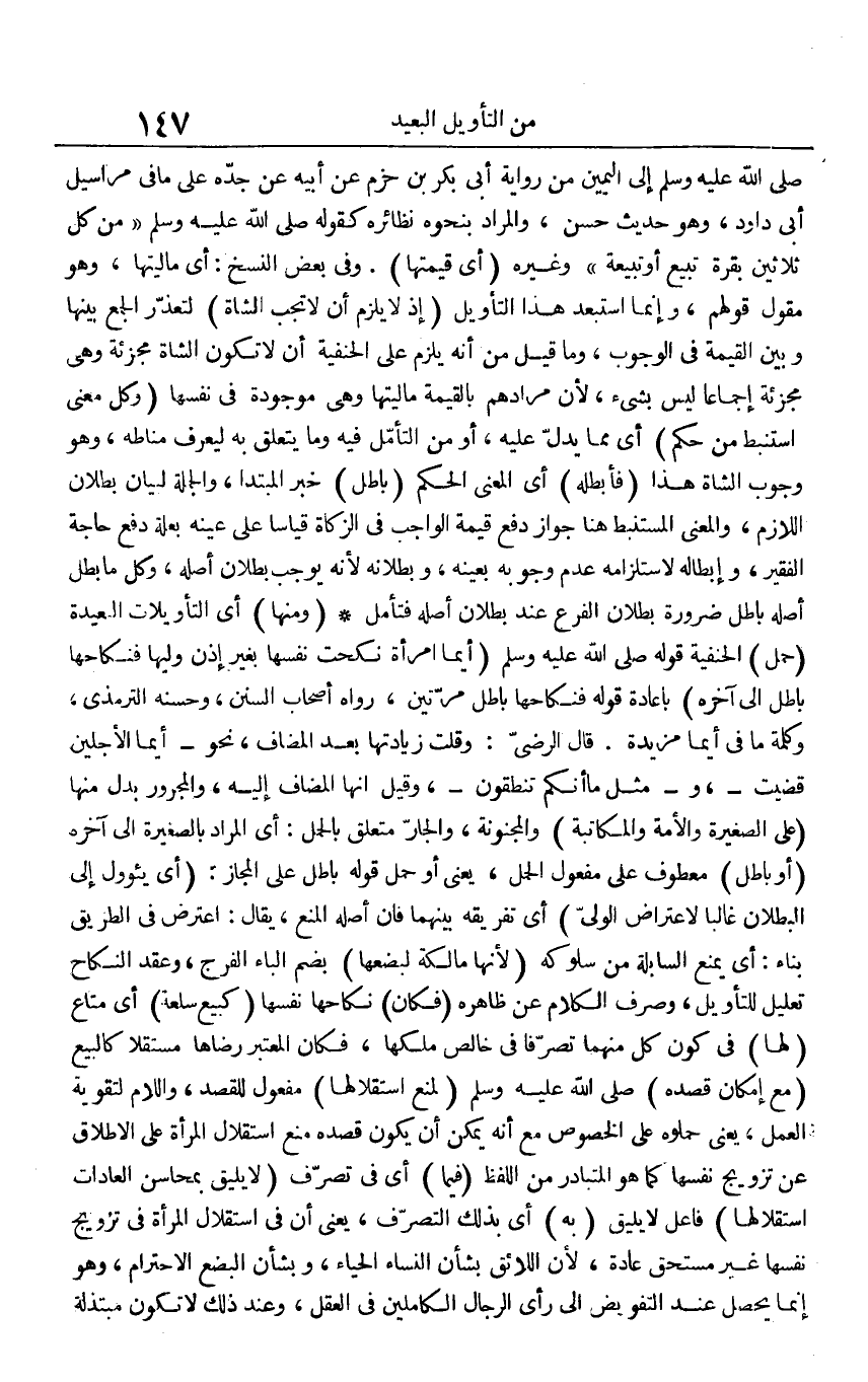 صلى الله عليه وسلم إلى اليمين من رواية أبي بكر بن حزم عن أبه عن جده على ما في مراسيل أبي داود، وهو حديث حسن، والمراد بنحوه نظائره كقوله صلى الله عليه وسلم " من كل ثلاثين بقرة تبيع أو تبيعة " وغيره (أي قيمتها). وفي بعض النسخ: أي ماليتها، وهو مقول قولهم، وإنما استبعد هذا التأويل (إذ لا يلزم أن لا تجب الشاة) لتعذر الجمع بينها وبين القيمة في الوجوب، وما قيل من أنه يلزم على الحنفية أن لا تكون الشاة مجزئة وهي مجزئة إجماعا ليس بشيء، لأن مرادهم بالقيمة ماليتها وهي موجودة في نفسها (وكل معنى استنبط من حكم) أي مما يدل عليه، أو من التأمل فيه وما يتعلق به ليعرف مناطه، وهو وجوب الشاة هذا (فأبطله) أي المعنى الحكم (باطل) خبر المبتدأ، والجملة لبيان بطلان اللازم، والمعنى المستنبط هنا جواز دفع قيمة الواجب في الزكاة قياسيا على عينه بعلة دفع حاجة الفقير، وإبطاله لاستلزامه عدم وجوبه بعينه، وبطلانه لأنه يوجب بطلان أصله، وكل ما بطل أصله باطل ضرورة بطلان الفرع عند بطلان أصله فتأمل، (ومنها) أي التأويلات البعيدة (حمل) الحنفية قوله صلى الله عليه وسلم (أيمان امرأة نكحت نفسها بغير إذن وليها فنكاحها باطل إلى آخره) بإعادة قوله فنكاحها باطل مرتين، رواه أصحاب السنن، وحسنه الترمذي، وكلمة ما في أيما مزيدة. قال الرضي: وقلت زيادتها بعد المضاف، نحو - أيما الأجلين قضيت -، و - مثل ما أنكم تنطقون - وقيل إنها المضاف إليه، والمجرور بدل منها (على الصغيرة والأمة والمكاتبة) والمجنونة، والجار متعلق بالجمل: أي المراد بالصغيرة إلى آخره (أو باطل) معطوف على مفعول الحمل، يعني أو حمل قوله باطل على المجاز: (أي يؤول إلى البطلان غالبا لاعتراض الولي) أي تفريقه بينهما فإن أصله المنع، يقال: اعترض في الطريق بتاء: أي يمنع السابلة من سلوكه (لأنها مالكة لبعضها) بضم الباء الفرج، وعقد النكاخ تعليل للتأويل، وصرف الكلام عن ظاهره (فكان) نكاحها نفسها (كبيع سلعة) أي متاع (لها) في كون كل منهما تصرفا في خالص ملكها، فكان المعتبر رضاها مستقلا كالبيع (مع إمكان قصده) صلى الله عليه وسلم (لمنع استقلالها) مفعول للقصد، واللام لتقوية العمل، يعني حملوه على الخصوص مع أنه يمكن أن يكون قصده منع استقلال المرأة على الاطلاق على تزويج نفسها كما هو المتبادر من اللفظ (فيما) أي في تصرف (لا يليق بمحاسن العادات استقلالها) فاعل لا يليق (به) أي بذلك التصرف، يعني أن في استقلال المرأة في تزويج نفسها غير مستحق عادة، لأن اللائق بشأن النساء الحياء، وبشأن البضع الاحترام، وهو إنما يحصل عند التفويض إلى رأي الرجال الكاملين في العقل، وعند ذلك لا تكون مبتذلة