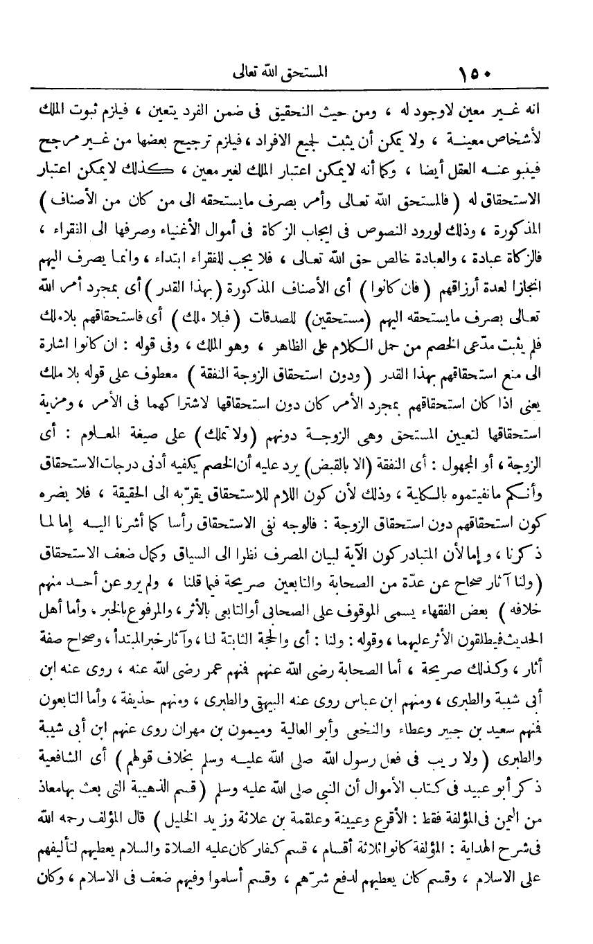 إِنَّه غير معِين لَا وجود لَهُ، وَمن حَيْثُ التَّحْقِيق فِي ضمن الْفَرد يتَعَيَّن، فَيلْزم ثُبُوت الْملك لأشخاص مُعينَة، وَلَا يُمكن أَن يثبت لجَمِيع الْأَفْرَاد، فَيلْزم تَرْجِيح بَعْضهَا من غير مُرَجّح فينبو عَنهُ الْعقل أَيْضا، وكما أَنه لَا يُمكن اعْتِبَار الْملك لغير معِين، كَذَلِك لَا يُمكن اعْتِبَار الِاسْتِحْقَاق لَهُ (فالمستحق الله تَعَالَى وَأمر بِصَرْف مَا يسْتَحقّهُ إِلَى من كَانَ من الْأَصْنَاف الْمَذْكُورَة، وَذَلِكَ لوُرُود النُّصُوص فِي إِيجَاب الزَّكَاة فِي أَمْوَال الْأَغْنِيَاء وصرفها إِلَى الْفُقَرَاء، فالزكاة عبَادَة، وَالْعِبَادَة خَالص حق الله تَعَالَى، فَلَا يجب للْفُقَرَاء ابْتِدَاء، وَإِنَّمَا يصرف إِلَيْهِم إنجازا لعدة أَرْزَاقهم (فَإِن كَانُوا) أَي الْأَصْنَاف الْمَذْكُورَة (بِهَذَا الْقدر) أَي بِمُجَرَّد أَمر الله تَعَالَى بِصَرْف مَا يسْتَحقّهُ إِلَيْهِم (مستحقين) للصدقات (فبلا ملك) أَي فاستحقاقهم بِلَا ملك فَلم يثبت مدعى الْخصم من حمل الْكَلَام على الظَّاهِر، وَهُوَ الْملك، وَفِي قَوْله: إِن كَانُوا إِشَارَة إِلَى منع استحقاقهم بِهَذَا الْقدر (وَدون اسْتِحْقَاق الزَّوْجَة النَّفَقَة) مَعْطُوف على قَوْله بِلَا ملك يَعْنِي إِذا كَانَ استحقاقهم بِمُجَرَّد الْأَمر كَانَ دون اسْتِحْقَاقهَا لاشْتِرَاكهمَا فِي الْأَمر، ومزية اسْتِحْقَاقهَا لتعيين الْمُسْتَحق وَهِي الزَّوْجَة دونهم (وَلَا تملك) على صِيغَة الْمَعْلُوم: أَي الزَّوْجَة، أَو الْمَجْهُول: أَي النَّفَقَة (إِلَّا بِالْقَبْضِ) يرد عَلَيْهِ أَن الْخصم يَكْفِيهِ أدنى دَرَجَات الِاسْتِحْقَاق وأنكم مَا نفيتموه بِالْكُلِّيَّةِ، وَذَلِكَ لِأَن كَون اللَّام لاسْتِحْقَاق يقربهُ إِلَى الْحَقِيقَة، فَلَا يضرّهُ كَون استحقاقهم دون اسْتِحْقَاق الزَّوْجَة: فَالْوَجْه نفي الِاسْتِحْقَاق رَأْسا كَمَا أَشَرنَا إِلَيْهِ إِمَّا لما ذكرنَا، وَإِمَّا لِأَن الْمُتَبَادر كَون الْآيَة لبَيَان الْمصرف نظرا إِلَى السِّيَاق وَكَمَال ضعف الِاسْتِحْقَاق (وَلنَا آثَار صِحَاح عَن عدَّة من الصَّحَابَة وَالتَّابِعِينَ صَرِيحَة فِيمَا قُلْنَا، وَلم يرو عَن أحد مِنْهُم خلَافَة) بعض الْفُقَهَاء يُسمى الْمَوْقُوف على الصَّحَابِيّ أَو التَّابِعِيّ بالأثر، وَالْمَرْفُوع بالْخبر، وَأما أهل الحَدِيث فيطلقون الْأَثر عَلَيْهِمَا، وَقَوله: وَلنَا: أَي وَالْحجّة الثَّابِتَة لنا، وآثار خبر الْمُبْتَدَأ، وصحاح صفة أثار، وَكَذَلِكَ صَرِيحَة، أما الصَّحَابَة رَضِي الله عَنْهُم فَمنهمْ عمر رَضِي الله عَنهُ، روى عَنهُ ابْن أبي شيبَة والطبري، وَمِنْهُم ابْن عَبَّاس روى عَنهُ الْبَيْهَقِيّ والطبري، وَمِنْهُم حُذَيْفَة، وَأما التابعون فَمنهمْ سعيد بن جُبَير وَعَطَاء وَالنَّخَعِيّ وَأَبُو الْعَالِيَة وَمَيْمُون بن مهْرَان روى عَنْهُم ابْن أبي شيبَة والطبري (وَلَا ريب فِي فعل رَسُول الله صلى الله عَلَيْهِ وَسلم بِخِلَاف قَوْلهم) أَي الشَّافِعِيَّة ذكر أَبُو عبيد فِي كتاب الْأَمْوَال أَن النَّبِي صلى الله عَلَيْهِ وَسلم (قسم الذهيبة الَّتِي بعث بهَا معَاذ من الْيمن فِي الْمُؤَلّفَة فَقَط: الْأَقْرَع وعيينة وعلقمة بن علاثة وَزيد الْخَلِيل) قَالَ الْمُؤلف رَحمَه الله فِي شرح الْهِدَايَة: الْمُؤَلّفَة كَانُوا ثَلَاثَة أَقسَام، قسم كفار كَانَ صلى الله عَلَيْهِ وَسلم يعطيهم لتأليفهم على الْإِسْلَام، وَقسم كَانَ يعطيهم لدفع شرهم، وَقسم أَسْلمُوا وَفِيهِمْ ضعف فِي الْإِسْلَام، وَكَانَ