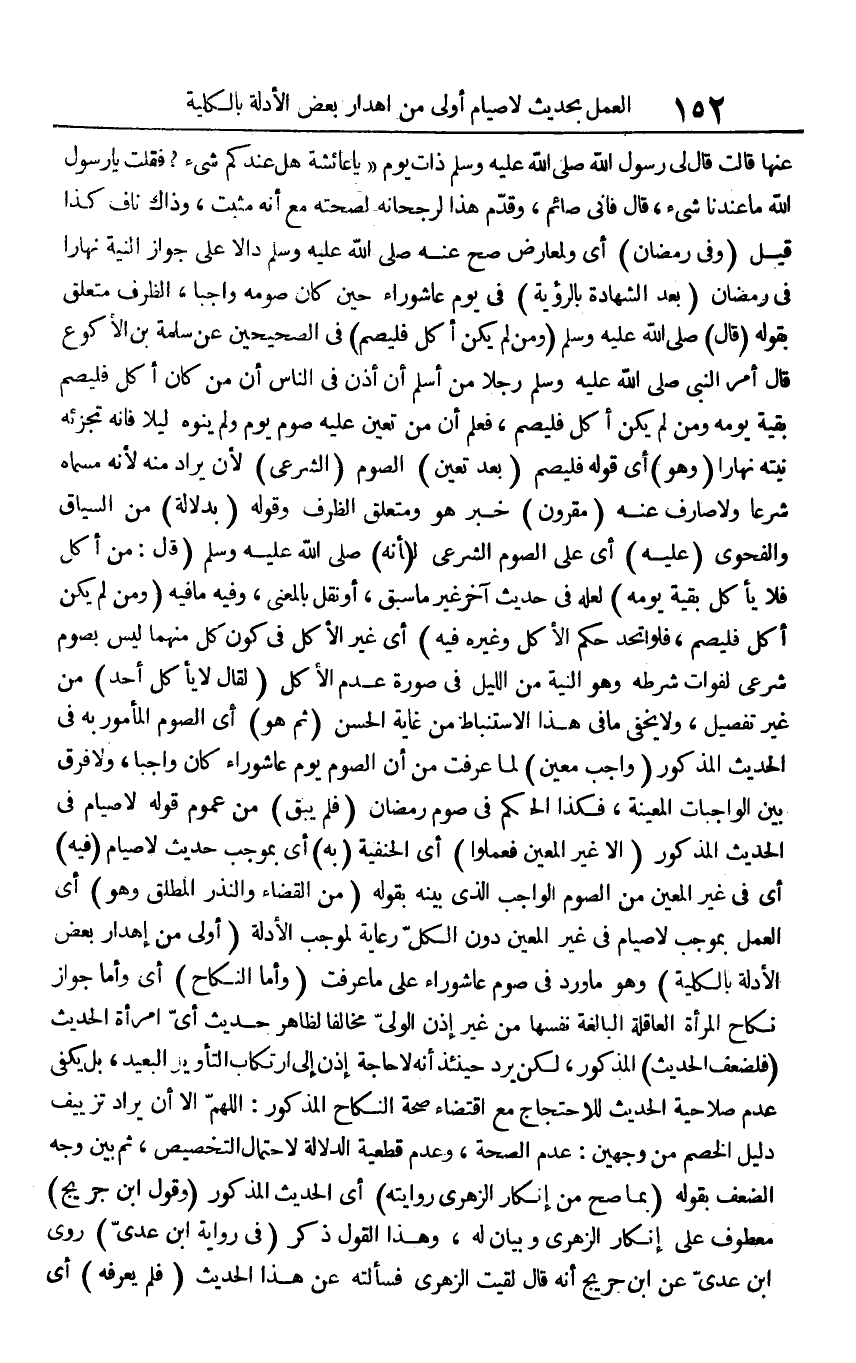 عنها قالت قال لي رسول الله صلى الله عليه وسلم ذات يوم " يا عائشة هل عندكم شيء؟ فقلت يا رسول الله ما عندنا شئ، قال فإني صائم، وقدم هذا لرجحانه لصحته مع أنه مثبت، وذاك ناف كذا قيل (وفي رمضان) أي ولمعارض صح عنه صلى الله عليه وسلم دالا على جواز النية نهارا في رمضان (بعد الشهادة بالرؤية) في يوم عاشوراء حين كان صومه واجبا، الظرف متعلق بقوله (قال) صلى الله عليه وسلم (ومن لم يكن أكل فليصم) في الصحيحين عن سلمة بن الأكوع قال أمر النبي صلى الله عليه وسلم رجلا من أسلم أن أذن في الناس من كان أكل فليصم بقية يومه ومن لم يكن أكل فليصم، فعلم أن من تعين عليه صوم يوم ولم ينوه ليلا فإنه تجزئه نيته نهارا (وهو) أي قوله فليصم (بعد تعين) الصوم (الشرعي) لأن يراد منه لأنه مسماه شرعا ولا صارف عنه (مقرون) خبر هو ومتعلق الظرف وقوله (بدلالة) من السياق والفحوي (عليه) أي على الصوم الشراعي لـ (أنه) صلى الله عليه وسلم (قال: من أكل فلا يأكل بقية يومه) لعله في حديث آخر غير ما سبق، أو نقل بالمعنى، وفيه ما فيه (ومن لم يكن أكل فليصم، فلو اتحد حكم الأكل وغيره فيه) أي غير الأكل في كون كل منهما ليس بصوم شرعي لفوات شرطه وهو النية من الليل في صورة عدم الأكل (لقال لا يأكل أحد) من غير تفصيل، ولا يخفى ما في هذه الاستنباط من غاية الحسن (ثم هو) أي الصوم المأمور به في الحديث المذكور (واجب معين) لما عرفت من ان الصوم يوم عاشوراء كان واجبا، ولا فرق بين الواجبات المعينة، فكذا الحكم في صوم رمضان (فلم يبق) من عموم قوله لا صيام في الحديث المذكور (إلا غير المعين فعملوا) أي الحنفية (به) أي بموجب حديث لا صيام (فيه) أي في غير المعين من الصوم الواجب الذي بينه بقوله (من القضتء والنذر المطلق وهو) أي العمل بموجب لا صيام في غير المعين دون الكل رعاية لموجب الأدلة (أولى من إهدار بعض الأدلة بالكلية) وهو ما ورد في صوم عاشوراء على ما عرفت (وأما النكاح) أي وأما جواز نكاح المرأة العاقلة البالغة نفسها من غير إذن الولي مخالفا لظاهر حديث أي امرأة الحديث (فلضعف الحديث) المذكور، لكن يرد حينئذ أنه لا حاجة إذن إلى ارتكاب التأويل البعيد، بل يكفي عدم صلاحية الحديث للاحتاج مع اقتضاء صحة النكاح المذكور: اللهم إلا أن يراد تزييف دليل الخصم من وجهين: عدم الصحة، وعدم قطعية الدلالة لاحتمال التخصيص، ثم بين وجه الضعف بقوله (بما صح من إنكار الزهري روايته) أي الحديث المذكور (وقول ابن جريج) معطوف على إنكار الزهري وبيان له، وهذا القول ذكر (في رواية ابن عدى) روى ابن عدى عن ابن جريج أنه قال لقيت الزهرى فسألته عن هذا الحديث (فلم يعرفه) أي