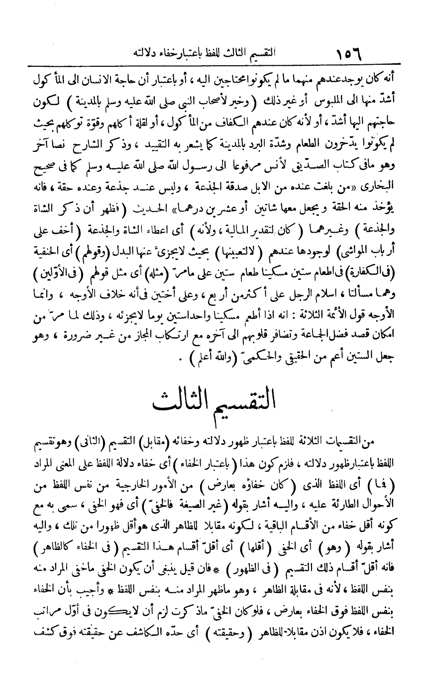من التقسيمات الثَّلَاثَة للفظ بِاعْتِبَار ظُهُور دلَالَته وخفائه (مُقَابل) التَّقْسِيم (الثَّانِي) وَهُوَ تَقْسِيم اللَّفْظ بِاعْتِبَار ظُهُور دلَالَته، فَلَزِمَ كَون هَذَا (بِاعْتِبَار الخفاء) أَي خَفَاء دلَالَة اللَّفْظ على الْمَعْنى المُرَاد (فَمَا) أَي اللَّفْظ الَّذِي (كَانَ خفاؤه بِعَارِض) من الْأُمُور الخارجية من نفس اللَّفْظ من الْأَحْوَال الطارئة عَلَيْهِ، وَإِلَيْهِ أَشَارَ بقوله (غير الصِّيغَة فالخفي) أَي فَهُوَ الْخَفي، سمي بِهِ مَعَ كَونه أقل خَفَاء من الْأَقْسَام الْبَاقِيَة، لكَونه مُقَابلا للظَّاهِر الَّذِي هُوَ أقل ظهورا من تِلْكَ، وَإِلَيْهِ أَشَارَ بقوله (وَهُوَ) أَي الْخَفي (أقلهَا) أَي أقل أَقسَام هَذَا التَّقْسِيم (فِي الخفاء كَالظَّاهِرِ) فَإِنَّهُ أقل أَقسَام ذَلِك التَّقْسِيم (فِي الظُّهُور) فَإِن قيل يَنْبَغِي أَن يكون الْخَفي مَا خَفِي المُرَاد مِنْهُ بِنَفس اللَّفْظ، لِأَنَّهُ فِي مُقَابلَة الظَّاهِر، وَهُوَ مَا ظهر المُرَاد مِنْهُ بِنَفس اللَّفْظ وَأجِيب بِأَن الخفاء بِنَفس اللَّفْظ فَوق الخفاء بِعَارِض، فَلَو كَانَ الْخَفي مَا ذكرت لزم أَن لَا يكون فِي أول مَرَاتِب الخفاء، فَلَا يكون إِذن مُقَابلا للظَّاهِر (وَحَقِيقَته) أَي حَده الكاشف عَن حَقِيقَته فَوق كشف