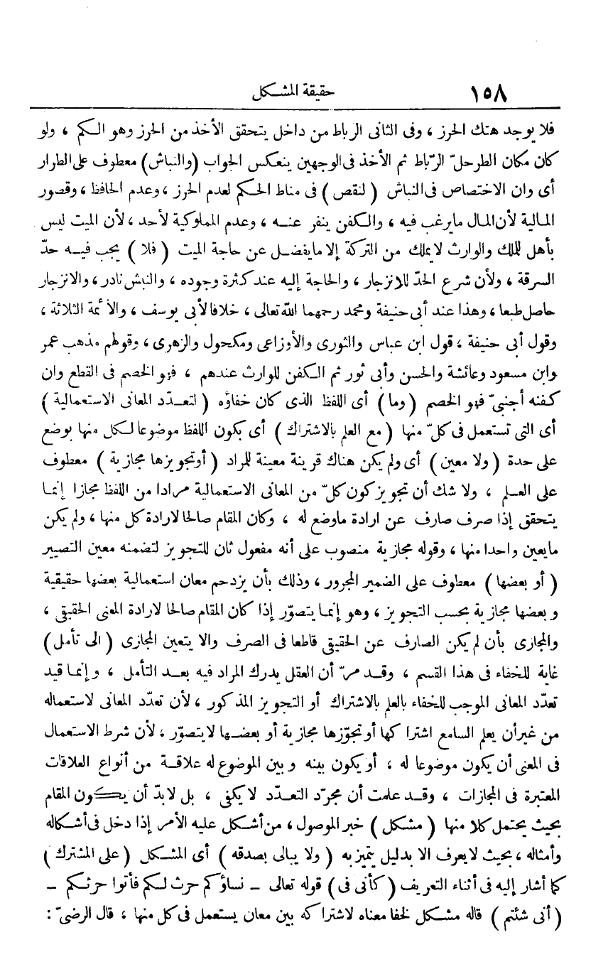 فَلَا يُوجد هتك الْحِرْز، وَفِي الثَّانِي الرِّبَاط من دَاخل يتَحَقَّق الْأَخْذ من الْحِرْز وَهُوَ الْكمّ، وَلَو كَانَ مَكَان الطر حل الرِّبَاط ثمَّ الْأَخْذ فِي الْوَجْهَيْنِ ينعكس الْجَواب (والنباش) مَعْطُوف على الطرار أَي وَإِن الِاخْتِصَاص فِي النباش (لنَقص) فِي منَاط الحكم لعدم الْحِرْز، وَعدم الْحَافِظ، وقصور الْمَالِيَّة لِأَن المَال مَا يرغب فِيهِ، والكفن ينفر عَنهُ، وَعدم المملوكية لأحد، لِأَن الْمَيِّت لَيْسَ بِأَهْل للْملك وَالْوَارِث لَا يملك من التَّرِكَة إِلَّا مَا يفضل عَن حَاجَة الْمَيِّت (فَلَا) يجب فِيهِ حد السّرقَة، وَلِأَن شرع الْحَد للانزجار، وَالْحَاجة إِلَيْهِ عِنْد كَثْرَة وجوده، والنبش نَادِر، والانزجار حَاصِل طبعا، وَهَذَا عِنْد أبي حنيفَة وَمُحَمّد رحمهمَا الله تَعَالَى، خلافًا لأبي يُوسُف، وَالْأَئِمَّة الثَّلَاثَة، وَقَول أبي حنيفَة، قَول ابْن عَبَّاس وَالثَّوْري وَالْأَوْزَاعِيّ وَمَكْحُول وَالزهْرِيّ، وَقَوْلهمْ مَذْهَب عمر وَابْن مَسْعُود وَعَائِشَة وَالْحسن وَأبي ثَوْر ثمَّ الْكَفَن للْوَارِث عِنْدهم، فَهُوَ الْخصم فِي الْقطع وَإِن كَفنه أَجْنَبِي فَهُوَ الْخصم (وَمَا) أَي اللَّفْظ الَّذِي كَانَ خفاؤه (لتَعَدد الْمعَانِي الاستعمالية) أَي الَّتِي تسْتَعْمل فِي كل مِنْهَا (مَعَ الْعلم بالاشتراك) أَي بِكَوْن اللَّفْظ مَوْضُوعا لكل مِنْهَا بِوَضْع على حِدة (وَلَا معِين) أَي وَلم يكن هُنَاكَ قرينَة مُعينَة للمراد (أَو تجويزها مجازية) مَعْطُوف على الْعلم، وَلَا شكّ أَن تَجْوِيز كَون كل من الْمعَانِي الاستعمالية مرَادا من اللَّفْظ مجَازًا إِنَّمَا يتَحَقَّق إِذا صرف صَارف عَن إِرَادَة مَا وضع لَهُ، وَكَانَ الْمقَام صَالحا لإِرَادَة كل مِنْهَا، وَلم يكن مَا يعين وَاحِدًا مِنْهَا، وَقَوله مجازية مَنْصُوب على أَنه مفعول ثَان للتجويز لتَضَمّنه معِين التصيير (أَو بَعْضهَا) مَعْطُوف على الضَّمِير الْمَجْرُور، وَذَلِكَ بِأَن يزدحم معَان استعمالية بَعْضهَا حَقِيقِيَّة وَبَعضهَا مجازية بِحَسب التجويز، وَهُوَ إِنَّمَا يتَصَوَّر إِذا كَانَ الْمقَام صَالحا لإِرَادَة الْمَعْنى الْحَقِيقِيّ، والمجازي بِأَن لم يكن الصَّارِف عَن الْحَقِيقِيّ قَاطعا فِي الصّرْف وَإِلَّا يتَعَيَّن الْمجَازِي (إِلَى تَأمل) غَايَة للخفاء فِي هَذَا الْقسم، وَقد مر أَن الْعقل يدْرك المُرَاد فِيهِ بعد التَّأَمُّل، وَإِنَّمَا قيد تعدد الْمعَانِي الْمُوجب للخفاء بِالْعلمِ بالاشتراك أَو التجويز الْمَذْكُور، لِأَن تعدد الْمعَانِي لاستعماله من غير أَن يعلم السَّامع اشتراكها أَو تجوزها مجازية أَو بَعْضهَا لَا يتَصَوَّر، لِأَن شَرط الِاسْتِعْمَال فِي الْمَعْنى أَن يكون مَوْضُوعا لَهُ، أَو يكون بَينه وَبَين الْمَوْضُوع لَهُ علاقَة من أَنْوَاع العلاقات الْمُعْتَبرَة فِي المجازات، وَقد علمت أَن مُجَرّد التَّعَدُّد لَا يَكْفِي، بل لَا بُد أَن يكون الْمقَام بِحَيْثُ يحْتَمل كلا مِنْهَا (مُشكل) خبر الْمَوْصُول، من أشكل عَلَيْهِ الْأَمر إِذا دخل فِي أشكاله وَأَمْثَاله، بِحَيْثُ لَا يعرف إِلَّا بِدَلِيل يتَمَيَّز بِهِ (وَلَا يُبَالِي بصدقه) أَي الْمُشكل (على الْمُشْتَرك) كَمَا أَشَارَ إِلَيْهِ فِي أثْنَاء التَّعْرِيف (كَأَنِّي فِي) قَوْله تَعَالَى - {نِسَاؤُكُمْ حرث لكم فَأتوا حَرْثكُمْ} - (أَنى شِئْتُم) قَالَه مُشكل لخفا مَعْنَاهُ لاشتراكه بَين معَان يسْتَعْمل فِي كل مِنْهَا، قَالَ الرضي:
