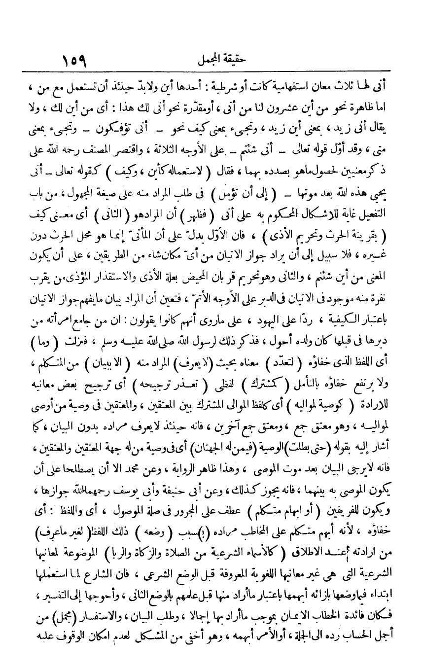 أنى لها ثلاث معان استفهامية كانت أو شرطية: أحدها أين ولابد حينئذ أن تستعمل مع من، أما ظاهرة نحو من أين عشرون لنا من أنى، أو مقدرة نحو أني لك هذا: أي من أين لك، ولا يقال أني زيد، بمعنى أين زيد، وتجيء بمعنى كيف نحو - أي تؤفكون - وتجيء بمعنى متى، وقد أول قوله تعالى - أنى شئتم - على الأوجه الثلاثة، واقتصر المصنف رحمه الله على ذكر معنيين لحصول ما هو بصدده بهما، فقال (لاستعماله كأين وكيف) كقوله تعالى - أني يحيى هذه الله بعد موتها - (إلى أن تؤمل) في طلب المراد منه على صيغة المجهول، من باب التفعيل غاية للإشكال المحكوم به على أني (فظهر) أن المراد هو (الثاني) أي معنى كيف (بقرينة الحرث وتحريم الأذى)، فإن الأول يدل على أن المأتي إنما هو محل الحرث دون غيره، فلا سبيل إلى أن يراد جواز الاتيان من أي مكان شاء من الطريقين، على أن يكون المعنى من أين شئتم، والثاني وهو تحريم قربان المحيض بعلة الأذى والاستقذار المؤذي من يقرب نفرة منه موجود في الاتيان في الدبر على الأوجه الأتم، فتعين أن المراد بيان ما يفهم جواز الاتيان باعتبار الكيفية، ردا على اليهود، على ما روي أنهم كانوا يقولون: إن من جامع امرأته من دبرها في قبلها كان كان ولده أحول، فذكر ذلك لرسول الله صلى الله عليه وسلم، فنزلت (وما) أي اللفظ الذي خفاؤه بالتأمل (كمشترك) لفظي (تعذر ترجيحه) أي ترجيح بعض معانيه للإرادة (كوصية لمواليه) أي كلفظ الموالي المشترك بين المعتقين، والمعتقين في وصية من أوصى لمواليه، وهو معتق جمع، ومعتق جمع آخرين، فإنه حينئذ لا يعرف مراده بدون البيان، كما أشار إليه بقوله (حتى بطلت) الوصية (فيمن له الجهتان) أي في وصية من له جهة المعتقين والمعتقين، فإنه لا يرجى البيان بعد موت الموصى، وهذا ظاهر الرواية، وعن محمد إلا أن يصلطحا على أن يكون الموصى به بينهما، فإنه يجوز كذلك، وعن أبي حنيفة وأبي يوسف رحمهما الله جوازها، ويكون للفريقين (أو ابهام متكلم) عطف على المجرور في صلة الموصول، أي واللفظ: أي خفاؤه، لأنه أبهم متكلم على المخاطب مراده (بـ) ـسبب (وضعه) ذلك اللفظ (لغير ما عرف) من إرادته عند الإطلاق (كالأسماء الشرعية من الصلاة والزكاة والربا) الموضوعة لمعانيها الشرعية التي هي غير معانيها المعروفة قبل الوضع الشرعي، فإن الشارع لما استعملها ابتداء فيما وضعها بازائه أبهمها باعتبار ما أراد منها قبل علمهم بالوضع الثاني، وأحوجها إلى التفسير، فكأن فائدة الخطاب الإيمان بموجب ما أراد بها إجمالا، وطلب البيان، والاستفسار (مجمل) من أجمل الحساب رده إلى الجملة، أو الأمر أبهمه، وهو أخفى من المشكل لعدم امكان الوقوف عليه