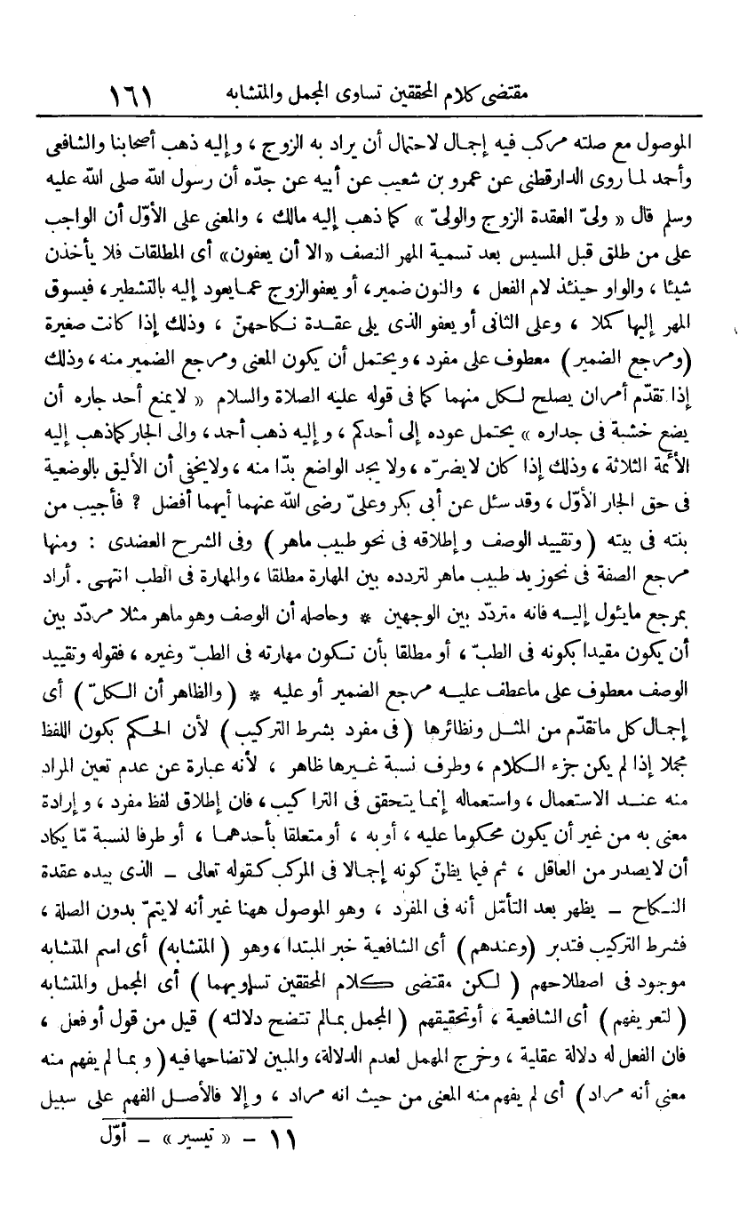 الْمَوْصُول مَعَ صلته مركب فِيهِ إِجْمَال لاحْتِمَال أَن يُرَاد بِهِ الزَّوْج، وَإِلَيْهِ ذهب أَصْحَابنَا وَالشَّافِعِيّ وَأحمد لما روى الدَّارَقُطْنِيّ عَن عَمْرو بن شُعَيْب عَن أَبِيه عَن جده أَن رَسُول الله صلى الله عَلَيْهِ وَسلم قَالَ " ولي الْعقْدَة الزَّوْج وَالْوَلِيّ " كَمَا ذهب إِلَيْهِ مَالك، وَالْمعْنَى على الأول أَن الْوَاجِب على من طلق قبل الْمَسِيس بعد تَسْمِيَة الْمهْر النّصْف " إِلَّا أَن يعفون " أَي المطلقات فَلَا يَأْخُذن شَيْئا، وَالْوَاو حِينَئِذٍ لَام الْفِعْل، وَالنُّون ضمير، أَو يعْفُو الزَّوْج عَمَّا يعود إِلَيْهِ بالتشطير، فيسوق الْمهْر إِلَيْهَا كملا، وعَلى الثَّانِي أَو يعْفُو الَّذِي يَلِي عقده نِكَاحهنَّ، وَذَلِكَ إِذا كَانَت صَغِيرَة (ومرجع الضَّمِير) مَعْطُوف على مُفْرد، وَيحْتَمل أَن يكون الْمَعْنى ومرجع الضَّمِير مِنْهُ، وَذَلِكَ إِذا تقدم أَمْرَانِ يصلح لكل مِنْهُمَا كَمَا فِي قَوْله صلى الله عَلَيْهِ وَسلم " لَا يمْنَع أحد جَاره أَن يضع خَشَبَة فِي جِدَاره " يحْتَمل عوده إِلَى أحدكُم، وَإِلَيْهِ ذهب أَحْمد، وَإِلَى الْجَار كَمَا ذهب إِلَيْهِ الْأَئِمَّة الثَّلَاثَة، وَذَلِكَ إِذا كَانَ لَا يضرّهُ، وَلَا يجد الْوَاضِع بدا مِنْهُ، وَلَا يخفى أَن الْأَلْيَق بالوضعية فِي حق الْجَار الأول، وَقد سُئِلَ عَن أبي بكر وَعلي رَضِي الله عَنْهُمَا أَيهمَا أفضل؟ فَأُجِيب من بنته فِي بَيته (وَتَقْيِيد الْوَصْف وإطلاقه فِي نَحْو طَبِيب ماهر) وَفِي الشَّرْح العضدي: وَمِنْهَا مرجع الصّفة فِي نَحْو زيد طَبِيب ماهر لتردده بَين المهارة مُطلقًا، والمهارة فِي الطِّبّ انْتهى. أَرَادَ بمرجع مَا يَئُول إِلَيْهِ فَإِنَّهُ مُتَرَدّد بَين الْوَجْهَيْنِ وَحَاصِله أَن الْوَصْف وَهُوَ ماهر مثلا مردد بَين أَن يكون مُقَيّدا بِكَوْنِهِ فِي الطِّبّ، أَو مُطلقًا بِأَن تكون مهارته فِي الطِّبّ وَغَيره، فَقَوله وَتَقْيِيد الْوَصْف مَعْطُوف على مَا عطف عَلَيْهِ مرجع الضَّمِير أَو عَلَيْهِ (وَالظَّاهِر أَن الْكل) أَي إِجْمَال كل مَا تقدم من الْمثل ونظائرها (فِي مُفْرد بِشَرْط التَّرْكِيب) لِأَن الحكم بِكَوْن اللَّفْظ مُجملا إِذا لم يكن جُزْء الْكَلَام، وطرف نِسْبَة غَيرهَا ظَاهر، لِأَنَّهُ عبارَة عَن عدم تعين المُرَاد مِنْهُ عِنْد الِاسْتِعْمَال، واستعماله إِنَّمَا يتَحَقَّق فِي التراكيب، فَإِن إِطْلَاق لفظ مُفْرد، وَإِرَادَة معنى بِهِ من غير أَن يكون مَحْكُومًا عَلَيْهِ، أَو بِهِ، أَو مُتَعَلقا بِأَحَدِهِمَا، أَو طرفا لنسبة مَا يكَاد أَن لَا يصدر من الْعَاقِل، ثمَّ فِيمَا يظنّ كَونه إِجْمَالا فِي الْمركب كَقَوْلِه تَعَالَى - {الَّذِي بِيَدِهِ عقدَة النِّكَاح} - يظْهر بعد التَّأَمُّل أَنه فِي الْمُفْرد، وَهُوَ الْمَوْصُول هَهُنَا غير أَنه لَا يتم بِدُونِ الصِّلَة، فَشرط التَّرْكِيب فَتدبر (وَعِنْدهم) أَي الشَّافِعِيَّة خبر الْمُبْتَدَأ، وَهُوَ (الْمُتَشَابه) أَي اسْم الْمُتَشَابه مَوْجُود فِي اصطلاحهم (لَكِن مُقْتَضى كَلَام الْمُحَقِّقين تساويهما) أَي الْمُجْمل والمتشابه (لتعريفهم) أَي الشَّافِعِيَّة، أَو تحقيقهم (الْمُجْمل بِمَا لم تتضح دلَالَته) قيل من قَول أَو فعل، فَإِن الْفِعْل لَهُ دلَالَة عقلية، وَخرج المهمل لعدم الدّلَالَة، والمبين لاتضاحها فِيهِ (وَبِمَا لم يفهم مِنْهُ معنى أَنه مُرَاد) أَي لم يفهم مِنْهُ الْمَعْنى من حَيْثُ أَنه مُرَاد، وَإِلَّا فَالْأَصْل الْفَهم على سَبِيل