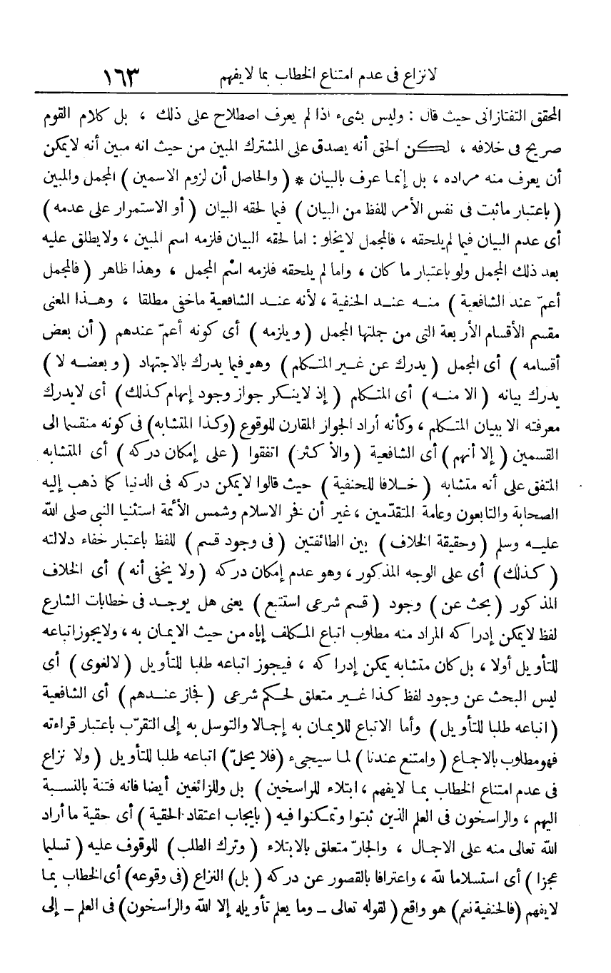 المحقق التفتازاني حيث قال: وليس بشيء إذا لم يعرف اصطلاح على ذلك، بل كلام القوم صريح في خلافه، لكن الحق أنه يصدق على المشترك المبين من حيث أنه مبين أنه لا يمكن أن يعرف منه مراده، بل إنما عرف بالبيان (والحاص أن لزوم الأسمين) المجمل والمبين (باعتبار ما ثبت في نفس الأمر للفظ من البيان) فيما لحقه البيان ((أو الاستمرار على عدمه) أي عدم البيان فيما لم يلحقه، فالمجمل لا يخلو: إما لحقه البيان فلزمه اسم المبين، ولا يطلق عليه بعد ذلك املجمل ولو باعتبار ما كان، وإما لم يلحقه فلزمه اسم المجمل، وهذا ظاهر (فالمجمل أعم عند الشافعية) منه عند الحنفية، لأنه عند الشافعية ما خفي مطلقا، وهذا المعنى مقسم الأقسام الأربعة التي من جملتها المجمل (ويلزمه) أي كونه أعم عندهم (أن بعض أقسامه) أي المجمل (يدرك عن غير المتكلم) وهو فيما يدرك بالاجتهاد (وبعضه لا) يدرك بيانه (إلا منه) أي المتكلم (إذ لا ينكر جواز وجود إبهام كذلك) أي لا يدرك معرفته إلا ببيان المتكلم، وكأنه أراد الجواز المقارن للوقوع (وكذا المتشابه) في كونه منقسما إلى القسمين (إلا أنهم) أي الشافعية (والأكثر) اتفقوا (على إمكان دركه) أي المتشابه المتفق على أنه متشابه (خلافا للحنفية) حيث قالوا لا يمكن دركه في الدنيا كما ذهب إليه الصحابة والتابعون وعامة المتقدمين، غير أن فخر الإسلام وشمس الأئمة استثنيا النبي صلى الله عليه وسلم (وحقيقة الخلاف) بين الطائفتين (في وجود قسم) للفظ باعتبار خفاء دلالته (كذلك) أي على الوجه المذكور، وهو عدم إمكان دركه (ولا يخفى أنه) أي الخلاف المذكور (بحث عن) وجود (قسم شرعي استتبع) يعني هل يوجد في خطابات الشارع لفظ لا يمكن إدراكه المراد منه مطلوب اتباع المكلف إياه من حيث الإيمان به، ولا يجوز اتباعه للتأويل أولا، بل كان متشابه يمكن إدراكه، فيجوز اتباعه طلبا للتأويل (لا لغوى) أي ليس البحث عن وجود لفظ كذا غير متعلق لحكم شرعي (فجاز عندهم) أي الشافعية (اتباعه طلبا للتأويل) وأما الاتباع للإيمان به إجمالا والتوسل به إلى التقرب باعتبار قراءته فهو مطلوب بالإجماع (وامتنع عندنا) لما سيجيء (فلا يحل) اتباعه طلبا للتأويل (ولا نزاع في عدم امتناع الخطاب بما لا يفهم، ابتلاء للراسخين) بل وللزائغين أيضا فإنه فتنة بالنسبة اليهم، والراسخون في العلم الذين ثبتوا وتمكنوا فيه (بإيجاب اعتقاد الحقية) أي حقية ما أراد الله تعالى منه على الإجمال، والجار متعلق بالابتلاء (وترك الطلب) للوقوف عليه (تسليما عجزا) أي استسلاما لله، واعترافا بالقصور عن دركه (بل) النزاع (في وقوعه) أي الخطاب بما لا يفهم (فالحنفية نعم) هو واقع (لقوله تعالى - وما يعلم تأويله إلا الله والراسخون) في العلم - إلى