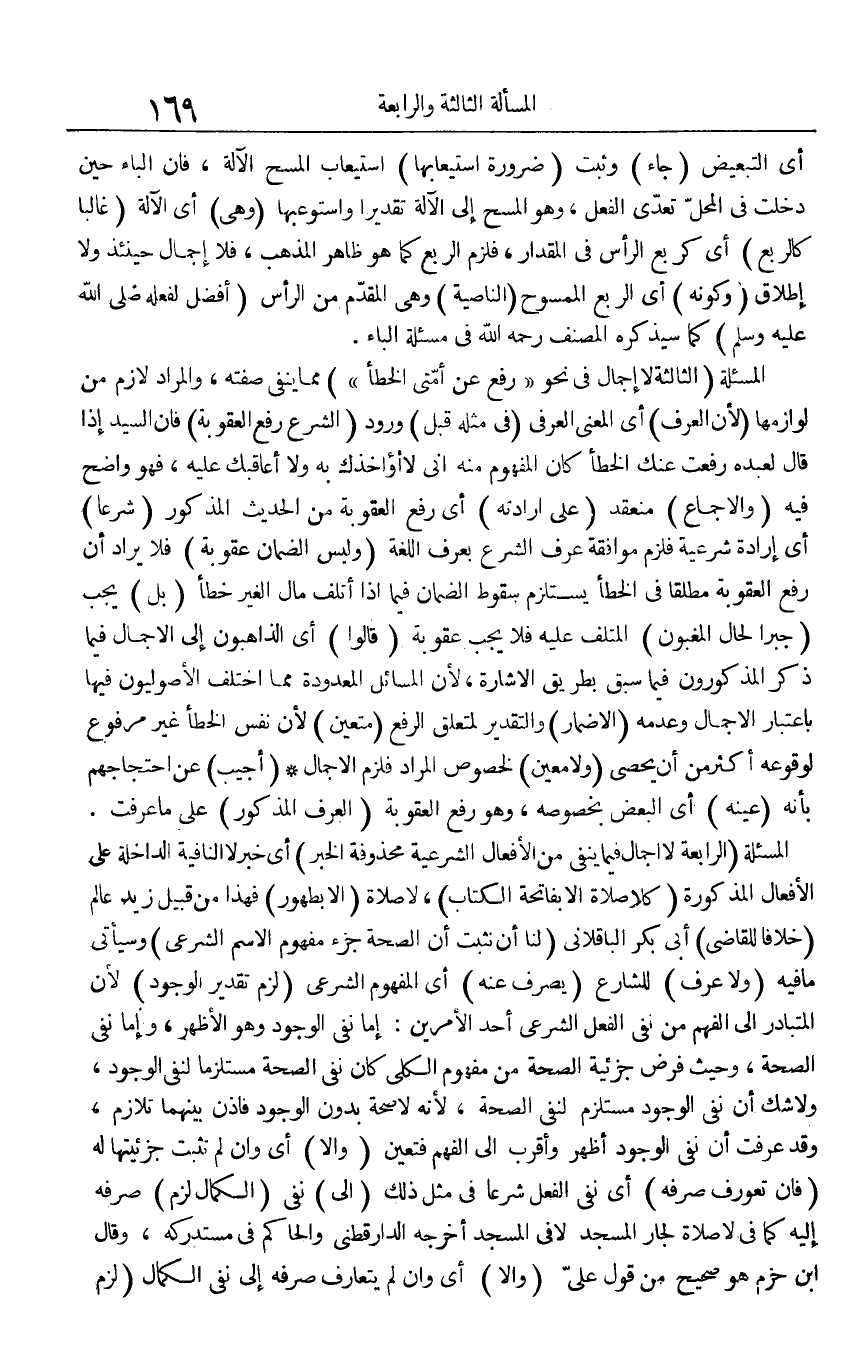المسئلة (الثَّالِثَة لَا إِجْمَال فِي نَحْو " رفع عَن أمتِي الْخَطَأ ") مِمَّا يَنْفِي صفته، وَالْمرَاد لَازم من لوازمها (لِأَن الْعرف) أَي الْمَعْنى الْعرفِيّ (فِي مثله قبل) وُرُود (الشَّرْع رفع الْعقُوبَة) فَإِن السَّيِّد إِذا قَالَ لعَبْدِهِ رفعت عَنْك الْخَطَأ كَانَ الْمَفْهُوم مِنْهُ أَنِّي لَا أؤاخذك بِهِ وَلَا أعاقبك عَلَيْهِ، فَهُوَ وَاضح فِيهِ (وَالْإِجْمَاع) مُنْعَقد (على إِرَادَته) أَي رفع الْعقُوبَة من الحَدِيث الْمَذْكُور (شرعا) أَي إِرَادَة شَرْعِيَّة فَلَزِمَ مُوَافقَة عرف الشَّرْع بعرف اللُّغَة (وَلَيْسَ الضَّمَان عُقُوبَة) فَلَا يُرَاد أَن رفع الْعقُوبَة مُطلقًا فِي الْخَطَأ يسْتَلْزم سُقُوط الضَّمَان فِيمَا إِذا أتلف مَال الْغَيْر خطأ (بل) يجب (جبرا لحَال المغبون) الْمُتْلف عَلَيْهِ فَلَا يجب عُقُوبَة (قَالُوا) أَي الذاهبون إِلَى الْإِجْمَال فِيمَا ذكر المذكورون فِيمَا سبق بطرِيق الْإِشَارَة، لِأَن الْمسَائِل المعدودة مِمَّا اخْتلف الأصوليون فِيهَا بِاعْتِبَار الْإِجْمَال وَعَدَمه (الْإِضْمَار) وَالتَّقْدِير لمتعلق الرّفْع (مُتَعَيّن) لِأَن نفس الْخَطَأ غير مَرْفُوع لوُقُوعه أَكثر من أَن يُحْصى (وَلَا معِين) لخُصُوص المُرَاد فَلَزِمَ الْإِجْمَال (أُجِيب) عَن احتجاجهم بِأَنَّهُ (عينه) أَي الْبَعْض بِخُصُوصِهِ، وَهُوَ رفع الْعقُوبَة (الْعرف الْمَذْكُور) على مَا عرفت.