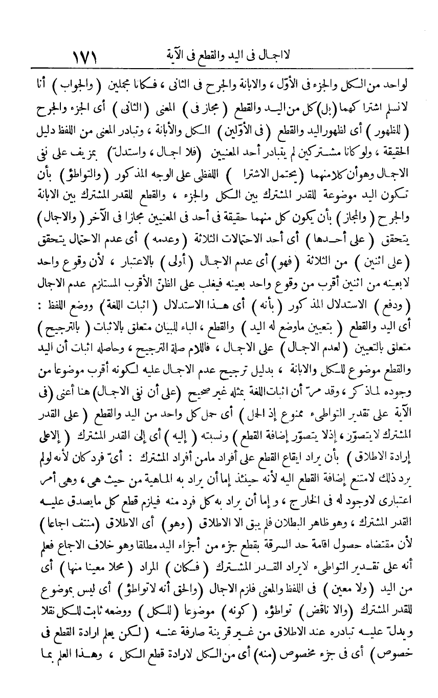 لوَاحِد من الْكل والجزء فِي الأول، والأبانة وَالْجرْح فِي الثَّانِي، فَكَانَا مجملين (وَالْجَوَاب) أَنا لَا نسلم اشتراكهما (بل) كل من الْيَد وَالْقطع (مجَاز فِي) الْمَعْنى (الثَّانِي) أَي الْجُزْء وَالْجرْح (للظهور) أَي لظُهُور الْيَد وَالْقطع (فِي الْأَوَّلين) الْكل والأبانة، وتبادر الْمَعْنى من اللَّفْظ دَلِيل الْحَقِيقَة، وَلَو كَانَا مشتركين لم يتَبَادَر أحد الْمَعْنيين (فَلَا إِجْمَال، وَاسْتدلَّ) بمزيف على نفي الْإِجْمَال وَهُوَ أَن كلا مِنْهُمَا (يحْتَمل الِاشْتِرَاك) اللَّفْظِيّ على الْوَجْه الْمَذْكُور (والتواطؤ) بِأَن تكون الْيَد مَوْضُوعَة للقدر الْمُشْتَرك بَين الْكل والجزء، وَالْقطع للقدر الْمُشْتَرك بَين الأبانة وَالْجرْح (وَالْمجَاز) بِأَن يكون كل مِنْهُمَا حَقِيقَة فِي أحد فِي الْمَعْنيين مجَازًا فِي الآخر (والإجمال) يتَحَقَّق (على أَحدهَا) أَي أحد الِاحْتِمَالَات الثَّلَاثَة (وَعَدَمه) أَي عدم الِاحْتِمَال يتَحَقَّق (على اثْنَيْنِ) من الثَّلَاثَة (فَهُوَ) أَي عدم الْإِجْمَال (أولى) بِالِاعْتِبَارِ، لِأَن وُقُوع وَاحِد لَا بِعَيْنِه من اثْنَيْنِ أقرب من وُقُوع وَاحِد بِعَيْنِه فيغلب على الظَّن الْأَقْرَب المستلزم عدم الْإِجْمَال (وَدفع) الِاسْتِدْلَال الْمَذْكُور (بِأَنَّهُ) أَي هَذَا الِاسْتِدْلَال (إِثْبَات اللُّغَة) وَوضع اللَّفْظ: أَي الْيَد وَالْقطع (بِتَعْيِين مَا وضع لَهُ الْيَد) وَالْقطع، الْبَاء للْبَيَان مُتَعَلق بالإثبات (بالترجيح) مُتَعَلق بِالتَّعْيِينِ (لعدم الْإِجْمَال) على الْإِجْمَال، فَاللَّام صلَة التَّرْجِيح، وَحَاصِله إِثْبَات أَن الْيَد وَالْقطع مَوْضُوع للْكُلّ والإبانة، بِدَلِيل تَرْجِيح عدم الْإِجْمَال عَلَيْهِ لكَونه أقرب مَوْضُوعا من وجوده لما ذكر، وَقد مر أَن إِثْبَات اللُّغَة بِمثلِهِ غير صَحِيح (على أَن نفي الْإِجْمَال) هُنَا أَعنِي (فِي الْآيَة على تَقْدِير التواطئ مَمْنُوع إِذْ الْحمل) أَي حمل كل وَاحِد من الْيَد وَالْقطع (على الْقدر الْمُشْتَرك لَا يتَصَوَّر، إِذْ لَا يتَصَوَّر إِضَافَة الْقطع) ونسبته (إِلَيْهِ) أَي إِلَى الْقدر الْمُشْتَرك (إِلَّا على إِرَادَة الْإِطْلَاق) بِأَن يُرَاد إِيقَاع الْقطع على أَفْرَاد مَا من أَفْرَاد الْمُشْتَرك: أَي فَرد كَانَ لِأَنَّهُ لَو لم يرد ذَلِك لامتنع إِضَافَة الْقطع إِلَيْهِ لِأَنَّهُ حِينَئِذٍ إِمَّا أَن يُرَاد بِهِ الْمَاهِيّة من حَيْثُ هِيَ، وَهِي أَمر اعتباري لَا وجود لَهُ فِي الْخَارِج، وَإِمَّا أَن يُرَاد بِهِ كل فَرد مِنْهُ فَيلْزم قطع كل مَا يصدق عَلَيْهِ الْقدر الْمُشْتَرك، وَهُوَ ظَاهر الْبطلَان فَلم يبْق إِلَّا الْإِطْلَاق (وَهُوَ) أَي الْإِطْلَاق (مُنْتَفٍ إِجْمَاعًا) لِأَن مُقْتَضَاهُ حُصُول إِقَامَة حد السّرقَة بِقطع جُزْء من أَجزَاء الْيَد مُطلقًا وَهُوَ خلاف الْإِجْمَاع فَعلم أَنه على تَقْدِير التواطئ لَا يُرَاد الْقدر الْمُشْتَرك (فَكَانَ) المُرَاد (محلا معينا مِنْهَا) أَي من الْيَد (لَا معِين) فِي اللَّفْظ وَالْمعْنَى فَلَزِمَ الْإِجْمَال (وَالْحق أَنه لَا تواطؤ) أَي لَيْسَ بموضوع للقدر الْمُشْتَرك (وَإِلَّا نَاقض) تواطؤه (كَونه) مَوْضُوعا (للْكُلّ) وَوَضعه ثَابت للْكُلّ نقلا وَيدل عَلَيْهِ تبادره عِنْد الْإِطْلَاق من غير قرينَة صارفة عَنهُ (لَكِن يعلم إِرَادَة الْقطع فِي خُصُوص) أَي فِي جُزْء مَخْصُوص (مِنْهُ) أَي من الْكل لإِرَادَة قطع الْكل، وَهَذَا الْعلم بِمَا