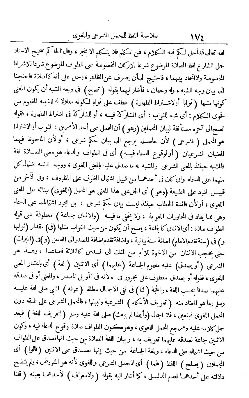 الله تَعَالَى قد أحل لكم فِيهِ الْكَلَام، فَمن تكلم فَلَا يتَكَلَّم إِلَّا بِخَير، وَقَالَ الْحَاكِم صَحِيح الْإِسْنَاد حمل الشَّارِع لفظ الصَّلَاة الْمَوْضُوع شرعا للأركان الْمَخْصُوصَة على الطّواف الْمَوْضُوع شرعا للأشراط الْمَخْصُوصَة وَلَا اتِّحَاد بَينهمَا، فاحتيج إِلَى أَن يصرف عَن الظَّاهِر، وَحمل على أَنه كَالصَّلَاةِ فاحتجنا إِلَى بَيَان وَجه الشّبَه، وَله وَجْهَان، فَأَشَارَ إِلَيْهِمَا بقوله (تصح) فِي وَجه الشّبَه أَن يكون الْمَعْنى كَونهَا مثلهَا (ثَوابًا أَو لاشْتِرَاط الطَّهَارَة) عطف على ثَوابًا لكَونه معلولا لَهُ للشبيه الْمَفْهُوم من فحوى الْكَلَام: أَي شبه للثَّواب: أَي الْمُشَاركَة فِيهِ، أَو للمشاركة فِي اشْتِرَاط الطَّهَارَة، فَقَوله تصح إِلَى آخِره مستأنفة لبَيَان المحملين (وَهُوَ) أَن الْمحمل على أحد الْأَمريْنِ: الثَّوَاب أَو الِاشْتِرَاط هُوَ الْمحمل (الشَّرْعِيّ) لِأَن حَاصله يرجع إِلَى بَيَان حكم شَرْعِي، أَو لِأَن الملحوظ فيهمَا المعنيان الشرعيان (أَو لوُقُوع الدُّعَاء فِيهِ) أَي فِي الطّواف وَالدُّعَاء هُوَ معنى الصَّلَاة لُغَة فالمشبه حِينَئِذٍ بِالْمَعْنَى الشَّرْعِيّ والمشبه بِهِ مَا صدق عَلَيْهِ بِالْمَعْنَى اللّغَوِيّ، وَوجه الشّبَه اشْتِمَال كل مِنْهُمَا على الدُّعَاء وَإِن كَانَ فِي أَحدهمَا من قبيل اشْتِمَال الظّرْف على المظروف، وَفِي الآخر من قبيل الْفَرد على الطبيعة (وَهُوَ) أَي الْحمل على هَذَا الْمَعْنى هُوَ الْمحمل (اللّغَوِيّ) لبنائه على الْمَعْنى اللّغَوِيّ، أَو لِأَن فَائِدَة الْخطاب حِينَئِذٍ لَيست بَيَان حكم شَرْعِي، بل مُجَرّد اشتمالهما على الدُّعَاء وَهِي مِمَّا يفاد فِي المحاورات اللُّغَوِيَّة، وَلَا يخفى مَا فِيهِ (والاثنان جمَاعَة) معطوفة على قَوْله الطّواف صَلَاة: أَي الِاثْنَان كالجماعة، يَصح أَن يكون من حَيْثُ الثَّوَاب مثلهَا (فِي) مِقْدَار (ثَوَابهَا و) فِي (سنة تقدم الامام) إِضَافَة سنة بَيَانِيَّة، وإذافة تقدم إِضَافَة الْمصدر إِلَى الْفَاعِل (و) فِي (الْمِيرَاث) حَتَّى يحجب الِاثْنَان من الْأُخوة للْأُم من الثُّلُث إِلَى السُّدس كالثلاثة فَصَاعِدا، وَهَذَا هُوَ الشَّرْعِيّ (أَو يصدق) عَلَيْهِ مَفْهُوم الْجَمَاعَة (عَلَيْهِمَا) أَي الِاثْنَيْنِ (لُغَة) أَي بِاعْتِبَار الْمَعْنى اللّغَوِيّ، فَقَوله أَو يصدق مَعْطُوف على مجرور فِي، لِأَنَّهُ فِي تَأْوِيل الْمصدر، وَالْمعْنَى أَو فِي صدقه عَلَيْهِمَا صدقا بِحَسب اللُّغَة، وَالْحجّة (لنا) فِي نفي الْإِجْمَال مُطلقًا (عرفه) النَّبِي صلى الله عَلَيْهِ وَسلم وَمَا هُوَ الْمُعْتَاد مِنْهُ (تَعْرِيف الْأَحْكَام) الشَّرْعِيَّة وتبينها، فالمحمل الشَّرْعِيّ على طبقه دون الْمحمل اللّغَوِيّ فَيتَعَيَّن، فَلَا إِجْمَال (وَأَيْضًا لم يبْعَث) صلى الله عَلَيْهِ وَسلم (لتعريف اللُّغَة) فَبعد حمل كَلَامه عَلَيْهِ ومرجع الْمحمل اللّغَوِيّ، وَهُوَ كَون الطّواف صَلَاة لوُقُوع الدُّعَاء فِيهِ، وَكَون الِاثْنَيْنِ جمَاعَة لصدقه عَلَيْهِمَا تَعْرِيف بِهِ، وَبَيَان اللُّغَة الصَّلَاة من حَيْثُ إِنَّهَا تصدق على الطّواف من حَيْثُ اشتماله على الدُّعَاء، وللغة الْجَمَاعَة من حَيْثُ إِنَّهَا تصدق على الِاثْنَيْنِ (قَالُوا) أَي المجملون (يصلح) اللَّفْظ (لَهما) أَي للمحمل الشَّرْعِيّ واللغوي لِأَنَّهُ هُوَ الْمَفْرُوض، وَلم يَتَّضِح دلَالَته على أَحدهمَا لعدم الدَّلِيل، كَمَا أَشَارَ إِلَيْهِ بقوله (وَلَا معرف) لأَحَدهمَا بِعَيْنِه (قُلْنَا