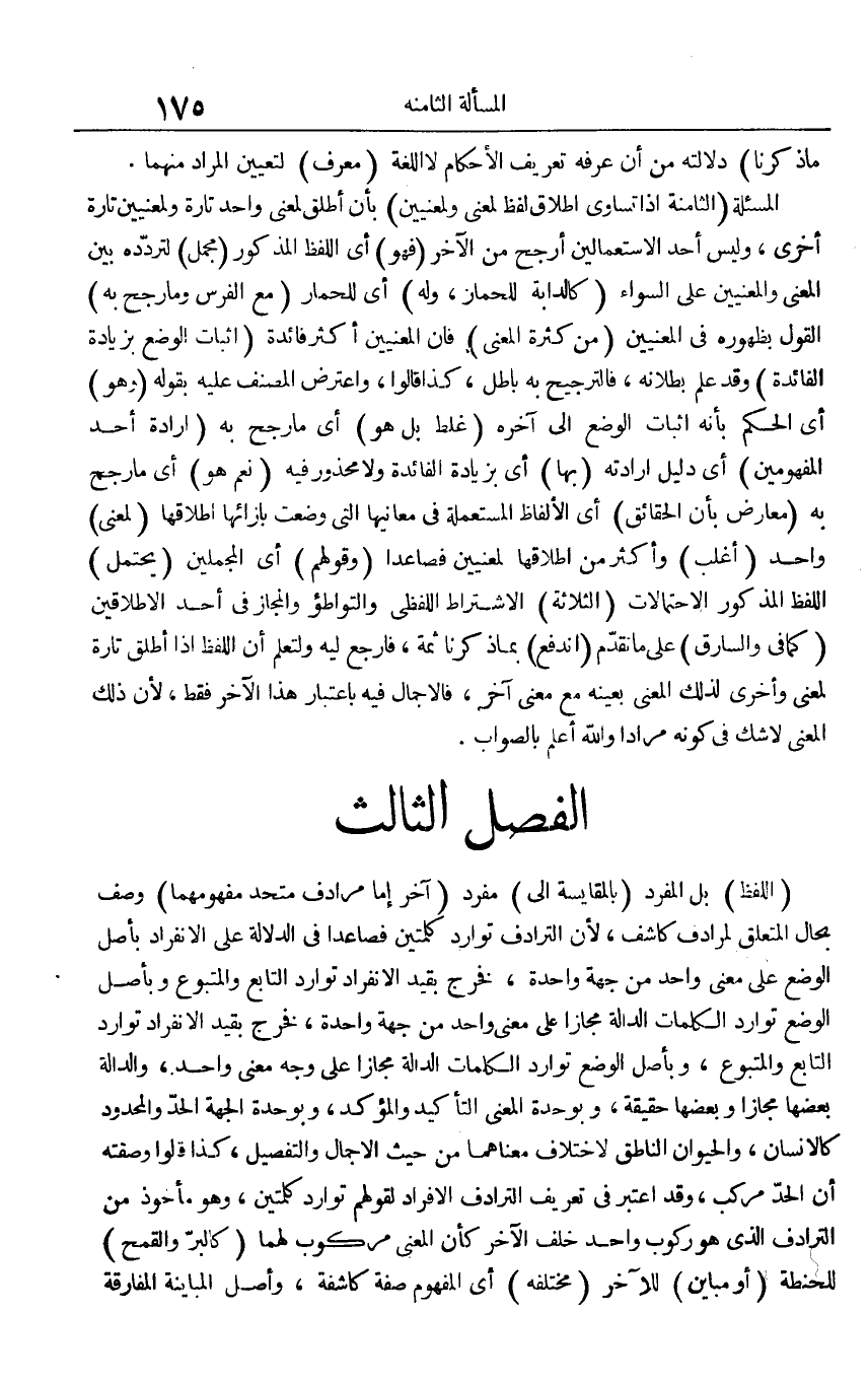 المسئلة (الثَّامِنَة إِذا تساوى إِطْلَاق لفظ لِمَعْنى ولمعنيين) بِأَن أطلق لِمَعْنى وَاحِد تَارَة ولمعنيين تَارَة أُخْرَى، وَلَيْسَ أحد الاستعمالين أرجح من الآخر (فَهُوَ) أَي اللَّفْظ الْمَذْكُور (مُجمل) لتردده بَين الْمَعْنى والمعنيين على السوَاء (كالدابة للحمار، وَله) أَي للحمار (مَعَ الْفرس وَمَا رجح بِهِ) القَوْل بظهوره فِي الْمَعْنيين (من كَثْرَة الْمَعْنى) فَإِن الْمَعْنيين أَكثر فَائِدَة (إِثْبَات الْوَضع بِزِيَادَة الْفَائِدَة) وَقد علم بُطْلَانه، فالترجيح بِهِ بَاطِل، كَذَا قَالُوا، وَاعْترض المُصَنّف عَلَيْهِ بقوله (وَهُوَ) أَي الحكم بِأَنَّهُ إِثْبَات الْوَضع إِلَى آخِره (غلط بل هُوَ) أَي مَا رجح بِهِ (إِرَادَة أحد المفهومين) أَي دَلِيل إِرَادَته (بهَا) أَي بِزِيَادَة الْفَائِدَة وَلَا مَحْذُور فِيهِ (نعم هُوَ) أَي مَا رجح بِهِ (معَارض بِأَن الْحَقَائِق) أَي الْأَلْفَاظ المستعملة فِي مَعَانِيهَا الَّتِي وضعت بإزائها إِطْلَاقهَا (لِمَعْنى) وَاحِد (أغلب) وَأكْثر من إِطْلَاقهَا لمعنيين فَصَاعِدا (وَقَوْلهمْ) أَي المجملين (يحْتَمل) اللَّفْظ الْمَذْكُور الِاحْتِمَالَات (الثَّلَاثَة) الِاشْتِرَاط اللَّفْظِيّ والتواطؤ وَالْمجَاز فِي أحد الاطلاقين (كَمَا فِي وَالسَّارِق) على مَا تقدم (انْدفع) بِمَا ذكرنَا ثمَّة، فَارْجِع ليه ولتعلم أَن اللَّفْظ إِذا أطلق تَارَة لِمَعْنى وَأُخْرَى لذَلِك الْمَعْنى بِعَيْنِه مَعَ معنى آخر، فالإجمال فِيهِ بِاعْتِبَار هَذَا الآخر فَقَط، لِأَن ذَلِك الْمَعْنى لَا شكّ فِي كَونه مرَادا وَالله أعلم بِالصَّوَابِ.