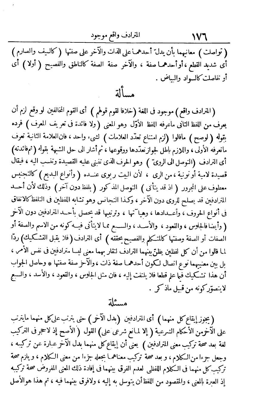 (المترادف وَاقع) مَوْجُود فِي اللُّغَة (خلافًا لقوم قَوْلهم) أَي الْقَوْم الْمُخَالفين لَو وَقع لزم أَن يعرف من اللَّفْظ الثَّانِي مَا عرفه اللَّفْظ الأول وَهُوَ الْمَعْنى (وَلَا فَائِدَة فِي تَعْرِيف الْمُعَرّف) فَرده بقوله (لَو صَحَّ) مَا قَالُوا (لزم امْتنَاع تعدد العلامات) لشَيْء وَاحِد، فَإِن الْعَلامَة الثَّانِيَة تعرف مَا تعرفه الأولى، وَاللَّازِم بَاطِل لجَوَاز تعددها ووقوعها، ثمَّ أَشَارَ إِلَى حل الشُّبْهَة بقوله (ثمَّ فَائِدَته) أَي الترادف (التَّوَصُّل إِلَى الروي) وَهُوَ الْحَرْف الَّذِي تنبني عَلَيْهِ القصيدة وتنسب إِلَيْهِ، فَيُقَال قصيدة لامية أَو نونية، من الرّيّ لِأَن الْبَيْت ريوي عِنْده (وأنواع البديع) كالتجنيس مَعْطُوف على الْمَجْرُور (إِذْ قد يَتَأَتَّى) التَّوَصُّل الْمَذْكُور (بِلَفْظ دون آخر) وَذَلِكَ لِأَن أحد المترادفين قد يصلح للروي دون الآخر، وَكَذَا التجانس وَهُوَ تشابه اللَّفْظَيْنِ فِي التَّلَفُّظ كالاتفاق فِي أَنْوَاع الْحُرُوف، وأعدادها، وهيآتها، وترتيبها قد يحصل بِأحد المترادفين دون الآخر (وَأَيْضًا فالجلوس، وَالْقعُود، والأسد، والسبع مِمَّا لَا يَتَأَتَّى فِيهِ كَونه من الِاسْم وَالصّفة أَو الصِّفَات أَو الصّفة وصفتها كالمتكلم والفصيح يحققه) أَي الترادف (فَلَا يقبل التشكيك) ردا لما قَالُوا من أَن كل لفظين يظنّ بَينهمَا الترادف لتقاربهما معنى ليسَا مترادفين فِي نفس الْأَمر، بل بَين معنييهما نوع اتِّصَال لكَون أَحدهمَا صفة ذَات، وَالْآخر صفة صفتهَا وَحَاصِل الْجَواب أَن هَذَا تشكيك فِيمَا علم قطعا فَلَا يلْتَفت إِلَيْهِ، فَإِن مثل الْجُلُوس، وَالْقعُود، والأسد، والسبع لَا يتَصَوَّر كَونه من قبيل مَا ذكر.