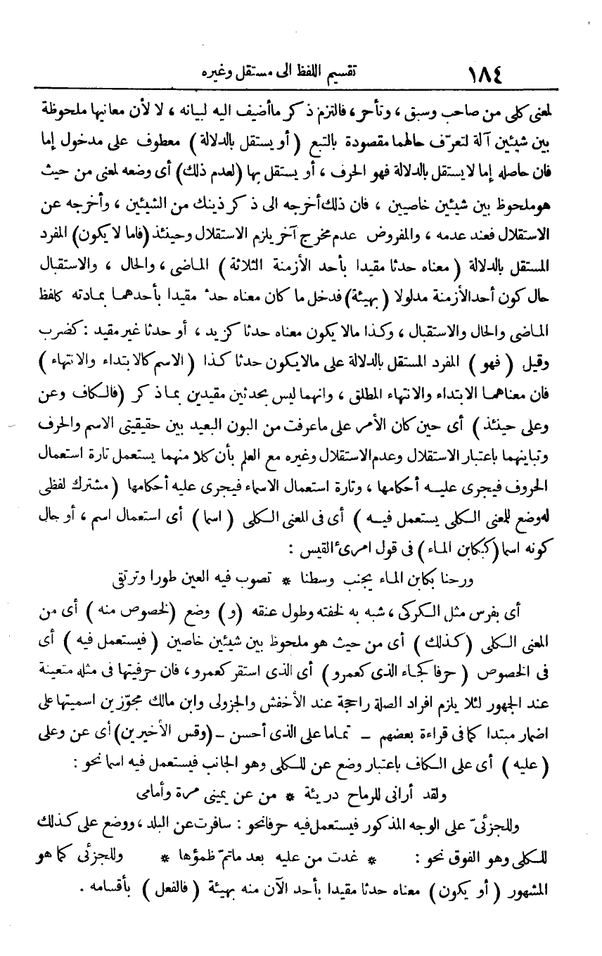 لمعنى كلي من صاحب وسبق، وتأخر، فالتزم ذكر ما أضيف إليه لبيانه، لا لأن معانيها ملحوظة بين شيئين آلة لتعرف حالهما مقصودة بالتبع (أو يستقل بالدلالة) معطوف على مدخول إما فإن حاصله إما لا يستقل بالدلالة فهو الحرف، أو يستقل بها (لعدم ذلك) أي وضعه لمعنى من حيث هو ملحوظ بين شيئين خاصيين، فإن ذلك أخرجه إلى ذكر ذينك من الشيئين، وأخرجه عن الاستقلال فعند عدمه، والمفروض عدم مخرج آخر يلزم الاستقلال وحينئذ (فأما لا يكون) المفرد المستقل بالدلالة (معناه حدثا مقيدا بأحد الأزمنة الثلاثة) الماضي، والحال، والاستقبال حال كون أحد الأزمنة مدلولا (بهيئة) فدخل ما كان معناه حدثا مقيدا بأحدهما بمادته كلفظ الماضي والحال والاستقبال، وكذا ما لا يكون معناه حدثا كزيد، أو حدثا غير مقيد: كضرب وقيل (فهو) المفرد المستقل بالدلالة على ما لا يكون حدثا كذا (الاسم كالابتداء والانتهاء) فإن معناهما الابتداء والانتهاء المطلق، وأنهما ليس بحدثين مقيدين بما ذكر (فالكاف وعن وعلى حيئنذ) أي حين كان الأمر على ما عرفت من البون البعيد بين حقيقتي الاسم والحرف وتبياينهما باعتبار الاستقلال وعدم الاستقلال وغيره مع العلم بأن كلا منهما يستعمل تارة استعمال الحروف فيجري عليه أحكامها، وتارة استعمال الأسماء فيجري عليه أحكامها (مشترك لفظي له وضع للمعنى الكلي يستعمل فيه) أي في المعنى الكلي (اسما) أي استعمال اسم، أو حال كونه اسما (كبكابن الماء) في قول امريء القيس: