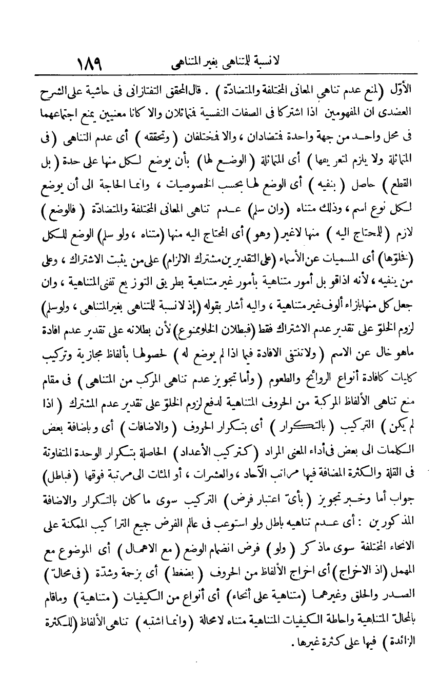 الأول (لمنع عدم تناهي الْمعَانِي الْمُخْتَلفَة والمتضادة). قَالَ الْمُحَقق التَّفْتَازَانِيّ فِي حَاشِيَة على الشَّرْح العضدي أَن المفهومين إِذا اشْتَركَا فِي الصِّفَات النفسية فمتماثلان وَإِلَّا كَانَا مَعْنيين يمْنَع اجْتِمَاعهمَا فِي مَحل وَاحِد من جِهَة وَاحِدَة فمتضادان، وَإِلَّا فمختلفان (وتحققه) أَي عدم التناهي (فِي المتماثلة وَلَا يلْزم لتعريفها) أَي المتماثلة (الْوَضع لَهَا) بِأَن يوضع لكل مِنْهَا على حِدة (بل الْقطع) حَاصِل (بنفيه) أَي الْوَضع لَهَا بِحَسب الخصوصيات، وَإِنَّمَا الْحَاجة إِلَى أَن يوضع لكل نوع اسْم، وَذَلِكَ متناه (وَإِن سلم) عدم تناهي الْمعَانِي الْمُخْتَلفَة والمتضادة (فالوضع) لَازم (للمحتاج إِلَيْهِ) مِنْهَا لَا غير (وَهُوَ) أَي الْمُحْتَاج إِلَيْهِ مِنْهَا (متناه، وَلَو سلم) الْوَضع للْكُلّ (فخلوها) أَي المسميات عَن الْأَسْمَاء (على التَّقْدِيرَيْنِ مُشْتَرك الْإِلْزَام) على من يثبت الِاشْتِرَاك، وعَلى من يَنْفِيه، لِأَنَّهُ إِذا قوبل أُمُور متناهية بِأُمُور غير متناهية بطرِيق التَّوْزِيع تفنى المتناهية، وَإِن جعل كل مِنْهَا بِإِزَاءِ أُلُوف غير متناهية، وَإِلَيْهِ أَشَارَ بقوله (إِذْ لَا نِسْبَة للمتناهى بِغَيْر المتناهى، وَلَو سلم) لُزُوم الْخُلُو على تَقْدِير عدم الِاشْتِرَاك فَقَط (فبطلان الْخُلُو مَمْنُوع) لِأَن بُطْلَانه على تَقْدِير عدم إِفَادَة مَا هُوَ خَال عَن الِاسْم (وَلَا تَنْتفِي الإفادة فِيمَا إِذا لم يوضع لَهُ) لحصولها بِأَلْفَاظ مجازية وتركيب كليات كإفادة أَنْوَاع الروائح والطعوم (وَأما تَجْوِيز عدم تناهي الْمركب من المتناهي) فِي مقَام منع تناهي الْأَلْفَاظ المركبة من الْحُرُوف المتناهية لدفع لُزُوم الْخُلُو على تَقْدِير عدم الْمُشْتَرك (إِذا لم يكن) التَّرْكِيب (بالتكرار) أَي بتكرار الْحُرُوف (والإضافات) أَي وبإضافة بعض الْكَلِمَات إِلَى بعض فِي أَدَاء الْمَعْنى المُرَاد (كتركيب الْأَعْدَاد) الْحَاصِلَة بتكرار الْوحدَة المتفاوتة فِي الْقلَّة وَالْكَثْرَة المضافة فِيهَا مَرَاتِب الْآحَاد، والعشرات، أَو المئات إِلَى مرتبَة فَوْقهَا (فَبَاطِل) جَوَاب أما وَخبر تَجْوِيز (بِأَيّ اعْتِبَار فرض) التَّرْكِيب سوى مَا كَانَ بالتكرار وَالْإِضَافَة الْمَذْكُورين: أَي عدم تناهيه بَاطِل وَلَو استوعب فِي عَالم الْفَرْض جَمِيع التراكيب الممكنة على الأنحاء الْمُخْتَلفَة سوى مَا ذكر (وَلَو) فرض انضمام الْوَضع (مَعَ الإهمال) أَي الْمَوْضُوع مَعَ المهمل (إِذْ الْإِخْرَاج) أَي إِخْرَاج الْأَلْفَاظ من الْحُرُوف (بضغط) أَي بزحمة وَشدَّة (فِي محَال) الصَّدْر وَالْحلق وَغَيرهمَا (متناهية على أنحاء) أَي أَنْوَاع من الكيفيات (متناهية) وَمَا قَامَ بالمحال المتناهية وإحاطة الكيفيات المتناهية متناه لَا محَالة (وَإِنَّمَا اشْتبهَ) تناهي الْأَلْفَاظ (للكثرة الزَّائِدَة) فِيهَا على كَثْرَة غَيرهَا.