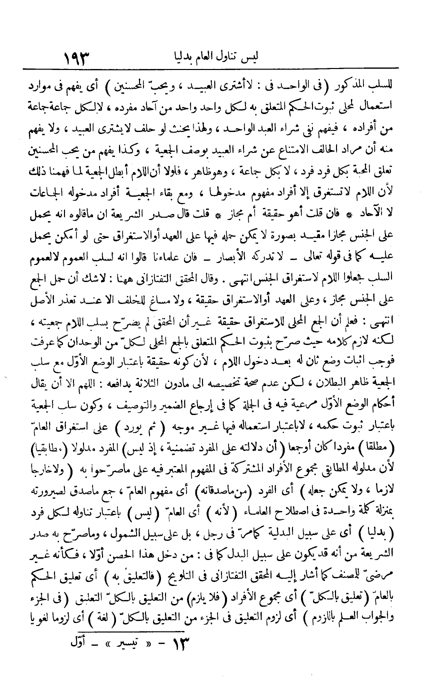 للسلب الْمَذْكُور (فِي الْوَاحِد فِي: لَا أَشْتَرِي العبيد، وَيُحب الْمُحْسِنِينَ) أَي يفهم فِي موارد اسْتِعْمَال لمحلي ثُبُوت الحكم الْمُتَعَلّق بِهِ لكل وَاحِد وَاحِد من آحَاد مفرده، لَا لكل جمَاعَة جمَاعَة من أَفْرَاده، فيفهم نفي شِرَاء العَبْد الْوَاحِد، وَلِهَذَا يَحْنَث لَو حلف لَا يَشْتَرِي العبيد، وَلَا يفهم مِنْهُ أَن مُرَاد الْحَالِف الِامْتِنَاع عَن شِرَاء العبيد بِوَصْف الجمعية، وَكَذَا يفهم من يحب الْمُحْسِنِينَ تعلق الْمحبَّة بِكُل فَرد فَرد، لَا بِكُل جمَاعَة، وَهُوَ ظَاهر، فلولا أَن اللَّام أبطل الجمعية لما فهمنا ذَلِك لِأَن اللَّام لَا تستغرق إِلَّا أَفْرَاد مَفْهُوم مدخولها، وَمَعَ بَقَاء الجمعية أَفْرَاد مدخوله الْجَمَاعَات لَا الْآحَاد فَإِن قلت أهوَ حَقِيقَة أم مجَاز قلت قَالَ صدر الشَّرِيعَة أَن مَا قَالُوهُ أَنه يحمل على الْجِنْس مجَازًا مُقَيّد بِصُورَة لَا يُمكن حمله فِيهَا على الْعَهْد أَو الِاسْتِغْرَاق حَتَّى لَو أمكن يحمل عَلَيْهِ كَمَا فِي قَوْله تَعَالَى - {لَا تُدْرِكهُ الْأَبْصَار} - فَإِن علماءنا قَالُوا أَنه لسلب الْعُمُوم لَا لعُمُوم السَّلب فَجعلُوا اللَّام لاستغراق الْجِنْس انْتهى. وَقَالَ الْمُحَقق التَّفْتَازَانِيّ هَهُنَا: لَا شكّ أَن حمل الْجمع على الْجِنْس مجَاز، وعَلى الْعَهْد أَو الِاسْتِغْرَاق حَقِيقَة، وَلَا مساغ للخلف إِلَّا عِنْد تعذر الأَصْل انْتهى: فَعلم أَن الْجمع الْمحلى للاستغراق حَقِيقَة غير أَن الْمُحَقق لم يُصَرح بسلب اللَّام جمعيته، لكنه لَازم كَلَامه حَيْثُ صرح بِثُبُوت الحكم الْمُتَعَلّق بِالْجمعِ الْمحلي لكل من الوحدان كَمَا عرفت فَوَجَبَ إِثْبَات وضع ثَان لَهُ بعد دُخُول اللَّام، لِأَن كَونه حَقِيقَة بِاعْتِبَار الْوَضع الأول مَعَ سلب الجمعية ظَاهر الْبطلَان، لَكِن عدم صِحَة تَخْصِيصه إِلَى مَا دون الثَّلَاثَة يدافعه: اللَّهُمَّ إِلَّا أَن يُقَال أَحْكَام الْوَضع الأول مرعية فِيهِ فِي الْجُمْلَة كَمَا فِي إرجاع الضَّمِير والتوصيف، وَكَون سلب الجمعية بِاعْتِبَار ثُبُوت حكمه، لَا بِاعْتِبَار اسْتِعْمَاله فِيهَا غير موجه (ثمَّ يُورد) على استغراق الْعَام (مُطلقًا) مُفردا كَانَ أَو جمعا (أَن دلَالَته على الْمُفْرد تضمنية، إِذْ لَيْسَ) الْمُفْرد مدلولا (مطابقيا) لِأَن مَدْلُوله المطابقي مَجْمُوع الْأَفْرَاد الْمُشْتَركَة فِي الْمَفْهُوم الْمُعْتَبر فِيهِ على مَا صَرَّحُوا بِهِ (وَلَا خَارِجا لَازِما، وَلَا يُمكن جعله) أَي الْفَرد (من مَا صدقاته) أَي مَفْهُوم الْعَام، جمع مَا صدق لصيرورته بِمَنْزِلَة كلمة وَاحِدَة فِي اصْطِلَاح الْعلمَاء (لِأَنَّهُ) أَي الْعَام (لَيْسَ) بِاعْتِبَار تنَاوله لكل فَرد (بدليا) أَي على سَبِيل الْبَدَلِيَّة كَمَا مر فِي رجل، بل على سَبِيل الشُّمُول، وَمَا صرح بِهِ صدر الشَّرِيعَة من أَنه قد يكون على سَبِيل الْبَدَل كَمَا فِي: من دخل هَذَا الْحصن أَولا، فَكَأَنَّهُ غير مرضِي للْمُصَنف كَمَا أَشَارَ إِلَيْهِ الْمُحَقق التَّفْتَازَانِيّ فِي التَّلْوِيح (فالتعليق بِهِ) أَي تَعْلِيق الحكم بِالْعَام (تَعْلِيق بِالْكُلِّ) أَي مَجْمُوع الْأَفْرَاد (فَلَا يلْزم) من التَّعْلِيق بِالْكُلِّ التَّعْلِيق (فِي الْجُزْء وَالْجَوَاب الْعلم باللزوم) أَي لُزُوم التَّعْلِيق فِي الْجُزْء من التَّعْلِيق بِالْكُلِّ (لُغَة) أَي لُزُوما لغويا