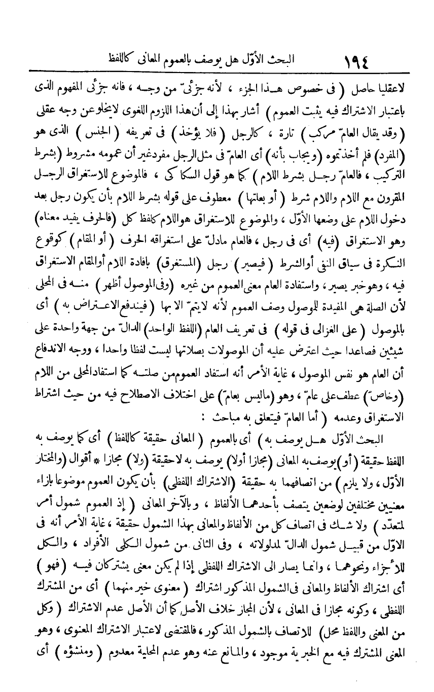لَا عقليا حَاصِل (فِي خُصُوص هَذَا الْجُزْء، لِأَنَّهُ جزئي من وَجه، فَإِنَّهُ جزئي الْمَفْهُوم الَّذِي بِاعْتِبَار الِاشْتِرَاك فِيهِ يثبت الْعُمُوم) أَشَارَ بِهَذَا إِلَى أَن هَذَا اللُّزُوم اللّغَوِيّ لَا يَخْلُو عَن وَجه عَقْلِي (وَقد يُقَال الْعَام مركب) تَارَة، كَالرّجلِ (فَلَا يُؤْخَذ) فِي تَعْرِيفه (الْجِنْس) الَّذِي هُوَ (الْمُفْرد) فَلم أخذتموه (وَيُجَاب بِأَنَّهُ) أَي الْعَام فِي مثل الرجل مُفْرد غير أَن عُمُومه مَشْرُوط (بِشَرْط التَّرْكِيب، فالعام رجل بِشَرْط اللَّام) كَمَا هُوَ قَول السكاكي، فالموضوع للاستغراق الرجل المقرون مَعَ اللَّام وَاللَّام شَرط (أَو بعلتها) مَعْطُوف على قَوْله بِشَرْط اللَّام بِأَن يكون رجل بعد دُخُول اللَّام على وَضعهَا الأول، والموضوع للاستغراق هُوَ اللَّام كَلَفْظِ كل (فالحرف يُفِيد مَعْنَاهُ) وَهُوَ الِاسْتِغْرَاق (فِيهِ) أَي فِي رجل، فالعام مَا دلّ على استغراقه الْحَرْف (أَو الْمقَام) كوقوع النكرَة فِي سِيَاق النَّفْي أَو الشَّرْط (فَيصير) رجل (الْمُسْتَغْرق) بإفادة اللَّام أَو الْمقَام الِاسْتِغْرَاق فِيهِ، وَهُوَ خبر يصير، واستفادة الْعَام معنى الْعُمُوم من غَيره (وَفِي الْمَوْصُول أظهر) مِنْهُ فِي الْمحلى لِأَن الصِّلَة هِيَ المفيدة للموصول وصف الْعُمُوم لِأَنَّهُ لَا يتم إِلَّا بهَا (فيندفع الِاعْتِرَاض بِهِ) أَي بالموصول (على الْغَزالِيّ فِي قَوْله) فِي تَعْرِيف الْعَام (اللَّفْظ الْوَاحِد) الدَّال من جِهَة وَاحِدَة على شَيْئَيْنِ فَصَاعِدا من حَيْثُ اعْترض عَلَيْهِ أَن الموصولات بصلاتها لَيست لفظا وَاحِدًا، وَوجه الاندفاع أَن الْعَام هُوَ نفس الْمَوْصُول، غَايَة الْأَمر أَنه اسْتَفَادَ الْعُمُوم من صلته كَمَا اسْتَفَادَ الْمحلي من اللَّام (وخاص) عطف على عَام، وَهُوَ (مَا لَيْسَ بعام) على اخْتِلَاف الِاصْطِلَاح فِيهِ من حَيْثُ اشْتِرَاط الِاسْتِغْرَاق وَعَدَمه (أما الْعَام فَيتَعَلَّق بِهِ مبَاحث: