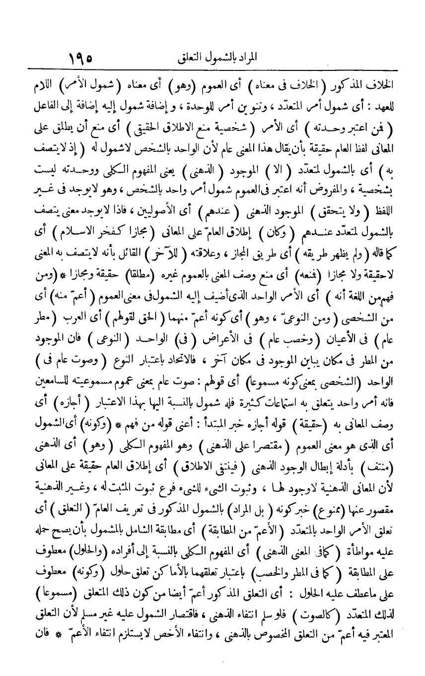 الخلاف المذكور (الخلاف في معناه) أي العموم (وهو) أي معناه (شمول الأمر) اللام للعهد: أي شمول أمر المتعدد، وتنوين أمر للوحدة، وإضافة شمول إليه إضافة إلى الفاعل (فمن اعتبر وحدته) أي الأمر (شخصية منع الإطلاق الحقيقي) أي منع أن يطلق على المعاني لفظ العام حقيقة بأن يقال هذا المعنى عام لأن الواحد بالشخص لا شمول له (إذ لا يتصفه به) أي بالشمول لمتعدد (إلا) الموجود (الذهني) يعني المفهوم الكلي ووحدته ليست بشخصية، والمفروض أنه اعتبر في العموم شمول أمر واحد بالشخص، وهو لا يوجد في غير اللفظ (ولا يتحقق) الموجود الذهني (عندهم) أي الأصوليين، فإذا لا يوجد معنى يتصف بالشمول لمتعدد عندهم (وكان) إطلاق العام على المعاني (مجازا كفخر الإسلام) أي كما قاله (ولم يظهر طريقه) أي طريق المجاز، وعلاقته (للآخر) القائل بأنه لا يتصف به المعنى لا حقيقة ولا مجازا (فمنعه) أي منع وصف المعنى بالعموم غيره (مطلقا) حقيقة ومجازا، (ومن فهم من اللغة أنه) أي الأمر الواحد الذي أضيف إليه الشمول في معنى العموم (أعم منه) أي من الشخصي (ومن النوعي، وهو) أي كونه أعم منهما (الحق لقولهم) أي العرب (مطر عام) في الأعيان (وخصب عام) في الأعراض (في) الواحد (النوعي) فإن الموجود من المطر في مكان يباين الموجود في مكان آخر، فالاتحاد باعتبار النوع (وصوت عام في) الواحد (الشخصي بمعنى كونه مسموعا) أي قولهم: صوت عام بمعنى عموم مسموعيته للسامعين فإنه امر واحد يتعلق به استماعات كثيرة فله شمول بالنسبة إليها بهذا الاعتبار (أجازه) أي وصف المعاني به (حقيقة) قوله أجازه خبر المبتدأ: أعني قوله من فهم (وكونه) أي الشمول أي الذي هو معنى العموم (مقتصرا على الذهني) وهو المفهوم الكلي (وهو) أي الذهني (منتف) بأدلة إبطال الوجود الذهني (فينتفي الإطلاق) أي إطلاق العام حقيقة على المعاني لأن المعاني الذهنية لا وجود لها، وثبوت الشيء للشيء فرع ثبوت المثبت له، وغير الذهنية مقصور عنها (ممنوع) خبر كونه (بل المراد) بالشمول المذكر في تعريف العام (التعلق) أي تعلق الأمر الواحد بالمتعدد (الأعم من المطابقة) أي مطابقة الشامل بالمشمول بأن يصح حمله عليه مواطأة (كما في المعنى الذهني) أي المفهوم الكلي بالنسبة إلى أفراده (والحلول) معطوف على المطابقة (كما في المطر والخصب) باعتبار تعلقهما بالأماكن تعلق حلول (وكونه) معطوف على ما عطف عليه الحلول: أي التعلق المذكور أعم أيضا من كون ذلك المتعلق (مسموعا) لذلك المتعدد (كالصوت) فلو سلم انتفاء الذهني، فاقتصار الشمول عليه غير مسار لأن التعلق المعتبر فيه أعم من التعلق المخصوص بالذهني، وانتفاء الأخص لا يستلزم انتفاء الأعم، فإن