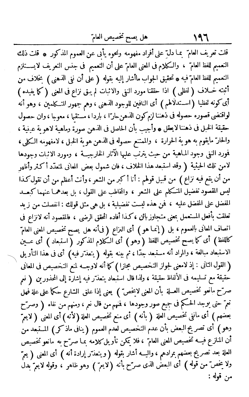 قلت تعرف العام بما دل على أفراده مفهومه ونحوه يأبى عن العموم المذكور، قلت ذلك التعميم للفظ العام، والكلام في المعنى العام على أن التعميم في جنس التعريف لا يستلزم التعميم للفظ العام فيه. تحقيق الجواب ما أشار إليه بقوله (على أن نفي الذهني) بخلاف من أثبته خلاف (لفظي) إذا حققنا مورد النفي والإثبات لم يبق نزاع في المعنى (كما يفيده) أي كونه لفظيا (استدلالهم) أي النافين للوجود الذهني وهم جمهور المتكلمين، وهو أنه لو اقتضى قصوره حصوله في ذهننا لزم كون الذهن حارا، باردا، مستقيما معوجا، وإن حصول حقيقة الخبل في ذهننا لا يعقل، وأجيب بأن الحاصل في الذهن صورة وماهية لا هوية عينية، والحار ما يقوم به هوية الحرارة، والممتنع حصوله في الذهن هوية الخبل، لا مفهومه الكلي، فمورد النفي وجود الماهية من حيث يترتب عليها الآثار الخارجية، ومورد الإثبات وجودها لا من تلك الحيثية (وقد استبعد هذا الخلاف)، فان شمول بعض المعاني لمتعدد أكثر وأظهر من أن يقع فيه نزاع) من قبيل قولهم: أنا أكبر من الشعر، وأنت أعظم من أن تقول كذا ليس المقصود تفضيل المتكلم على الشعر، والمخاطب على القول، بل بعدهما عنهما كبعد المفضل على المفضل عليه، فمن هذه ليست تفضيلية، بل هي مثل قولك: انفصلت من زيد تعلقت بأفعل المستعمل بمعنى متجاوز بائن، كذا أفاده المحقق الرضى، فالمقصود أنه لا نزاع في اتصاف المعاني بالعموم، بل (إنما هو) أي النزاع (في أنه هل يصح تخصيص المعنى العام كاللفظ) أي كما يصح تخصيص اللفظ (وهو) أي الكلام المذكور (استبعاد) أي عين الاستبعاد مبالغة جدا، ثم بينه بقوله (يتعذر فيه) أي في هذا التأويل (القول الثاني: إذ لا معنى لجواز التخصيص مجازا) كما أنه لا وجه لمنع التخصيص في المعاني حقيقة مع تسليمه في الألفاظ حقيقة، ولذا قال استبعاد يتعذر فيه إشارة إلى المحذورين (نعم صرح مانعو تخصيص العلة بأن المعنى لا يخص) يعني إذا علق الشارع حكما على علة فهل تعم حتى يوجد الحكم في جميع صورة وجودها، فمنهم من قال نعم، ومنهم من نفاه (وصرح بعضهم) أي ما في نفي تخصيص العلة (بأنه) أي منع تخصيص العلة (لأنه) أي المعنى (لا يعم وهو) أي تصريح البعض بأن عدم التخصيص لعدم العموم (ينافي ما ذكر) المستبعد من المنازع فيه تخصيص المعنى العام، فلا يمكن تأويل كلامه بما صرح به ما نعو تخصيص العلة بعد تصريح بعضهم بمرادهم، وإليه أشار بقوله (ويتعذر إرادة أنه) أي المعنى (يعم ولا يخص من قوله) أي البعض الذي صرح بأنه (لا يعم) وهو ظاهر، وقوله لا يعم بدل من قوله: