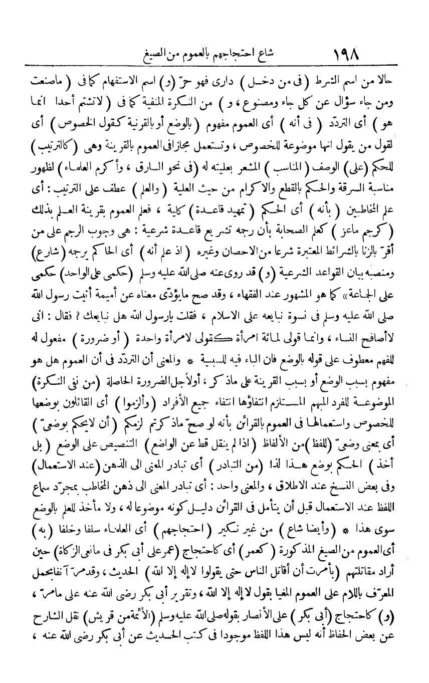 حَالا من اسْم الشَّرْط (فِي من دخل) دارى فَهُوَ حر (و) اسْم الِاسْتِفْهَام كَمَا فِي (مَا صنعت وَمن جَاءَ سُؤال عَن كل جَاءَ ومصنوع، و) من النكرَة المنفية كَمَا فِي (لَا تَشْتُم أحدا إِنَّمَا هُوَ) أَي التَّرَدُّد (فِي أَنه) أَي الْعُمُوم مَفْهُوم (بِالْوَضْعِ أَو بالقرنية كَقَوْل الْخُصُوص) أَي لقَوْل من يَقُول إِنَّهَا مَوْضُوعَة للخصوص، وتستعمل مجَازًا فِي الْعُمُوم بِالْقَرِينَةِ وَهِي (كالترتيب) للْحكم (على) الْوَصْف (الْمُنَاسب) الْمشعر بعليته لَهُ (فِي نَحْو السَّارِق، وَأكْرم الْعلمَاء) لظُهُور مُنَاسبَة السّرقَة وَالْحكم بِالْقطعِ وَالْإِكْرَام من حَيْثُ الْعلية (وَالْعلم) عطف على التَّرْتِيب: أَي علم المخاطبين (بِأَنَّهُ) أَي الحكم (تمهيد قَاعِدَة) كُلية، فَعلم الْعُمُوم بِقَرِينَة الْعلم بذلك (كرجم مَاعِز) كعلم الصَّحَابَة بِأَن رجمه تشريع قَاعِدَة شَرْعِيَّة: هِيَ وجوب الرَّجْم على من أقرّ بِالزِّنَا بالشرائط الْمُعْتَبرَة شرعا من الْإِحْصَان وَغَيره (إِذْ علم أَنه) أَي الْحَاكِم يَرْجُمهُ (شَارِع) ومنصبه بَيَان الْقَوَاعِد الشَّرْعِيَّة (و) قد روى عَنهُ صلى الله عَلَيْهِ وَسلم (حكمي على الْوَاحِد) حكمي على الْجَمَاعَة " كَمَا هُوَ الْمَشْهُور عِنْد الْفُقَهَاء، وَقد صَحَّ مَا يُؤدى مَعْنَاهُ عَن أُمَيْمَة أتيت رَسُول الله صلى الله عَلَيْهِ وَسلم فِي نسْوَة نُبَايِعهُ على الْإِسْلَام، فَقلت يَا رَسُول الله هَل نُبَايِعك؟ فَقَالَ: إِنِّي لَا أُصَافح النِّسَاء، وَإِنَّمَا قولي لمِائَة امْرَأَة كَقَوْلي لامْرَأَة وَاحِدَة (أَو ضَرُورَة) مفعول لَهُ للفهم مَعْطُوف على قَوْله بِالْوَضْعِ فَإِن الْبَاء فِيهِ للسَّبَبِيَّة وَالْمعْنَى أَن التَّرَدُّد فِي أَن الْعُمُوم هَل هُوَ مَفْهُوم بِسَبَب الْوَضع أَو بِسَبَب الْقَرِينَة على مَا ذكر، أَو لأجل الضَّرُورَة الْحَاصِلَة (من نفي النكرَة) الْمَوْضُوعَة للفرد الْمُبْهم المستلزم انتفاؤها انْتِفَاء جَمِيع الْأَفْرَاد (وألزموا) أَي الْقَائِلُونَ بوضعها للخصوص واستعمالها فِي الْعُمُوم بالقرائن بِأَنَّهُ لَو صَحَّ مَا ذكرْتُمْ لزمكم (أَن لَا يحكم بوضعي) أَي بِمَعْنى وضعي (للفظ) من الْأَلْفَاظ (إِذا لم ينْقل قطّ عَن الْوَاضِع) التَّنْصِيص على الْوَضع (بل أَخذ) الحكم بِوَضْع هَذَا لذا (من التبادر) أَي تبادر الْمَعْنى إِلَى الذِّهْن (عِنْد الِاسْتِعْمَال) وَفِي بعض النّسخ عِنْد الْإِطْلَاق، وَالْمعْنَى وَاحِد: أَي تبادر الْمَعْنى إِلَى ذهن الْمُخَاطب بِمُجَرَّد سَماع اللَّفْظ عِنْد الِاسْتِعْمَال قبل أَن يتَأَمَّل فِي الْقَرَائِن دَلِيل كَونه مَوْضُوعا لَهُ، وَلَا مَأْخَذ للْعلم بِالْوَضْعِ سوى هَذَا (وَأَيْضًا شاع) من غير نَكِير (احتجاجهم) أَي الْعلمَاء سلفا وخلفا (بِهِ) أَي الْعُمُوم من الصِّيَغ الْمَذْكُورَة (كعمر) أَي كاحتجاج (عمر على أبي بكر فِي مانعي الزَّكَاة) حِين أَرَادَ مُقَاتلَتهمْ (بأمرت أَن أقَاتل النَّاس حَتَّى يَقُولُوا لَا إِلَه إِلَّا الله) الحَدِيث، وَقد مر آنِفا بِحمْل الْمُعَرّف بِاللَّامِ على الْعُمُوم المغيا بقول لَا إِلَه إِلَّا الله، وَتَقْرِير أبي بكر رَضِي الله عَنهُ على مَا مر، (و) كاحتجاج (أبي بكر) على الْأَنْصَار بقوله صلى الله عَلَيْهِ وَسلم (الْأَئِمَّة من قُرَيْش) نقل الشَّارِح عَن بعض الْحفاظ أَنه لَيْسَ هَذَا اللَّفْظ مَوْجُودا فِي كتب الحَدِيث عَن أبي بكر رَضِي الله عَنهُ،