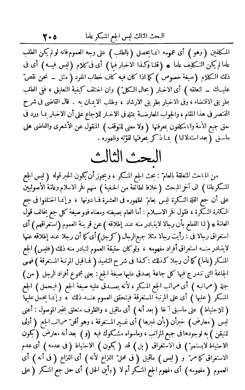 من المباحث الْمُتَعَلّقَة بِالْعَام: بحث الْجمع الْمُنكر، وَيجوز أَن يكون الْخَبَر قَوْله (لَيْسَ الْجمع الْمُنكر عَاما) إِلَى آخر المبحث (خلافًا لطائفة من الْحَنَفِيَّة) مِنْهُم فَخر الْإِسْلَام وَعَامة الْأُصُولِيِّينَ على أَن جمع الْقلَّة النكرَة لَيْسَ بعام لظُهُوره فِي الْعشْرَة فَمَا دونهَا، وَإِنَّمَا اخْتلفُوا فِي جمع الْكَثْرَة النكرَة، فَقَوْل فَخر الْإِسْلَام: أما الْعَام بصيغته وَمَعْنَاهُ فَهُوَ صِيغَة كل جمع يُخَالف قَول الْعَامَّة (لنا الْقطع بِأَن رجَالًا لَا يتَبَادَر مِنْهُ عِنْد إِطْلَاقه) عَن قرينَة الْعُمُوم (استغراقهم) أَي استغراق رجَالًا فِي: رَأَيْت رجَالًا مثلا جَمِيع الرِّجَال (كَرجل) أَي كَمَا أَن رجلا عِنْد إِطْلَاقه عَنْهَا لَا يتَبَادَر مِنْهُ استغراق أَفْرَاد مَفْهُومه، وَلَو كَانَ حَقِيقَة الْعُمُوم لتبادر مِنْهُ ذَلِك (فَلَيْسَ) الْجمع الْمُنكر (عَاما) كَمَا أَن رجلا كَذَلِك: كَذَا فِي شرح التلميذ (فَمَا قيل الْمرتبَة المستغرقة) فَهِيَ الْجَمَاعَة الَّتِي تندرج فِيهَا كل جمَاعَة يصدق عَلَيْهَا صِيغَة الْجمع: يَعْنِي مَجْمُوع أَفْرَاد الرجل (من) جملَة (مراتبه) أَي مَرَاتِب الْجمع الْمُنكر، لِأَنَّهُ يصدق عَلَيْهِ صِيغَة الْجمع (فَيحمل) الْجمع الْمُنكر (عَلَيْهَا) أَي على الْمرتبَة المستغرقة فَيتَحَقَّق الْعُمُوم عِنْد ذَلِك، وَإِنَّمَا يحمل عَلَيْهَا (للِاحْتِيَاط) على مَا سبق آنِفا (بعد أَنه) أَي مَا قيل، والظرف مُتَعَلق بِخَبَر الْمَوْصُول: أَعنِي لَيْسَ (معَارض) خبر أَن (بِأَن غَيرهَا) أَي غير المستغرقة، وَهُوَ أقل مَرَاتِب الْجمع (أولى للتيقن) بِهِ لوجودها فِي جَمِيع الْمَرَاتِب، وَمَا سواهُ مَشْكُوك فِيهِ (و) بعد أَنه معَارض بِكَوْن الِاحْتِيَاط لَا يسْتَمر) فِي الِاسْتِغْرَاق (بل) قد (يكون) الِاحْتِيَاط (فِي عَدمه) أَي عدم الِاسْتِغْرَاق كَمَا مر و (لَيْسَ) مَا قيل (فِي مَحل النزاع لِأَنَّهُ) أَي النزاع (فِي أَنه) أَي الْعُمُوم (مَفْهُومه) أَي مَفْهُوم الْجمع الْمُنكر أم لَا (وَأَيْنَ الْحمل) أَي حمل جمع الْمُنكر (على