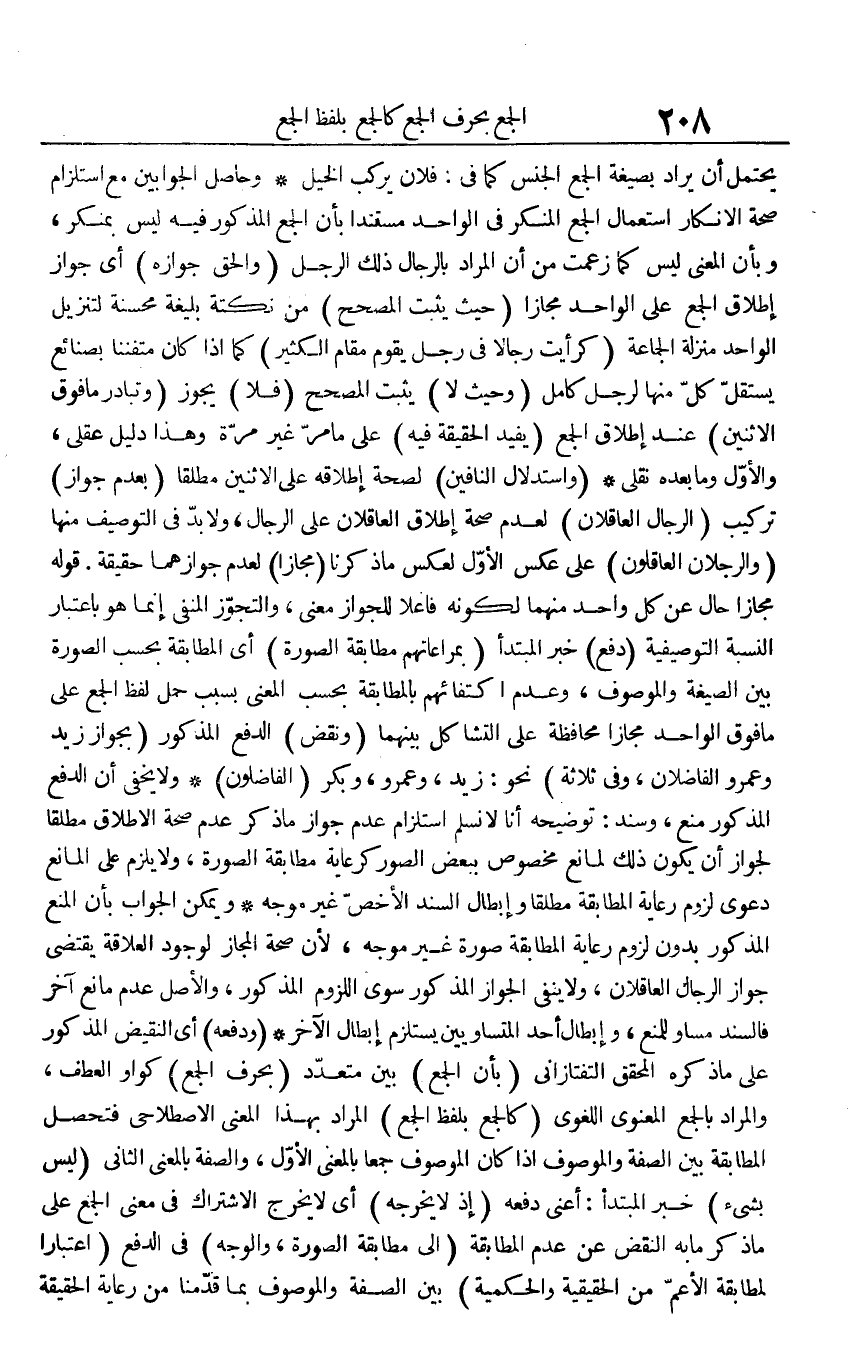 يحْتَمل أَن يُرَاد بِصِيغَة الْجمع الْجِنْس كَمَا فِي: فلَان يركب الْخَيل وَحَاصِل الجوابين مَعَ استلزام صِحَة الْإِنْكَار اسْتِعْمَال الْجمع الْمُنكر فِي الْوَاحِد مُسْتَندا بِأَن الْجمع الْمَذْكُور فِيهِ لَيْسَ بمنكر، وَبِأَن الْمَعْنى لَيْسَ كَمَا زعمت من أَن المُرَاد بِالرِّجَالِ ذَلِك الرجل (وَالْحق جَوَازه) أَي جَوَاز إِطْلَاق الْجمع على الْوَاحِد مجَازًا (حَيْثُ يثبت الْمُصَحح) من نُكْتَة بليغة محسنة لتنزيل الْوَاحِد منزلَة الْجَمَاعَة (كرأيت رجَالًا فِي رجل يقوم مقَام الْكثير) كَمَا إِذا كَانَ متفننا بصنائع يسْتَقلّ كل مِنْهَا لرجل كَامِل (وَحَيْثُ لَا) يثبت الْمُصَحح (فَلَا) يجوز (وتبادر مَا فَوق الِاثْنَيْنِ) عِنْد إِطْلَاق الْجمع (يُفِيد الْحَقِيقَة فِيهِ) على مَا مر غير مرّة وَهَذَا دَلِيل عَقْلِي، وَالْأول وَمَا بعده نقلي (واستدلال النافين) لصِحَّة إِطْلَاقه على الِاثْنَيْنِ مُطلقًا (بِعَدَمِ جَوَاز) تركيب (الرِّجَال العاقلان) لعدم صِحَة إِطْلَاق العاقلان على الرِّجَال، وَلَا بُد فِي التوصيف مِنْهَا (وَالرجلَانِ العاقلون) على عكس الأول لعكس مَا ذكرنَا (مجَازًا) لعدم جوازهما حَقِيقَة. قَوْله مجَازًا حَال عَن كل وَاحِد مِنْهُمَا لكَونه فَاعِلا للْجُوَاز معنى، والتجوز الْمَنْفِيّ إِنَّمَا هُوَ بِاعْتِبَار النِّسْبَة التوصيفية (دفع) خبر الْمُبْتَدَأ (بمراعاتهم مُطَابقَة الصُّورَة) أَي الْمُطَابقَة بِحَسب الصُّورَة بَين الصِّيغَة والموصوف، وَعدم اكتفائهم بالمطابقة بِحَسب الْمَعْنى بِسَبَب حمل لفظ الْجمع على مَا فَوق الْوَاحِد مجَازًا مُحَافظَة على التشاكل بَينهمَا (وَنقض) الدّفع الْمَذْكُور (بِجَوَاز زيد وَعَمْرو الفاضلان، وَفِي ثَلَاثَة) نَحْو: زيد، وَعَمْرو، وَبكر (الفاضلون) وَلَا يخفى أَن الدّفع الْمَذْكُور منع، وَسَنَد: تَوْضِيحه أَنا لَا نسلم استلزام عدم جَوَاز مَا ذكر عدم صِحَة الْإِطْلَاق مُطلقًا لجَوَاز أَن يكون ذَلِك لمَانع مَخْصُوص بِبَعْض الصُّور كرعاية مُطَابقَة الصُّورَة، وَلَا يلْزم على الْمَانِع دَعْوَى لُزُوم رِعَايَة الْمُطَابقَة مُطلقًا وَإِبْطَال السَّنَد الْأَخَص غير موجه وَيُمكن الْجَواب بِأَن الْمَنْع الْمَذْكُور بِدُونِ لُزُوم رِعَايَة الْمُطَابقَة صُورَة غير موجه، لِأَن صِحَة الْمجَاز لوُجُود العلاقة يقتضى جَوَاز الرِّجَال العاقلان، وَلَا يَنْفِي الْجَوَاز الْمَذْكُور سوى اللُّزُوم الْمَذْكُور، وَالْأَصْل عدم مَانع آخر فَالسَّنَد مسَاوٍ للْمَنْع، وَإِبْطَال أحد المتساويين يسْتَلْزم إبِْطَال الآخر (وَدفعه) أَي النقيض الْمَذْكُور على مَا ذكره الْمُحَقق التَّفْتَازَانِيّ (بِأَن الْجمع) بَين مُتَعَدد (بِحرف الْجمع) كواو الْعَطف، وَالْمرَاد بِالْجمعِ الْمَعْنَوِيّ اللّغَوِيّ (كالجمع بِلَفْظ الْجمع) المُرَاد بِهَذَا الْمَعْنى الاصطلاحي فَتحصل الْمُطَابقَة بَين الصّفة والموصوف إِذا كَانَ الْمَوْصُوف جمعا بِالْمَعْنَى الأول، وَالصّفة بِالْمَعْنَى الثَّانِي (لَيْسَ بِشَيْء) خبر الْمُبْتَدَأ: أَعنِي دَفعه (إِذْ لَا يُخرجهُ) أَي لَا يخرج الِاشْتِرَاك فِي معنى الْجمع على مَا ذكر مَا بِهِ النَّقْض عَن عدم الْمُطَابقَة (إِلَى مُطَابقَة الصُّورَة، وَالْوَجْه) فِي الدّفع (اعْتِبَارا لمطابقة الْأَعَمّ. من الْحَقِيقِيَّة والحكمية) بَين الصّفة والموصوف بِمَا قدمنَا من رِعَايَة الْحَقِيقَة