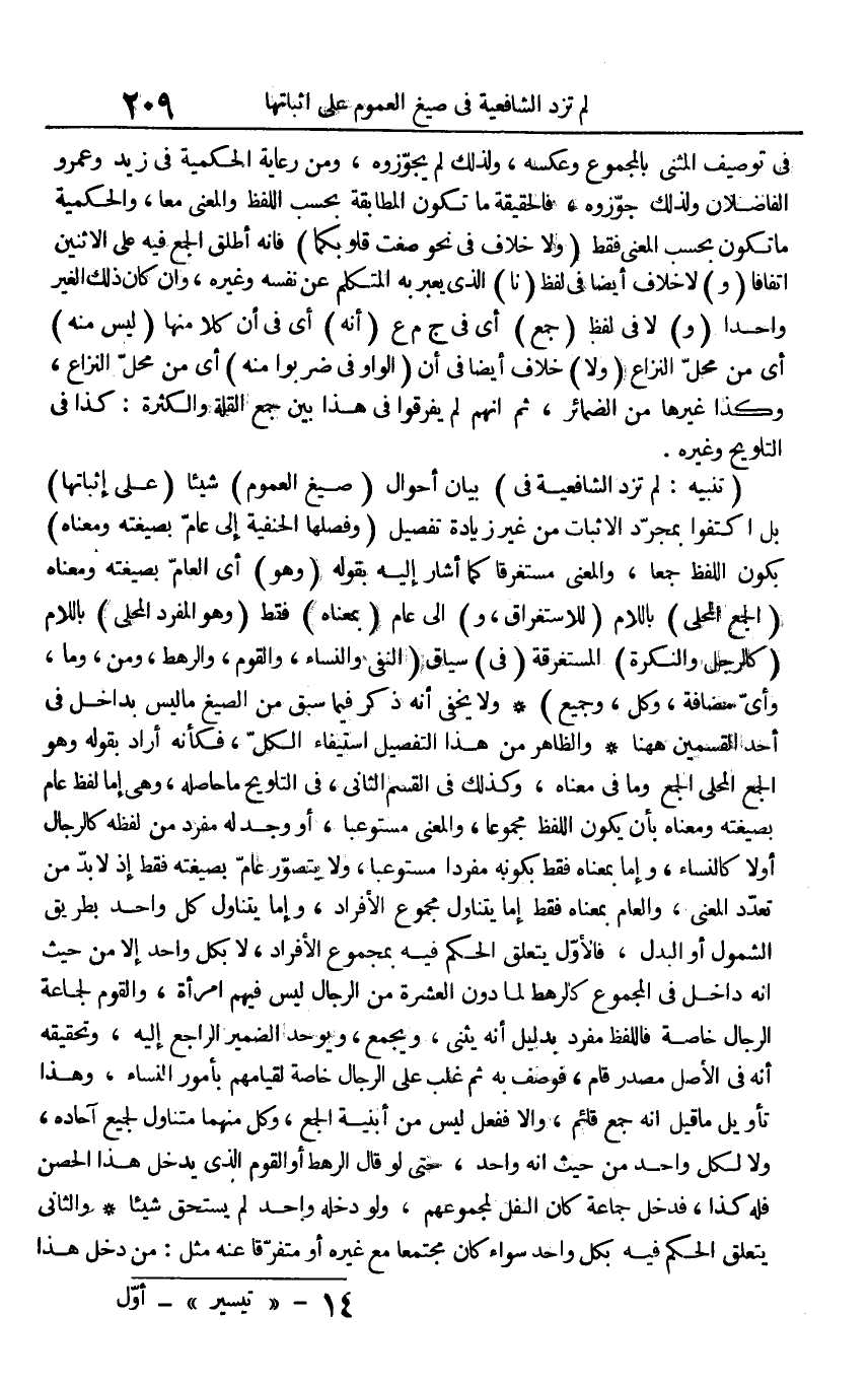 (تَنْبِيه: لم تزد الشَّافِعِيَّة فِي) بَيَان أَحْوَال (صِيغ الْعُمُوم) شَيْئا (على إِثْبَاتهَا) بل اكتفوا بِمُجَرَّد الْإِثْبَات من غير زِيَادَة تَفْصِيل (وفصلها الْحَنَفِيَّة إِلَى عَام بصيغته وَمَعْنَاهُ) بِكَوْن اللَّفْظ جمعا، وَالْمعْنَى مُسْتَغْرقا كَمَا أَشَارَ إِلَيْهِ بقوله (وَهُوَ) أَي الْعَام بصيغته وَمَعْنَاهُ (الْجمع الْمحلي) بِاللَّامِ (للاستغراق، و) إِلَى عَام (بِمَعْنَاهُ) فَقَط (وَهُوَ الْمُفْرد الْمحلي) بِاللَّامِ (كَالرّجلِ والنكرة) المستغرقة (فِي) سِيَاق (النَّفْي وَالنِّسَاء، وَالْقَوْم، والرهط، وَمن، وَمَا، وَأي مُضَافَة، وكل، وَجَمِيع) وَلَا يخفى أَنه ذكر فِيمَا سبق من الصِّيَغ مَا لَيْسَ بداخل فِي أحد الْقسمَيْنِ هَهُنَا وَالظَّاهِر من هَذَا التَّفْصِيل اسْتِيفَاء الْكل، فَكَأَنَّهُ أَرَادَ بقوله وَهُوَ الْجمع الْمحلي الْجمع وَمَا فِي مَعْنَاهُ، وَكَذَلِكَ فِي الْقسم الثَّانِي، فِي التَّلْوِيح مَا حَاصله، وَهِي إِمَّا لفظ عَام بصيغته وَمَعْنَاهُ بِأَن يكون اللَّفْظ مجموعا، وَالْمعْنَى مستوعبا، أَو وجد لَهُ مُفْرد من لَفظه كالرجال أَولا كالنساء، وَإِمَّا بِمَعْنَاهُ فَقَط بِكَوْنِهِ مُفردا مستوعبا، وَلَا يتَصَوَّر عَام بصيغته فَقَط إِذْ لَا بُد من تعدد الْمَعْنى، وَالْعَام بِمَعْنَاهُ فَقَط إِمَّا يتَنَاوَل مَجْمُوع الْأَفْرَاد، وَإِمَّا يتَنَاوَل كل وَاحِد بطرِيق الشُّمُول أَو الْبَدَل، فَالْأول يتَعَلَّق الحكم فِيهِ بِمَجْمُوع الْأَفْرَاد، لَا بِكُل وَاحِد إِلَّا من حَيْثُ أَنه دَاخل فِي الْمَجْمُوع كالرهط لما دون الْعشْرَة من الرِّجَال لَيْسَ فيهم امْرَأَة، وَالْقَوْم لجَماعَة الرِّجَال خَاصَّة فاللفظ مُفْرد بِدَلِيل أَنه يثنى، وَيجمع، ويوحد الضَّمِير الرَّاجِع إِلَيْهِ، وتحقيقه أَنه فِي الأَصْل مصدر قَامَ، فوصف بِهِ ثمَّ غلب على الرِّجَال خَاصَّة لقيامهم بِأُمُور النِّسَاء، وَهَذَا تَأْوِيل مَا قيل إِنَّه جمع قَائِم، وَإِلَّا فَفعل لَيْسَ من أبنية الْجمع، وكل مِنْهُمَا متناول لجَمِيع آحاده، وَلَا لكل وَاحِد من حَيْثُ أَنه وَاحِد، حَتَّى لَو قَالَ الرَّهْط أَو الْقَوْم الَّذِي يدْخل هَذَا الْحصن فَلهُ كَذَا، فَدخل جمَاعَة كَانَ النَّفْل لمجموعهم، وَلَو دخله وَاحِد لم يسْتَحق شَيْئا وَالثَّانِي يتَعَلَّق الحكم فِيهِ بِكُل وَاحِد سَوَاء كَانَ مجتمعا مَعَ غَيره أَو مُتَفَرقًا عَنهُ مثل: من دخل هَذَا