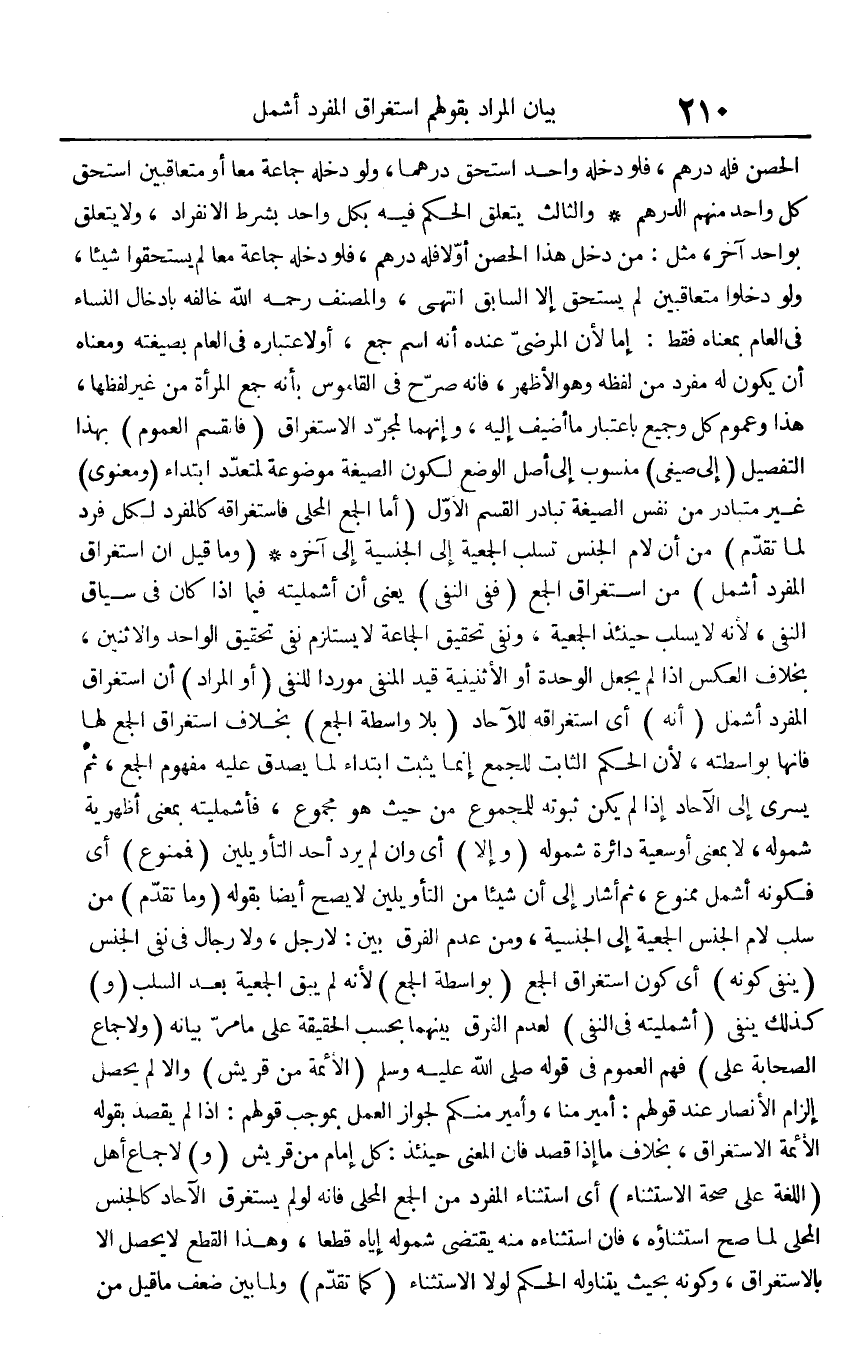 الْحصن فَلهُ دِرْهَم، فَلَو دخله وَاحِد اسْتحق درهما، وَلَو دخله جمَاعَة مَعًا أَو متعاقبين اسْتحق كل وَاحِد مِنْهُم الدِّرْهَم وَالثَّالِث يتَعَلَّق الحكم فِيهِ بِكُل وَاحِد بِشَرْط الِانْفِرَاد، وَلَا يتَعَلَّق بِوَاحِد آخر، مثل: من دخل هَذَا الْحصن أَولا فَلهُ دِرْهَم، فَلَو دخله جمَاعَة مَعًا لم يستحقوا شَيْئا، وَلَو دخلُوا متعاقبين لم يسْتَحق إِلَّا السَّابِق انْتهى، وَالْمُصَنّف رَحمَه الله خَالفه بِإِدْخَال النِّسَاء فِي الْعَام بِمَعْنَاهُ فَقَط: إِمَّا لِأَن المرضي عِنْده أَنه اسْم جمع، أَو لاعتباره فِي الْعَام بصيغته وَمَعْنَاهُ أَن يكون لَهُ مُفْرد من لَفظه وَهُوَ الْأَظْهر، فَإِنَّهُ صرح فِي الْقَامُوس بِأَنَّهُ جمع الْمَرْأَة من غير لَفظهَا، هَذَا وَعُمُوم كل وَجَمِيع بِاعْتِبَار مَا أضيف إِلَيْهِ، وإنهما لمُجَرّد الِاسْتِغْرَاق (فانقسم الْعُمُوم) بِهَذَا التَّفْصِيل (إِلَى صيغي) مَنْسُوب إِلَى أصل الْوَضع لكَون الصِّيغَة مَوْضُوعَة لمتعدد ابْتِدَاء (ومعنوي) غير متبادر من نفس الصِّيغَة تبادر الْقسم الأول (أما الْجمع الْمحلي فاستغراقه كالمفرد لكل فَرد لما تقدم) من أَن لَام الْجِنْس تسلب الجمعية إِلَى الجنسية إِلَى آخِره (وَمَا قيل أَن استغراق الْمُفْرد أشمل) من استغراق الْجمع (فَفِي النَّفْي) يَعْنِي أَن أشمليته فِيمَا إِذا كَانَ فِي سِيَاق النَّفْي، لِأَنَّهُ يسلب حِينَئِذٍ الجمعية، وَنفي تَحْقِيق الْجَمَاعَة لَا يسْتَلْزم نفي تَحْقِيق الْوَاحِد والاثنين، بِخِلَاف الْعَكْس إِذا لم يَجْعَل الْوحدَة أَو الأثنينية قيد الْمَنْفِيّ موردا للنَّفْي (أَو المُرَاد) أَن استغراف الْمُفْرد أشمل (أَنه) أَي استغراقه للآحاد (بِلَا وَاسِطَة الْجمع) بِخِلَاف استغراق الْجمع لَهَا فَإِنَّهَا بواسطته، لِأَن الحكم الثَّابِت للْجمع إِنَّمَا يثبت ابْتِدَاء لما يصدق عَلَيْهِ مَفْهُوم الْجمع، ثمَّ يسري إِلَى الْآحَاد إِذا لم يكن ثُبُوته للمجموع من حَيْثُ هُوَ مَجْمُوع، فأشمليته بِمَعْنى أظهرية شُمُوله، لَا بِمَعْنى أوسعية دَائِرَة شُمُوله (وَإِلَّا) أَي وَإِن لم يرد أحد التَّأْويلَيْنِ (فَمَمْنُوع) أَي فكونه أشمل مَمْنُوع، ثمَّ أَشَارَ إِلَى أَن شَيْئا من التَّأْويلَيْنِ لَا يَصح أَيْضا بقوله (وَمَا تقدم) من سلب لَام الْجِنْس الجمعية إِلَى الجنسية، وَمن عدم الْفرق بَين: لَا رجل، وَلَا رجال فِي نفي الْجِنْس (يَنْفِي كَونه) أَي كَون استغراق الْجمع (بِوَاسِطَة الْجمع) لِأَنَّهُ لم يبْق الجمعية بعد السَّلب (و) كَذَلِك يَنْفِي (أشمليته فِي النَّفْي) لعدم الْفرق بَينهمَا بِحَسب الْحَقِيقَة على مَا مر بَيَانه (ولإجماع الصَّحَابَة على) فهم الْعُمُوم فِي قَوْله صلى الله عَلَيْهِ وَسلم (الْأَئِمَّة من قُرَيْش) وَإِلَّا لم يحصل إِلْزَام الْأَنْصَار عِنْد قَوْلهم: أَمِير منا، وأمير مِنْكُم لجَوَاز الْعَمَل بِمُوجب قَوْلهم: إِذا لم يقْصد بقوله الْأَئِمَّة الِاسْتِغْرَاق، بِخِلَاف مَا إِذا قصد فَإِن الْمَعْنى حِينَئِذٍ: كل إِمَام من قُرَيْش (و) لإِجْمَاع أهل (اللُّغَة على صِحَة الِاسْتِثْنَاء) أَي اسْتثِْنَاء الْمُفْرد من الْجمع الْمحلي فَإِنَّهُ لَو لم يسْتَغْرق الْآحَاد كالجنس الْمحلي لما صَحَّ اسْتِثْنَاؤُهُ، فَإِن استثناءه مِنْهُ يقتضى شُمُوله إِيَّاه قطعا، وَهَذَا الْقطع لَا يحصل إِلَّا بالاستغراق، وَكَونه بِحَيْثُ يتَنَاوَلهُ الحكم لَوْلَا الِاسْتِثْنَاء (كَمَا تقدم) وَلما بَين ضعف مَا قيل من
